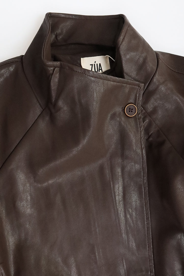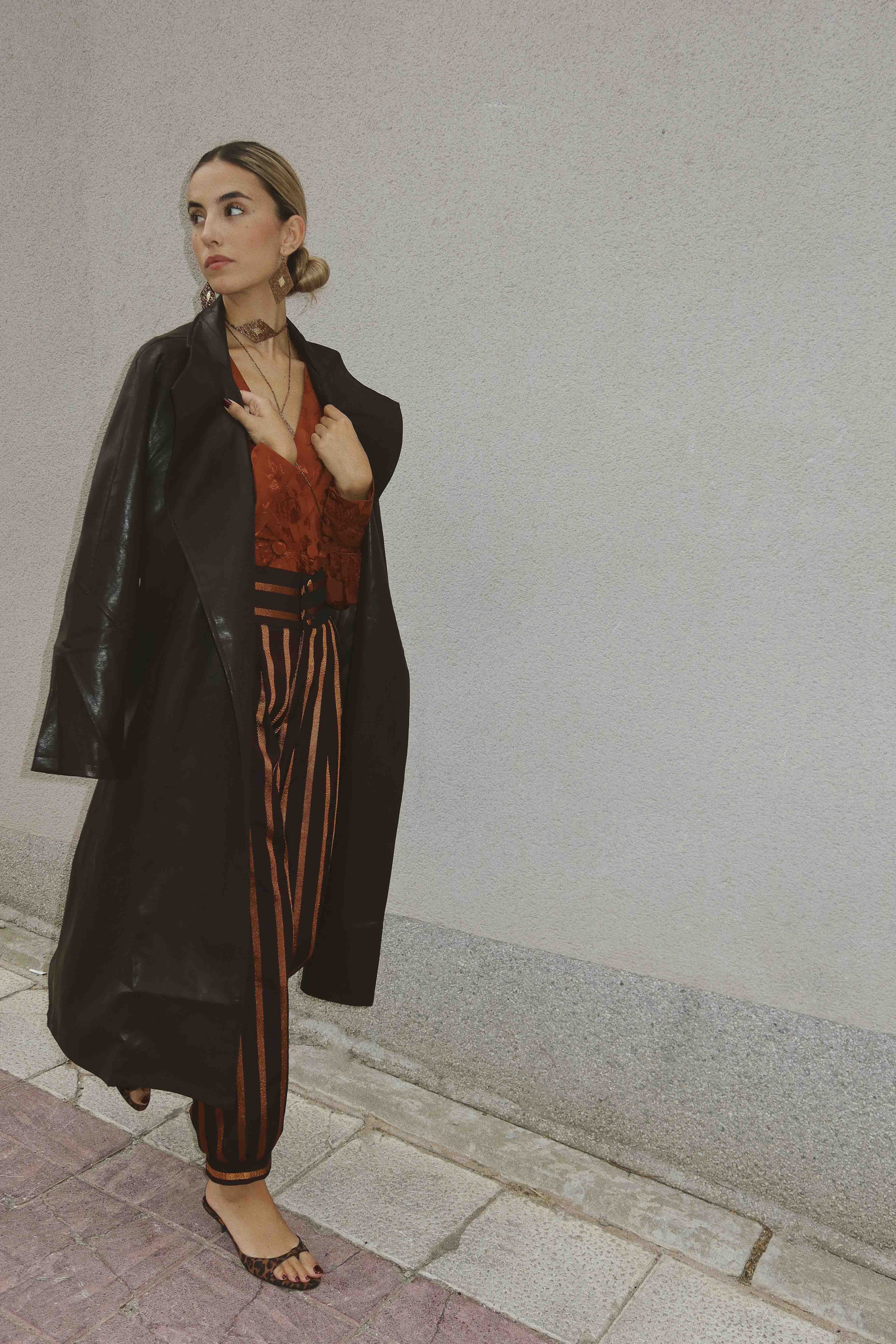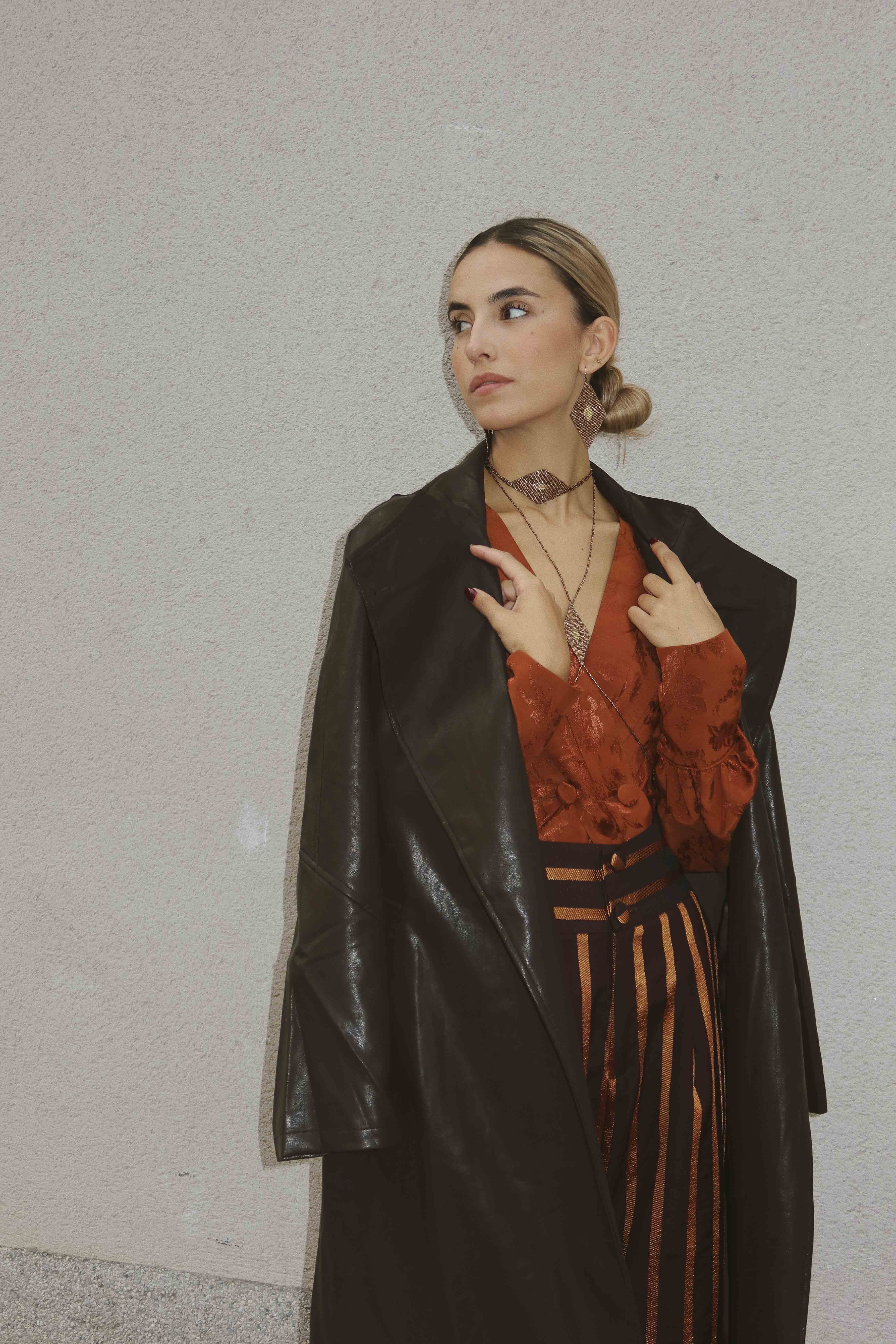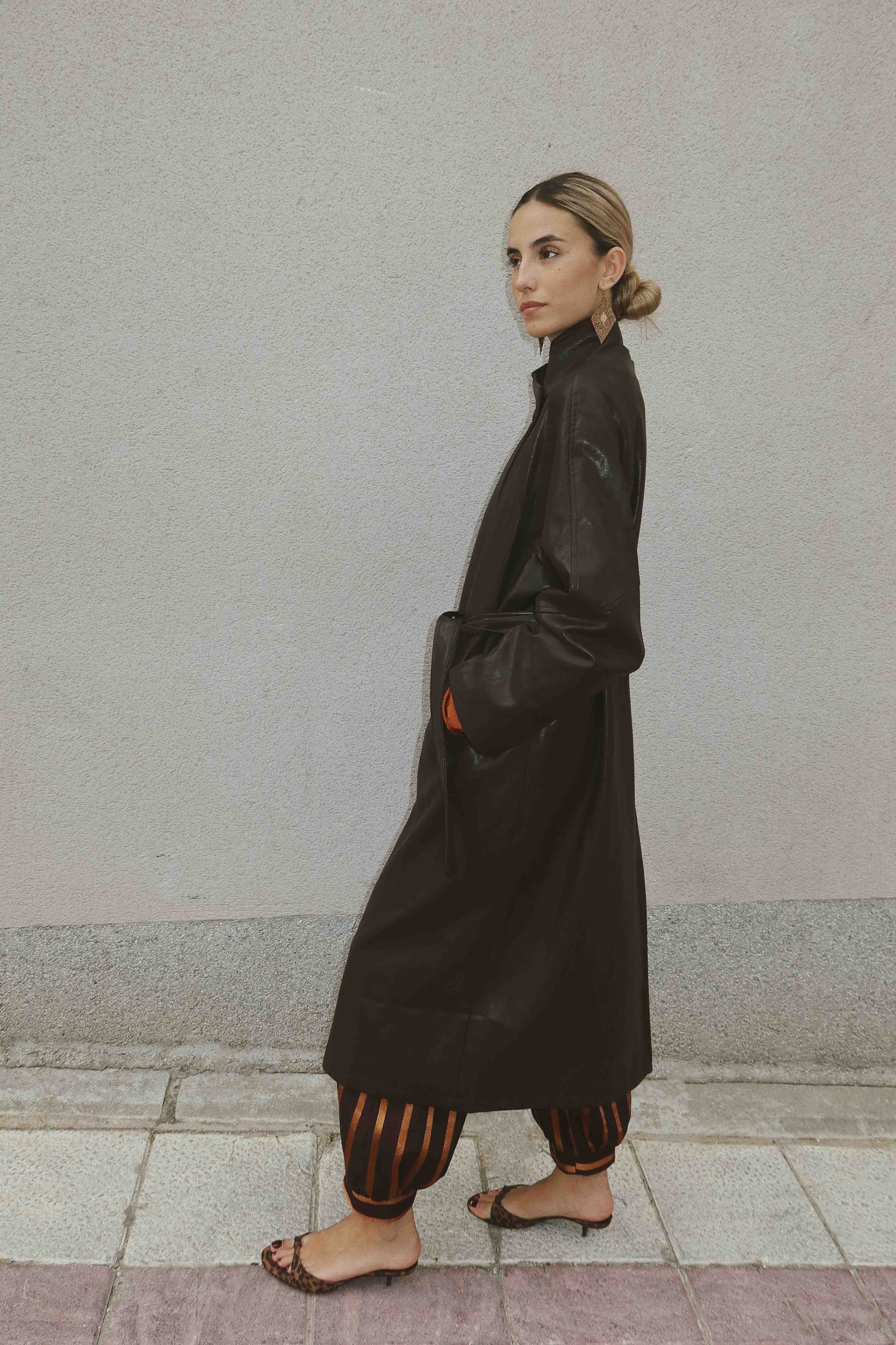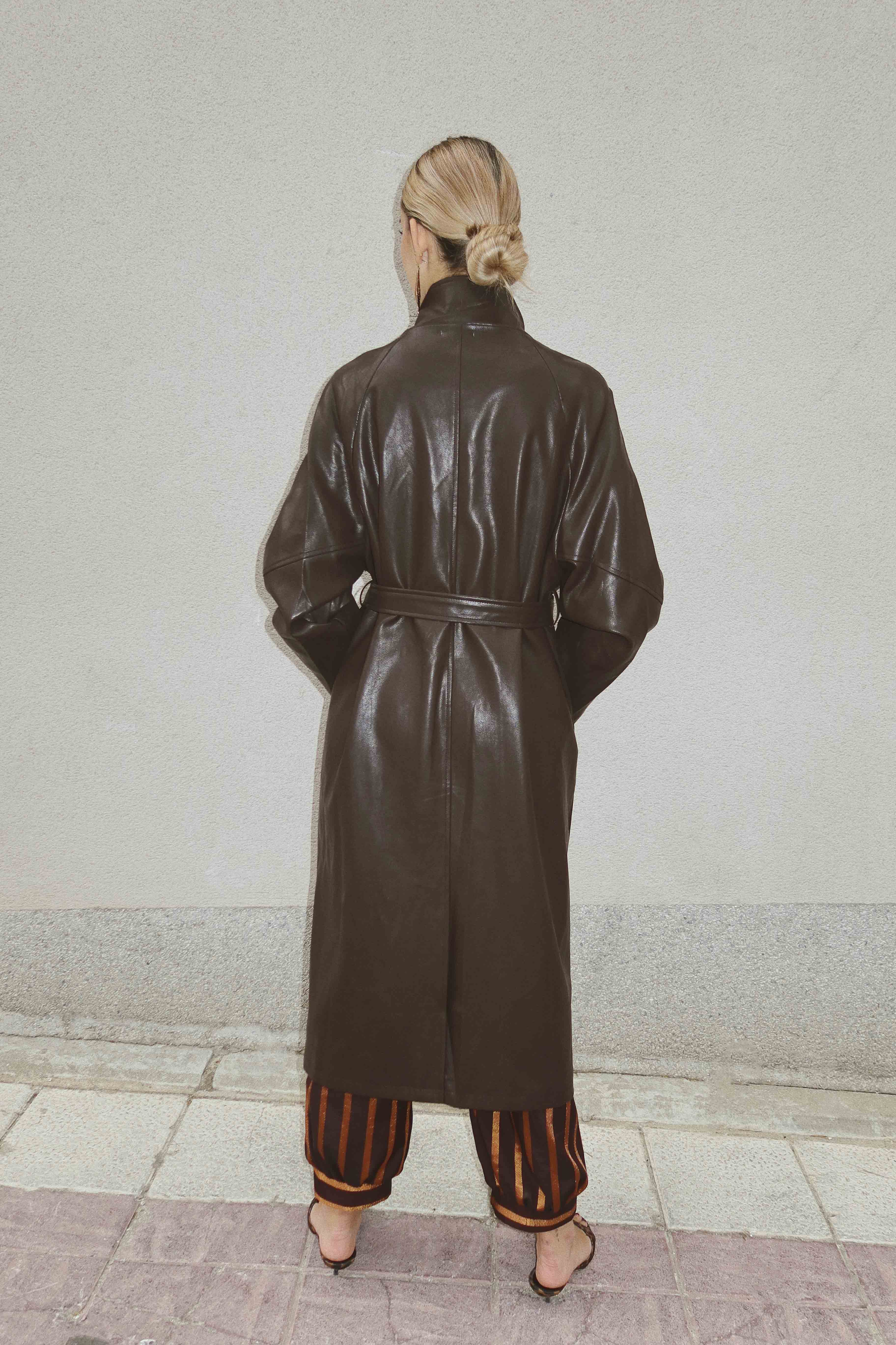 Abrigo largo de cuello con doble posición y manga larga. Bolsillos delanteros. Cierre frontal cruzado con cinturón del mismo tejido.