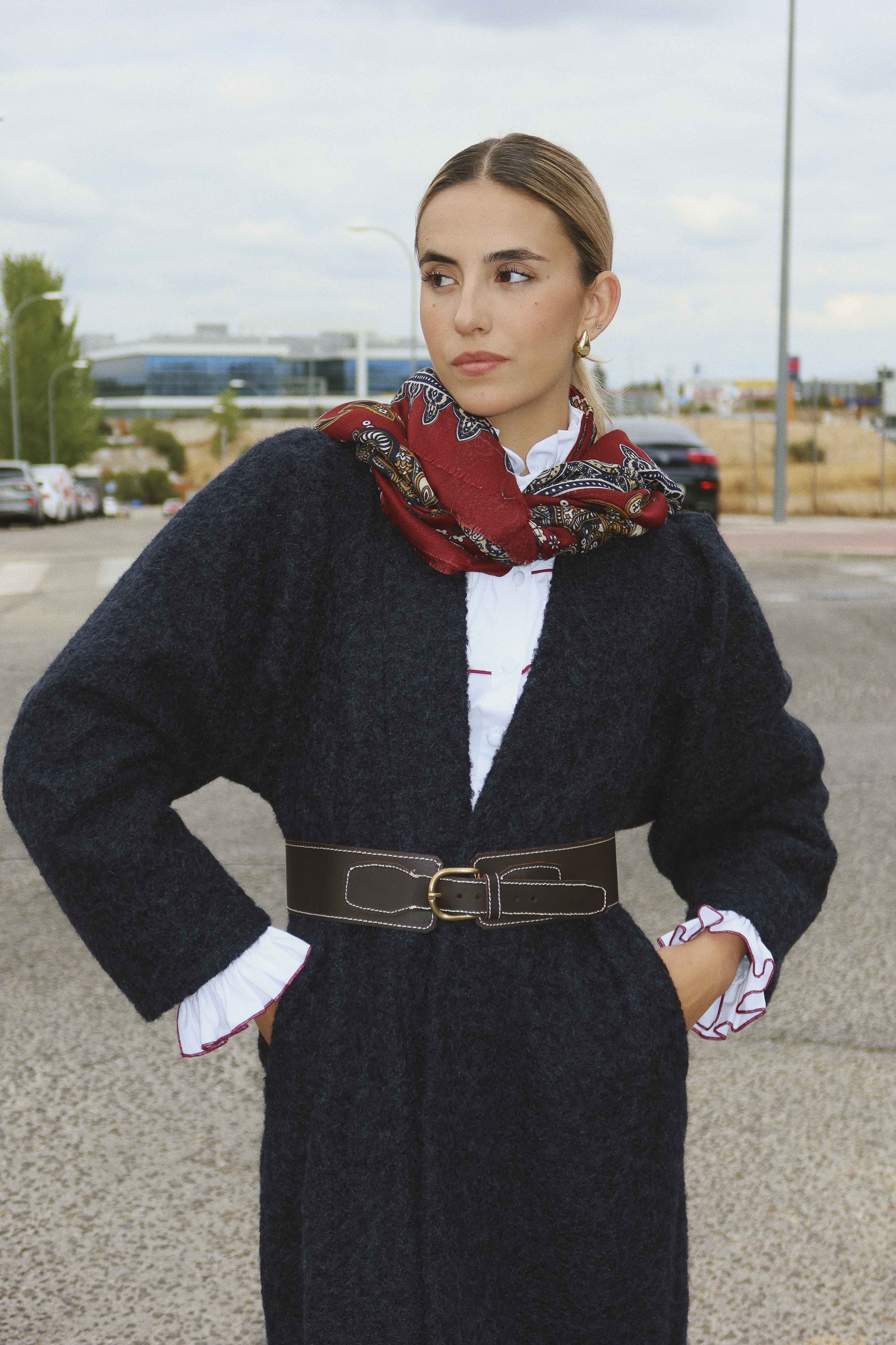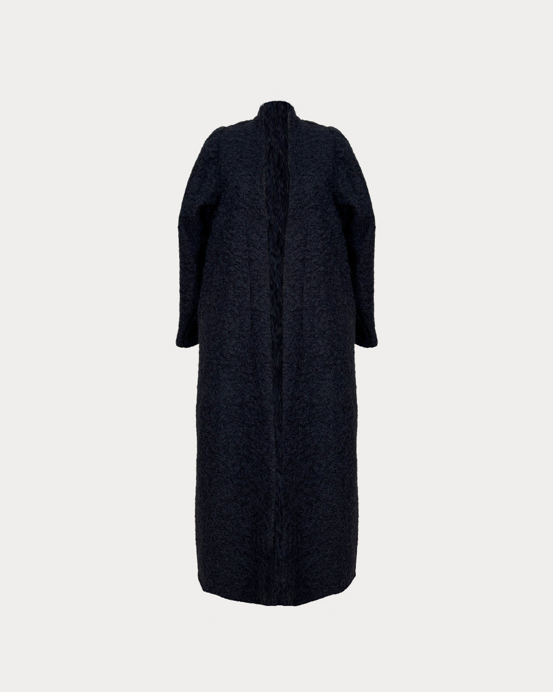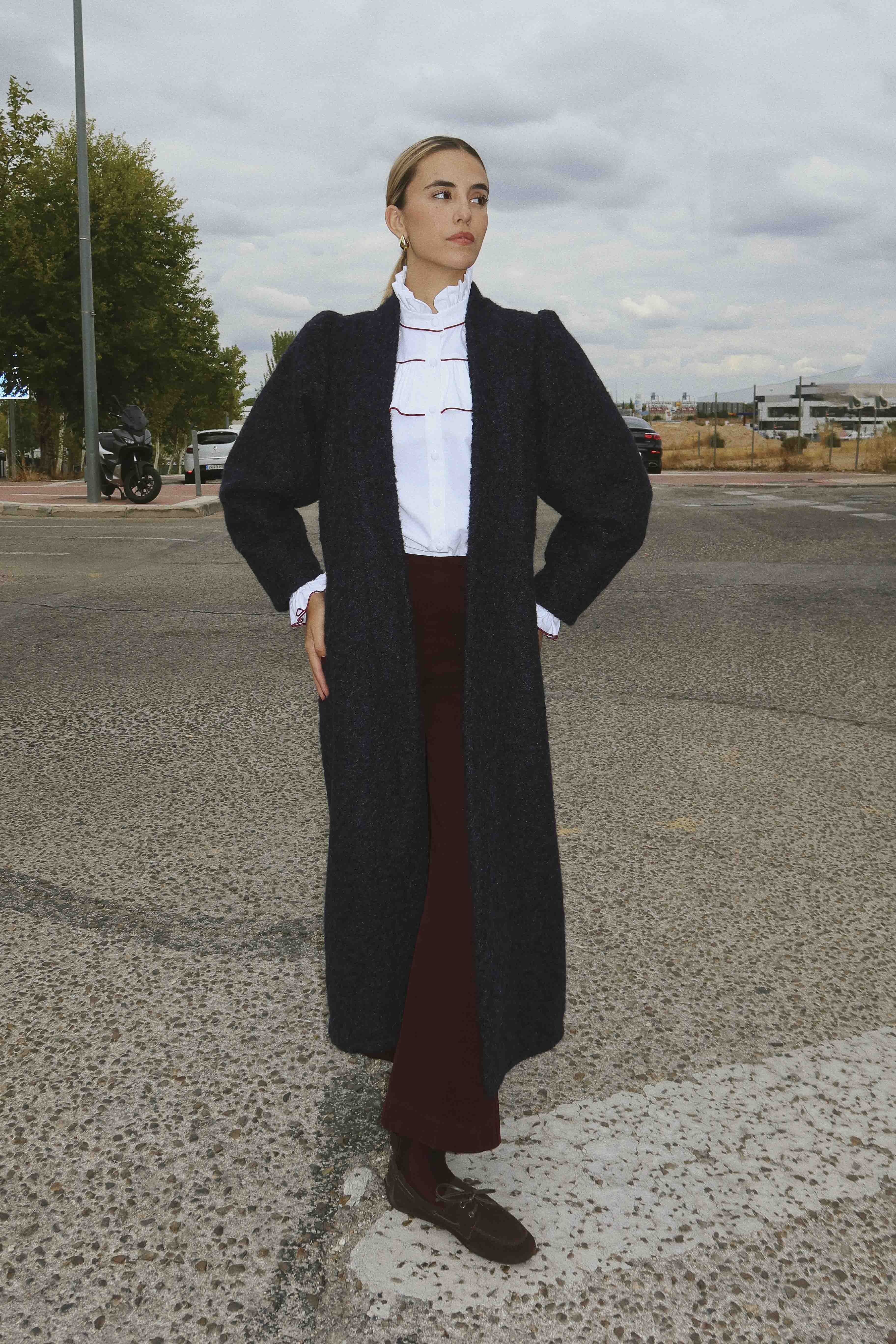Abrigo largo confeccionado en tejido de punto con textura, abierto sin botones. Bolsillos delanteros y discretas aberturas laterales. Manga abullonada.