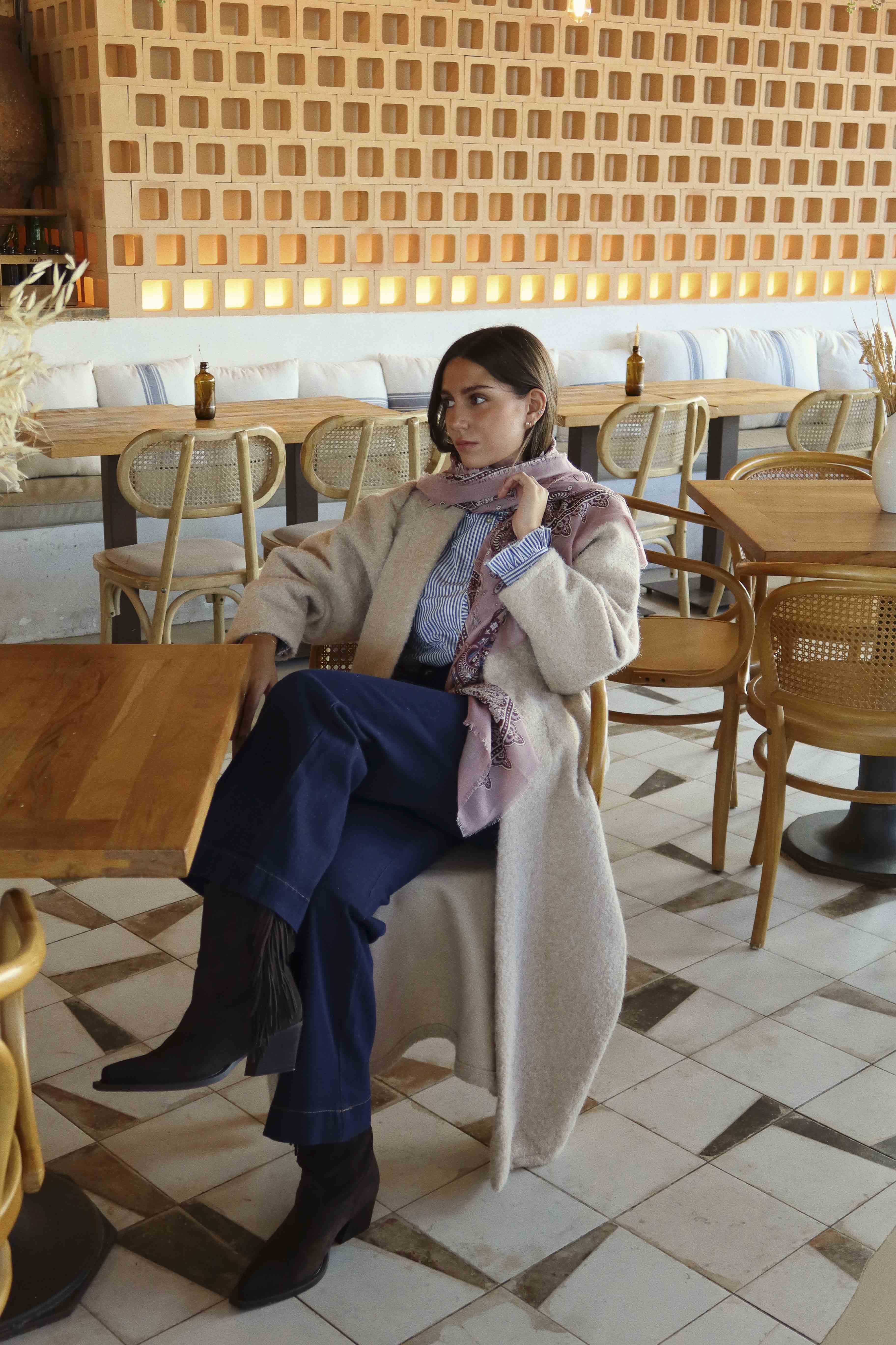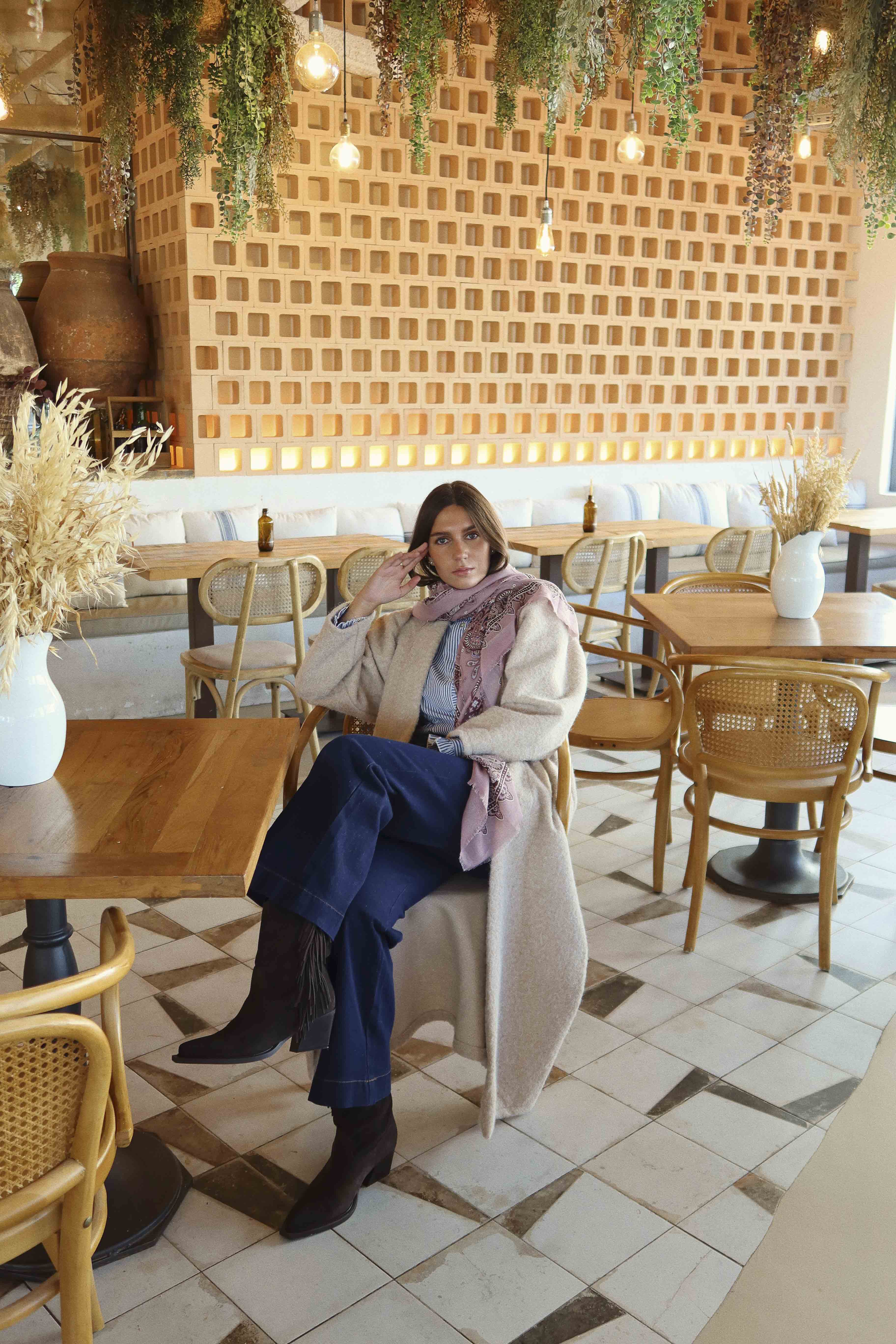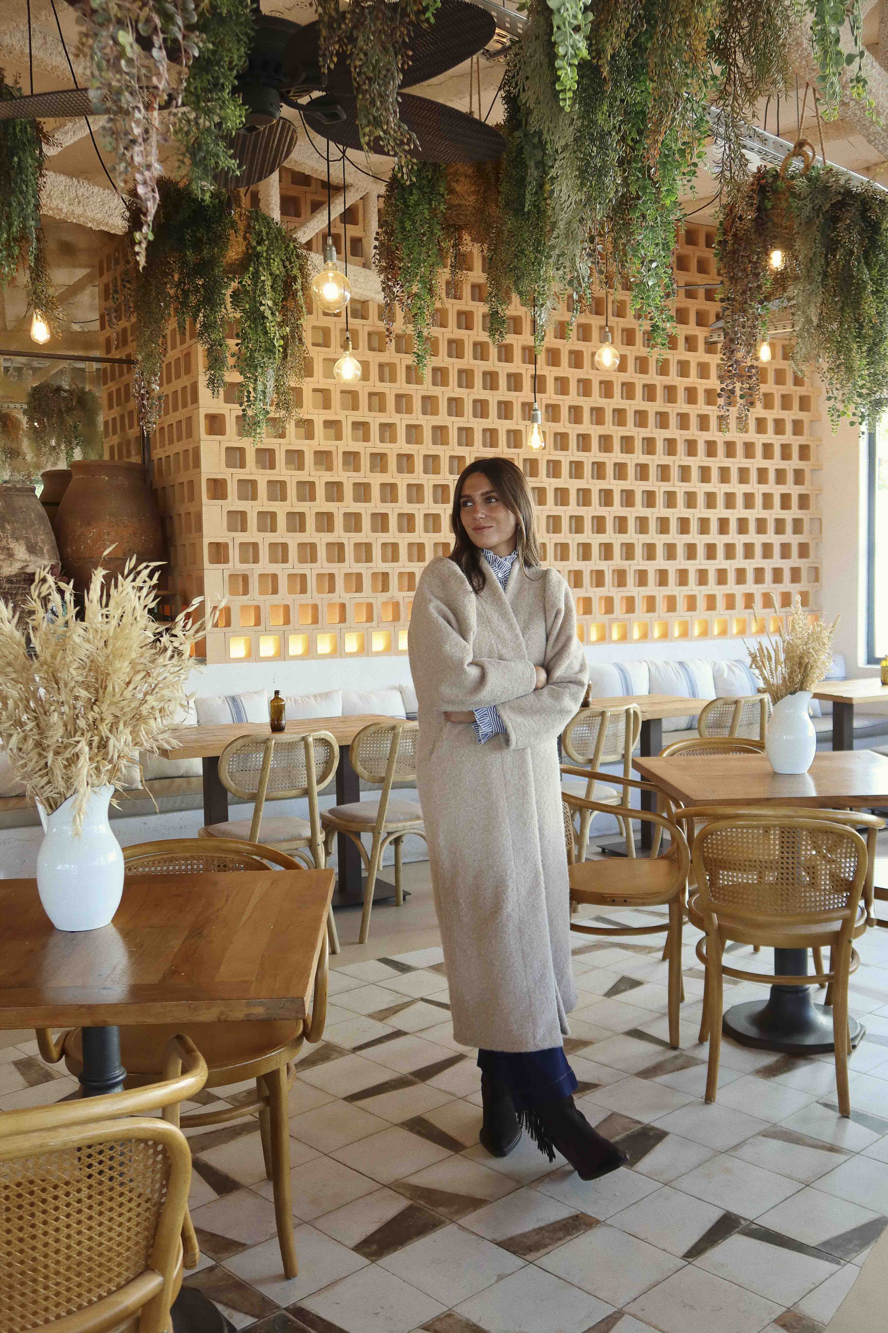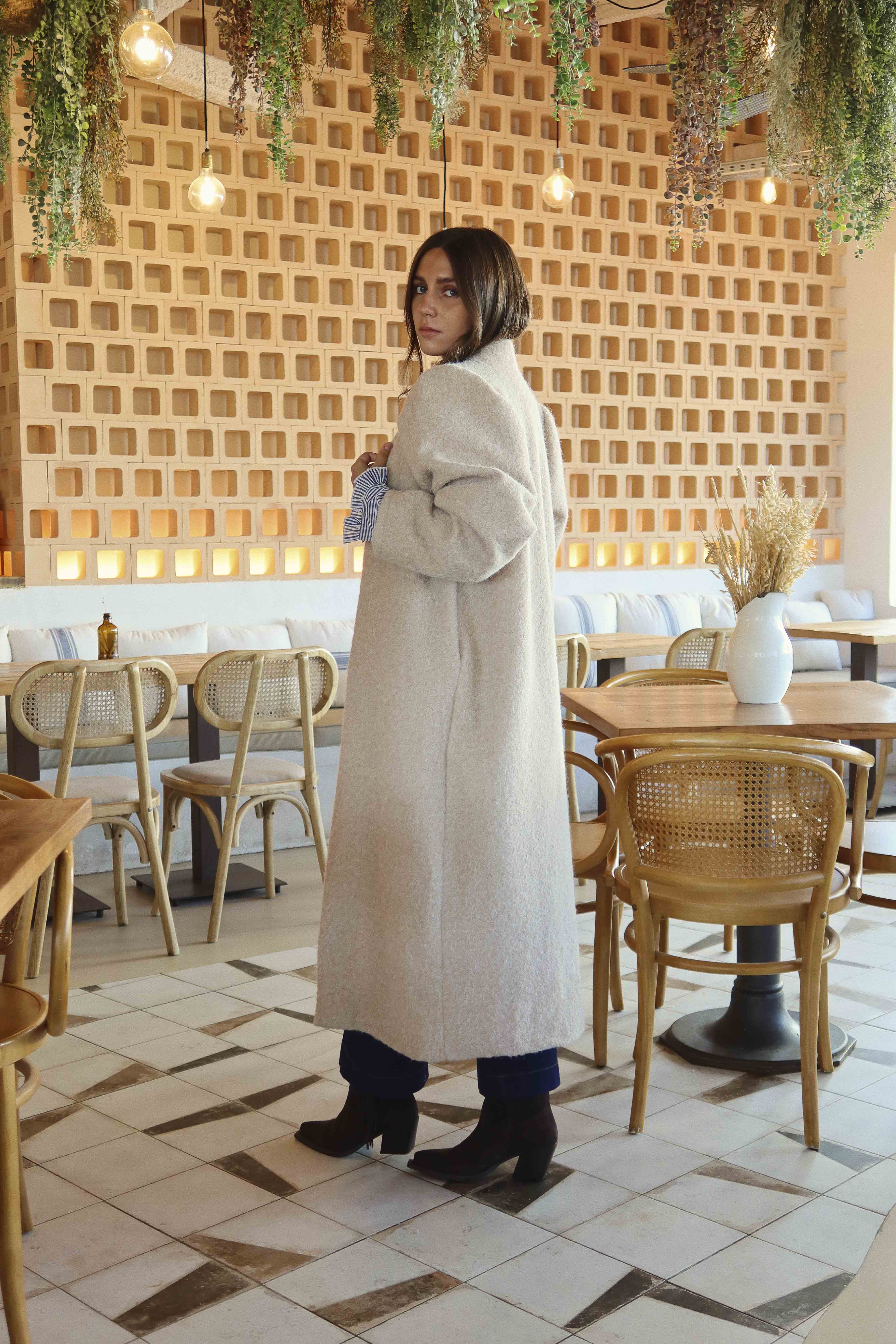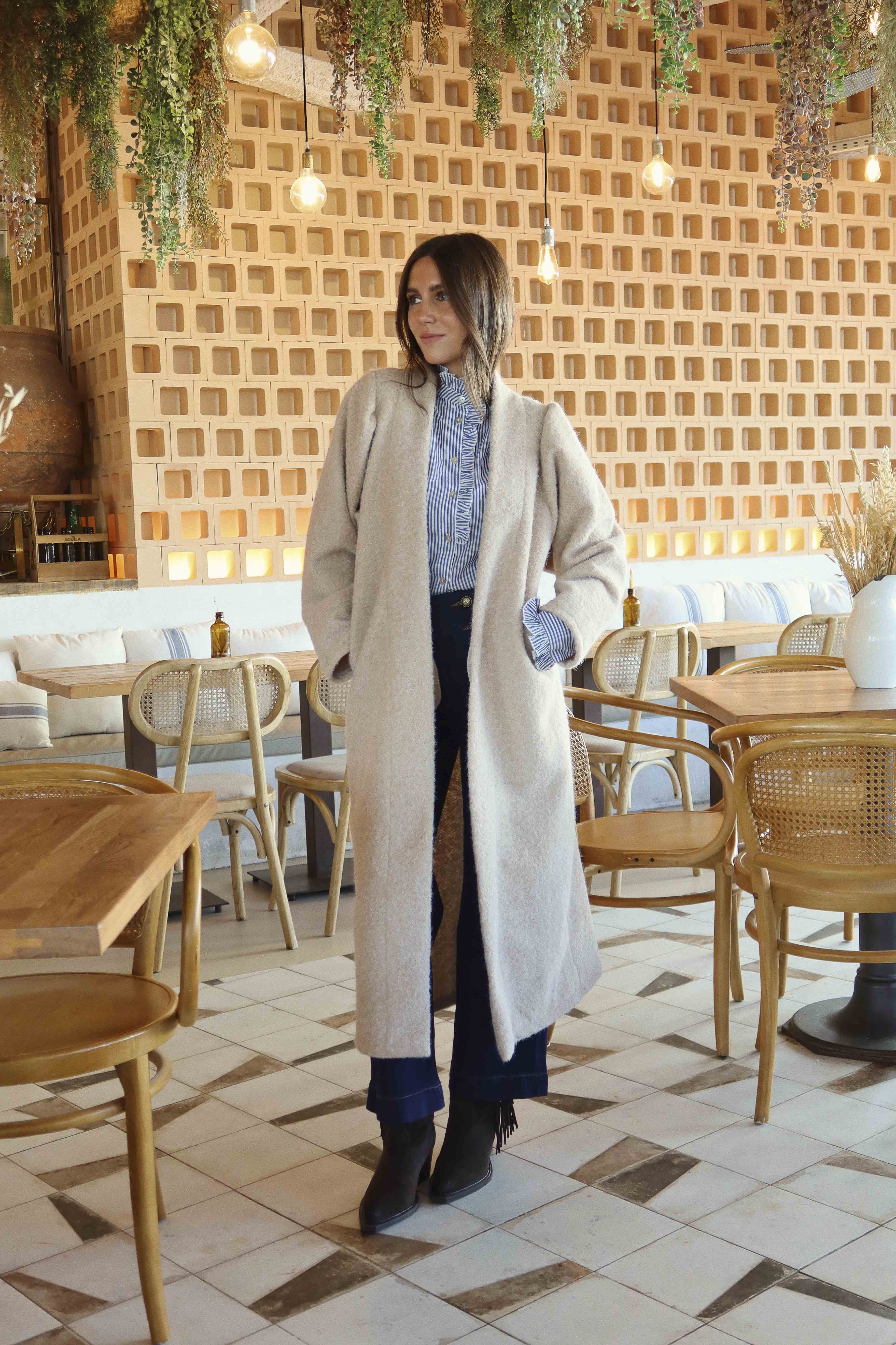Abrigo largo confeccionado en tejido de punto con textura, abierto sin botones. Bolsillos delanteros y discretas aberturas laterales. Manga abullonada.