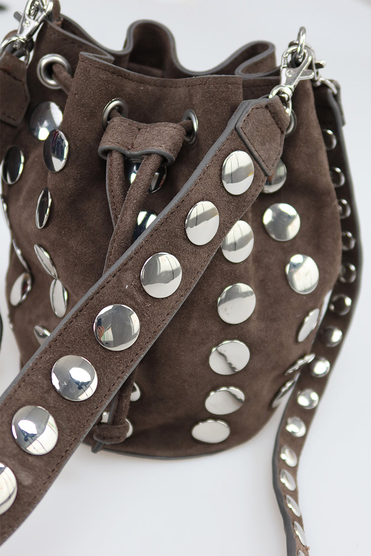 Bolso tipo bombonera de piel decorado con tachuelas plateadas. Forro en su interior.