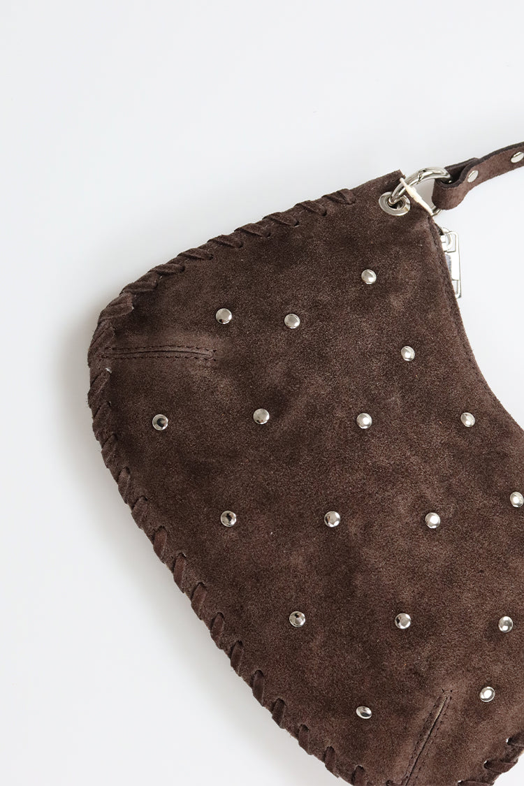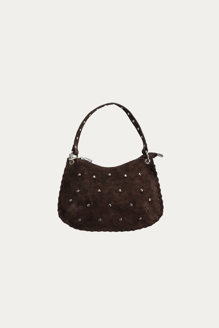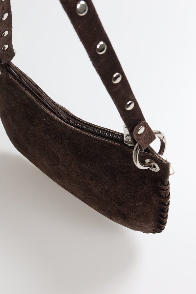 Bolso de piel decorado con tachuelas. Asa corta,37cm, decorada con tachuelas plateadas. Incluye un asa más larga 108 cm. Forro en su interior, bolsillo interior con cremallera.
