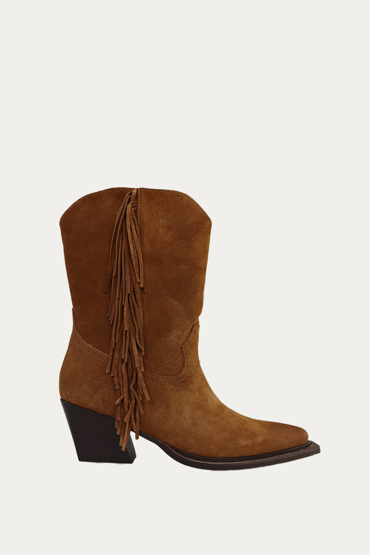 Botas de piel con tacón y detalles de flecos.