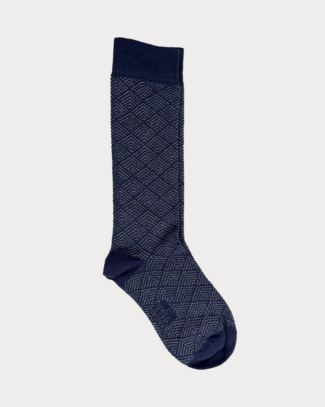 Calcetines de vestir azul marino con patrón de rombos entrelazados, ideales para un estilo elegante y moderno.