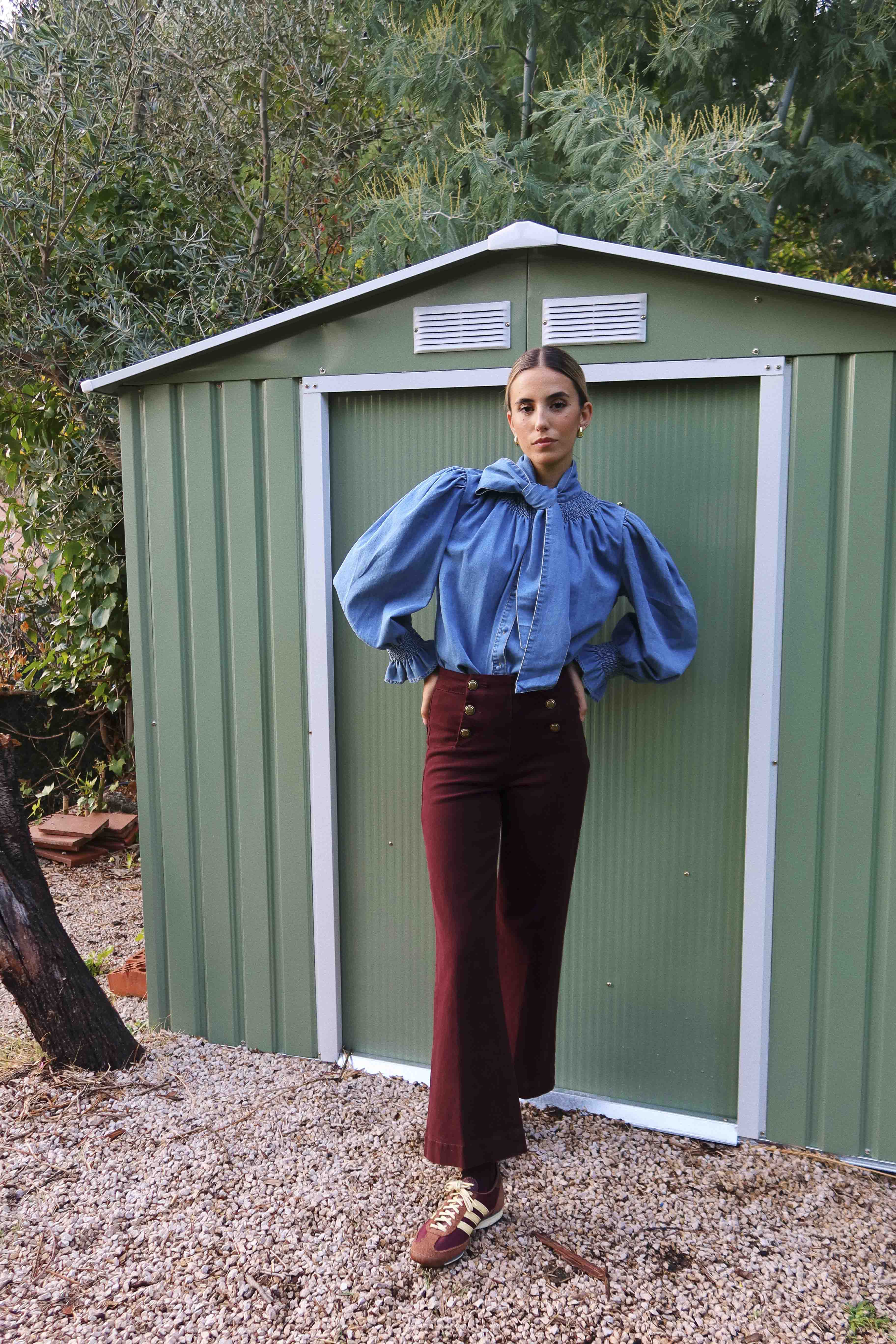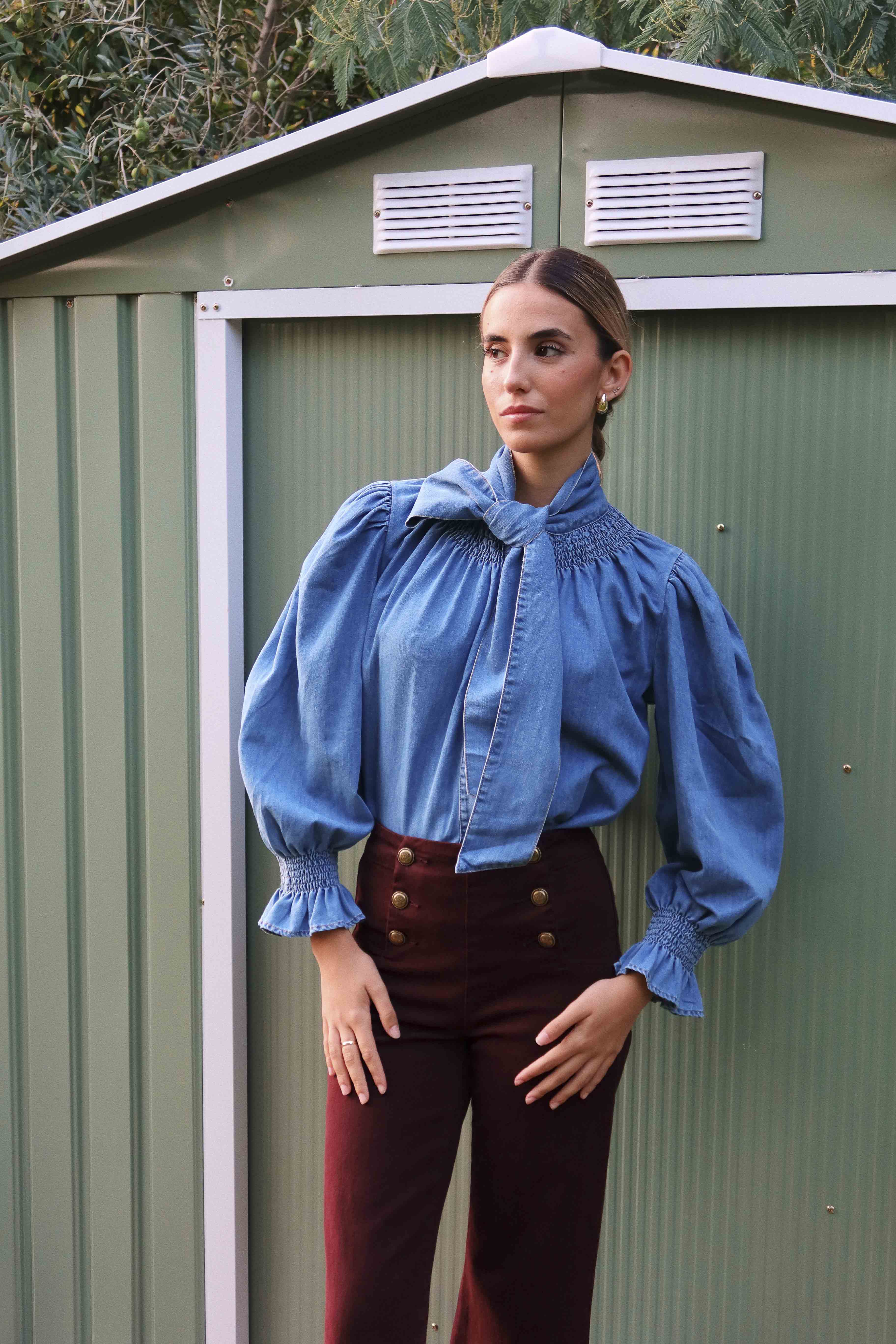 Camisa vaquera de algodón con cuello de volante y lazo, puños elásticos y cierre delantero con botones.