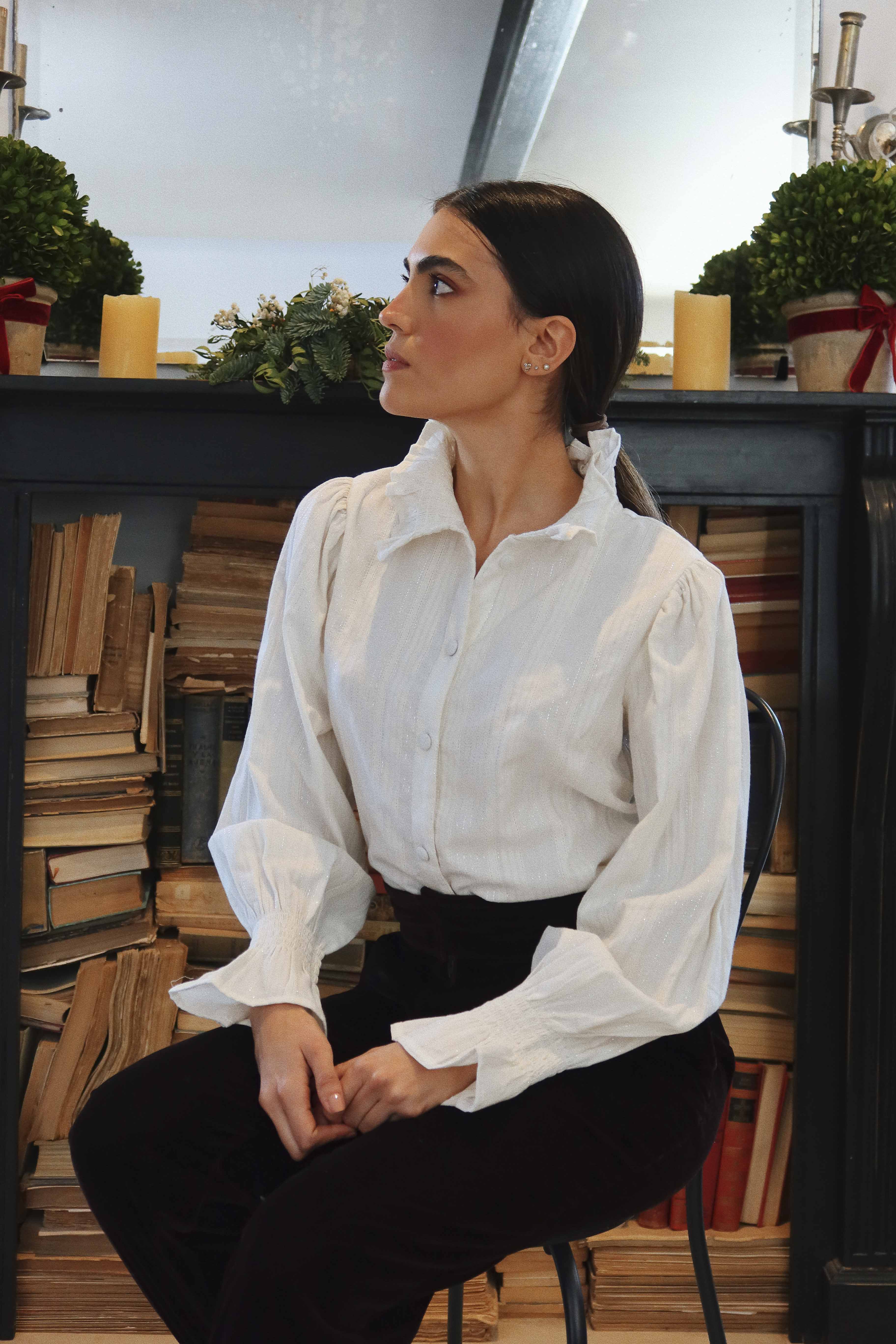 Camisa de manga larga, con cuello alto de volantes, cierre delantero con botones forrados, puños elásticos. Forro en su interior.