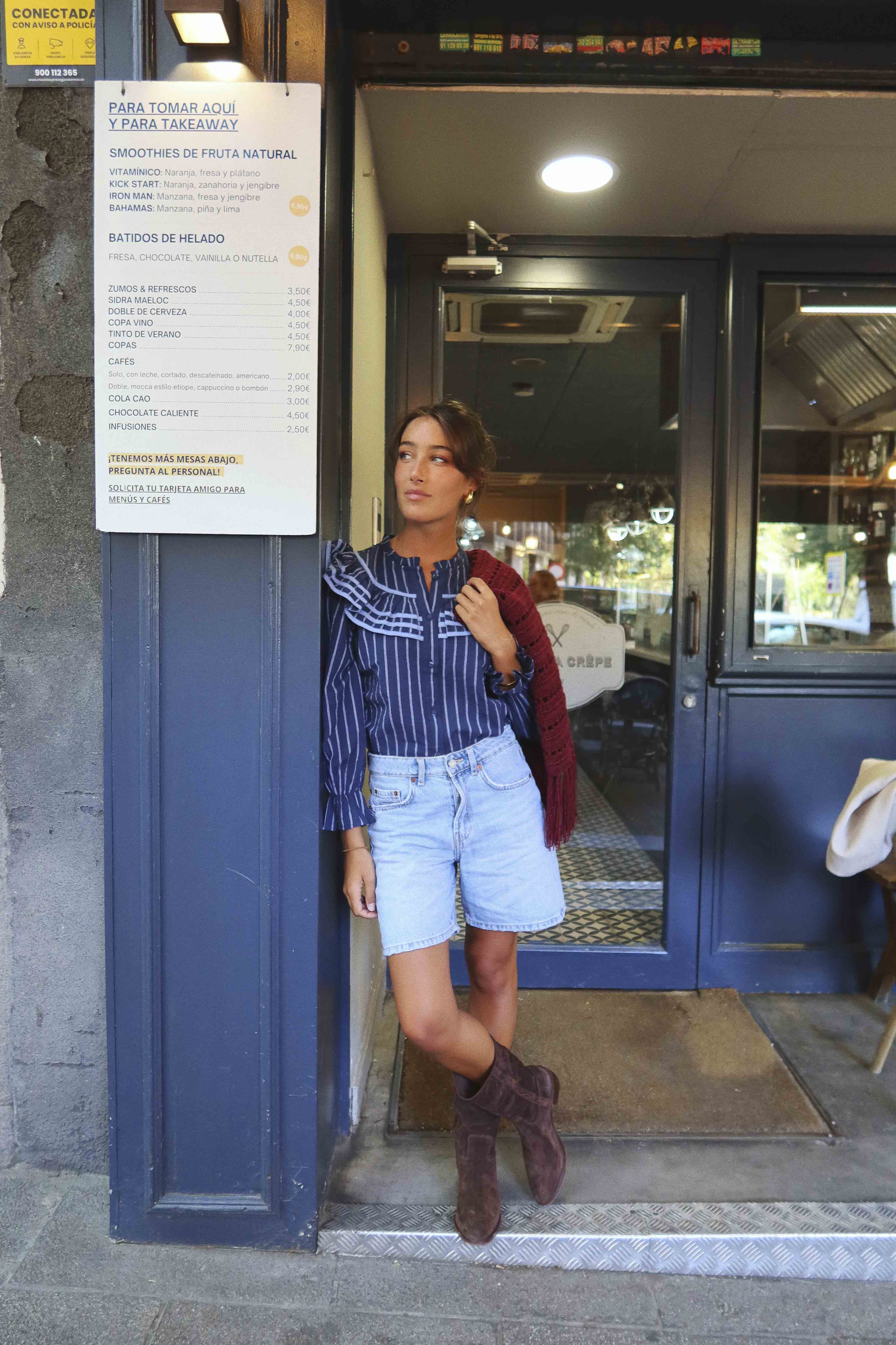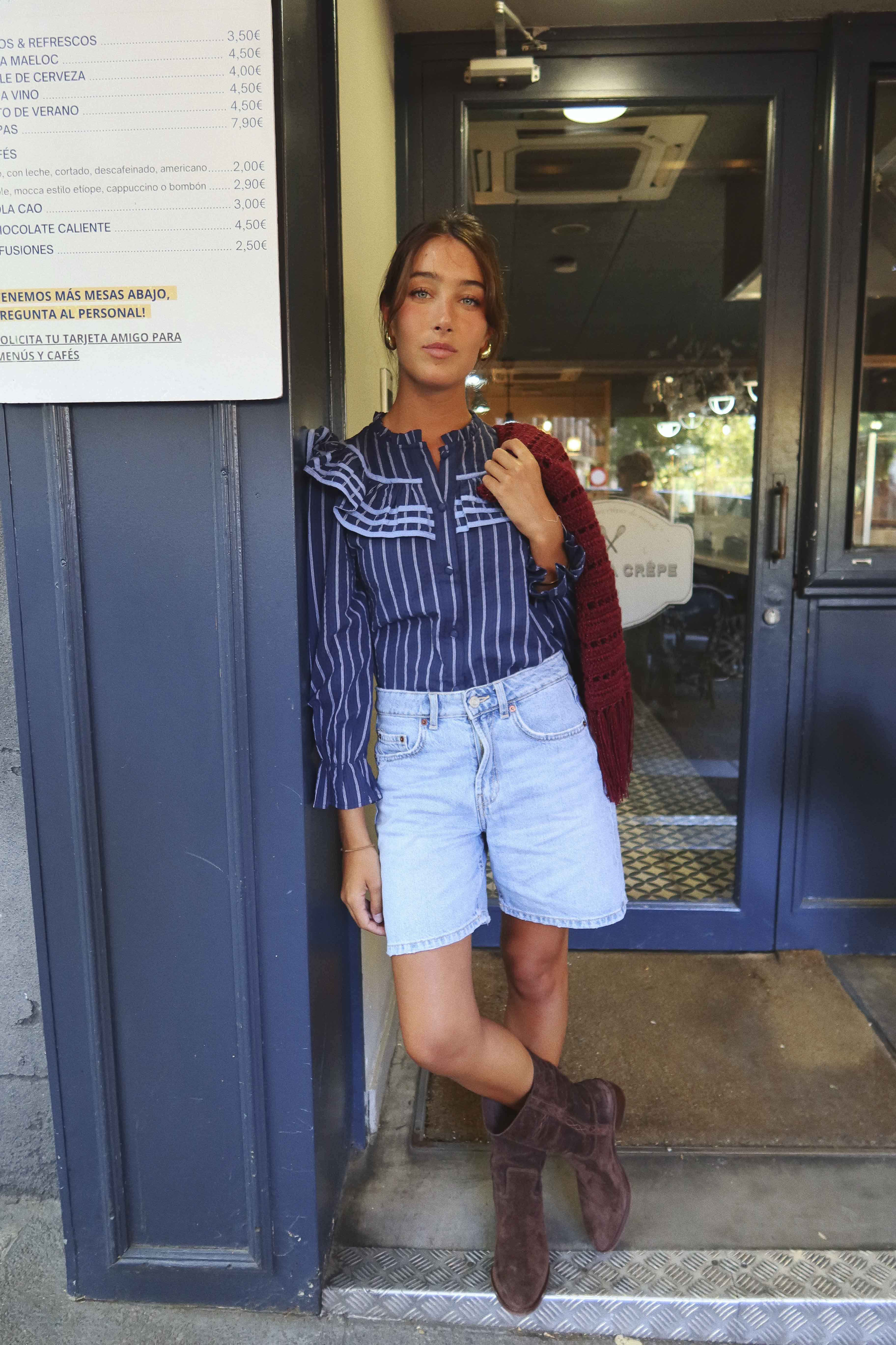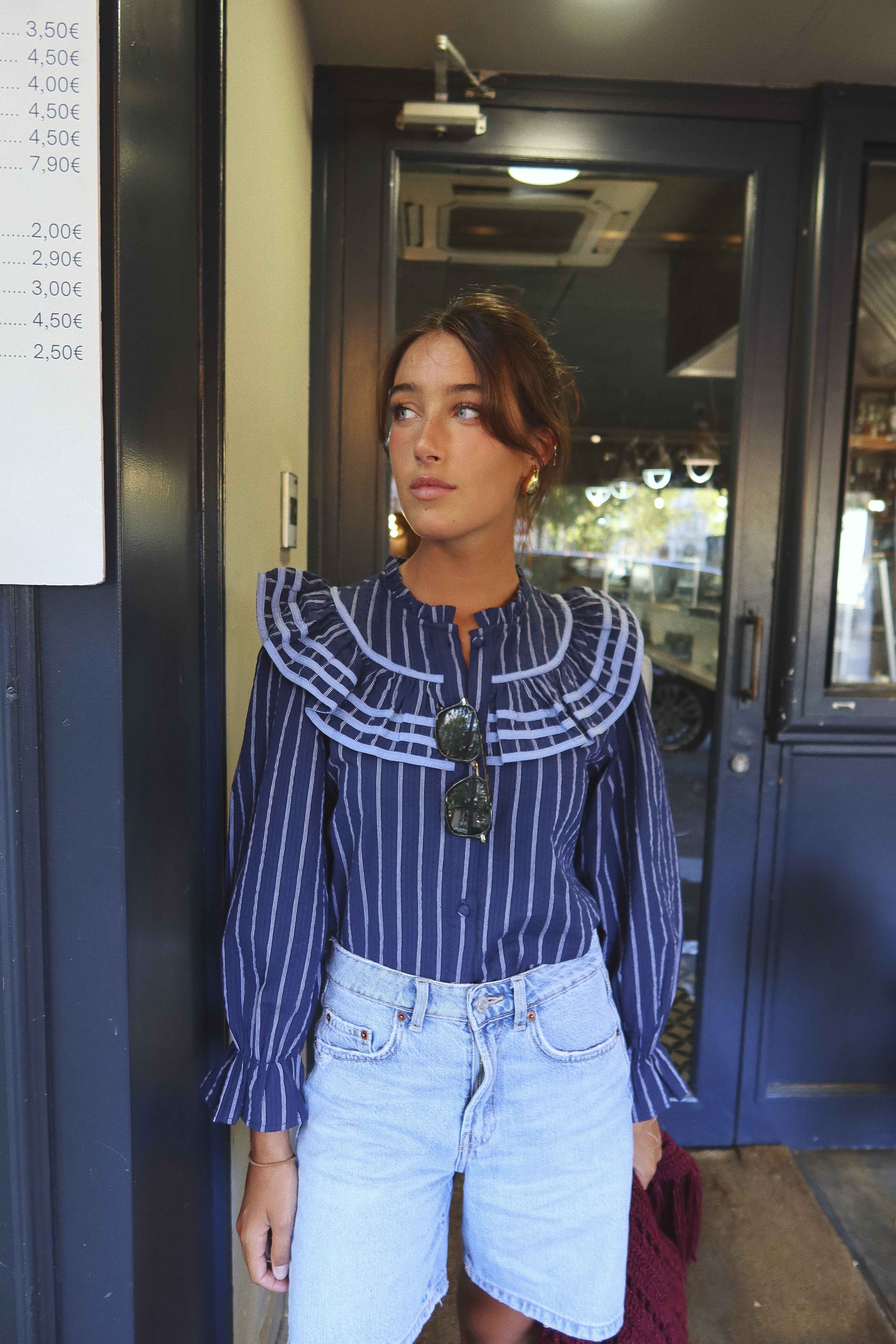 Camisa de manga larga, decorada con volantes y bordados, cierre delantero con botones, puño con elástico.