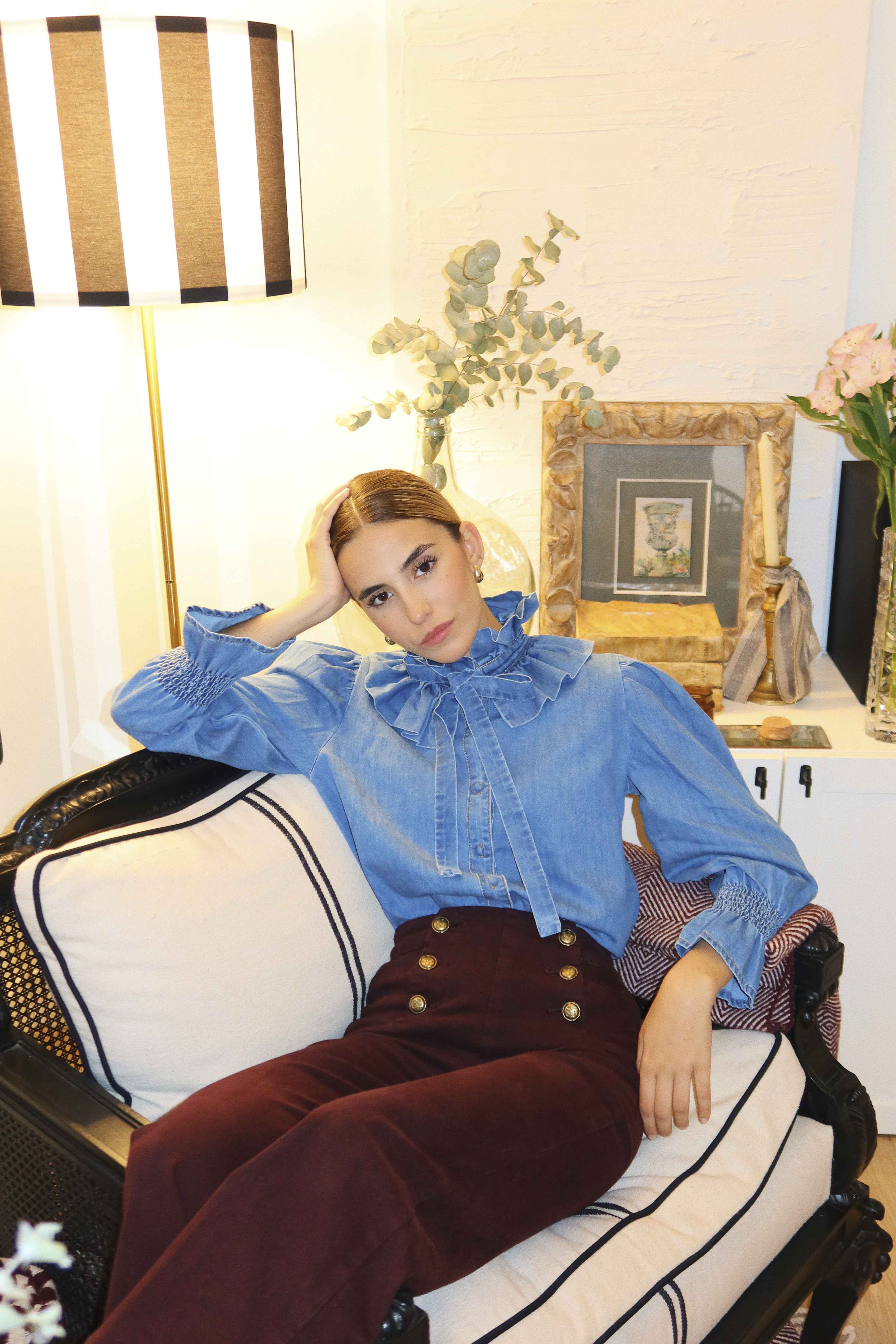 Camisa vaquera de algodón, con cierre delantero con botones, puños fruncidos y detalle en el cuello con lazo.