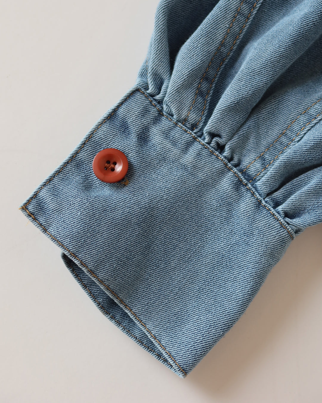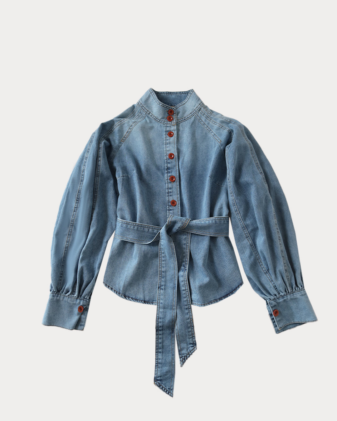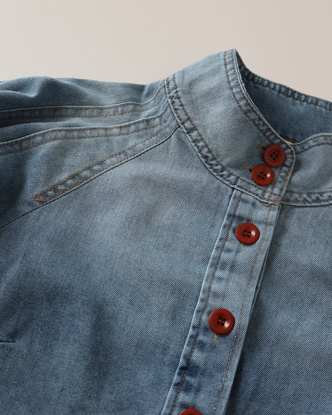 Camisa vaquera de algodón con cierre delantero con botones, manga abullonada, detalle costuras y cinturón.