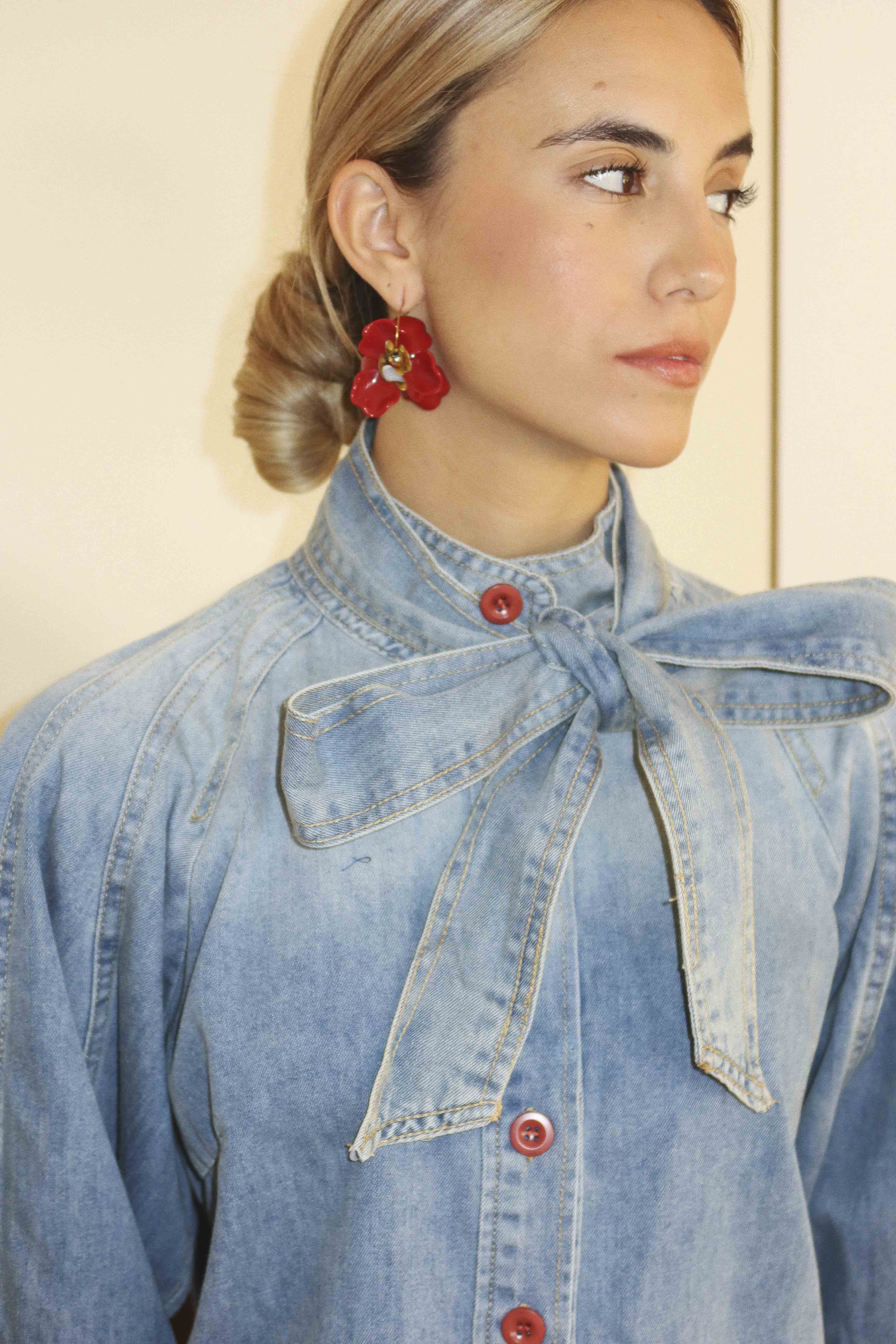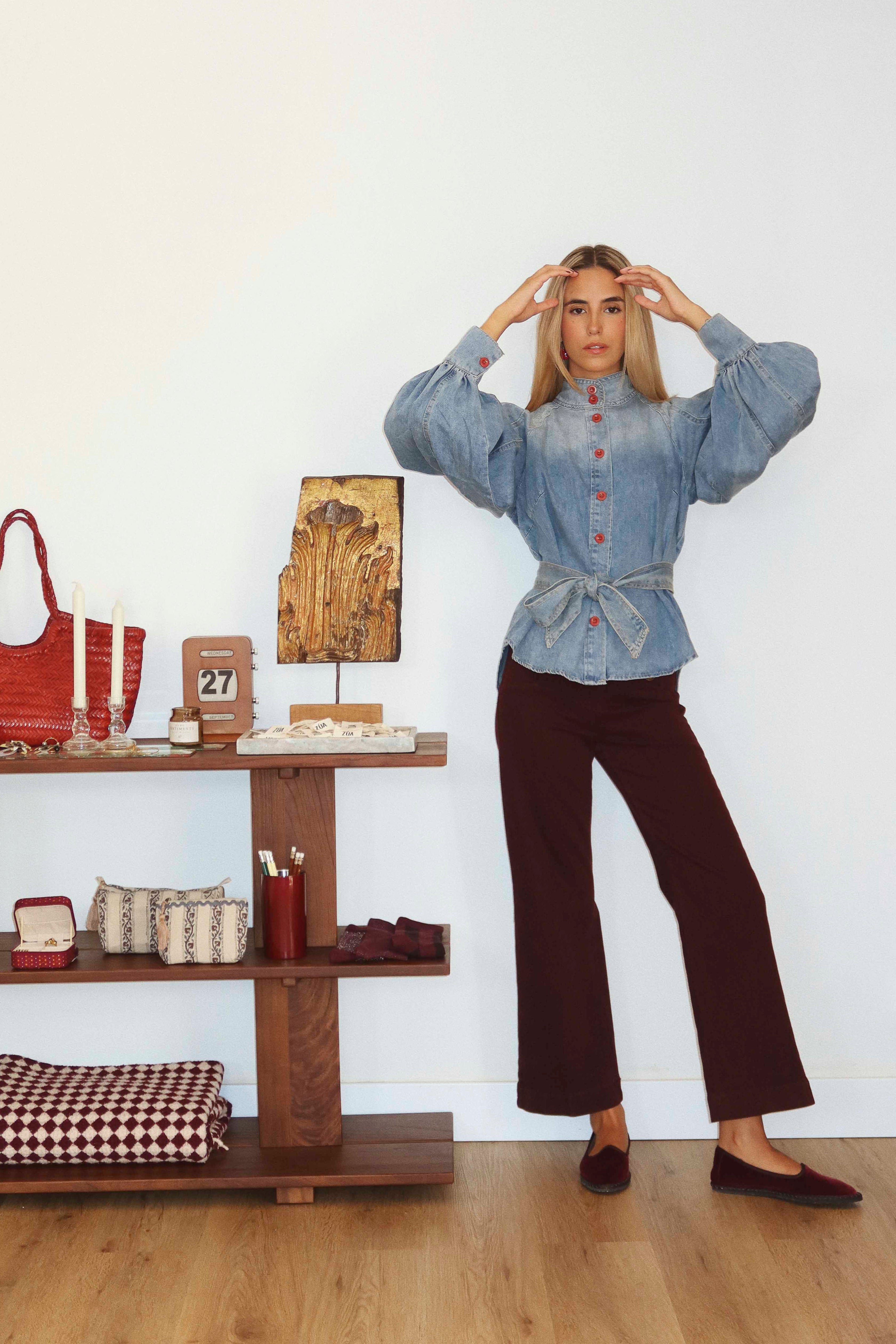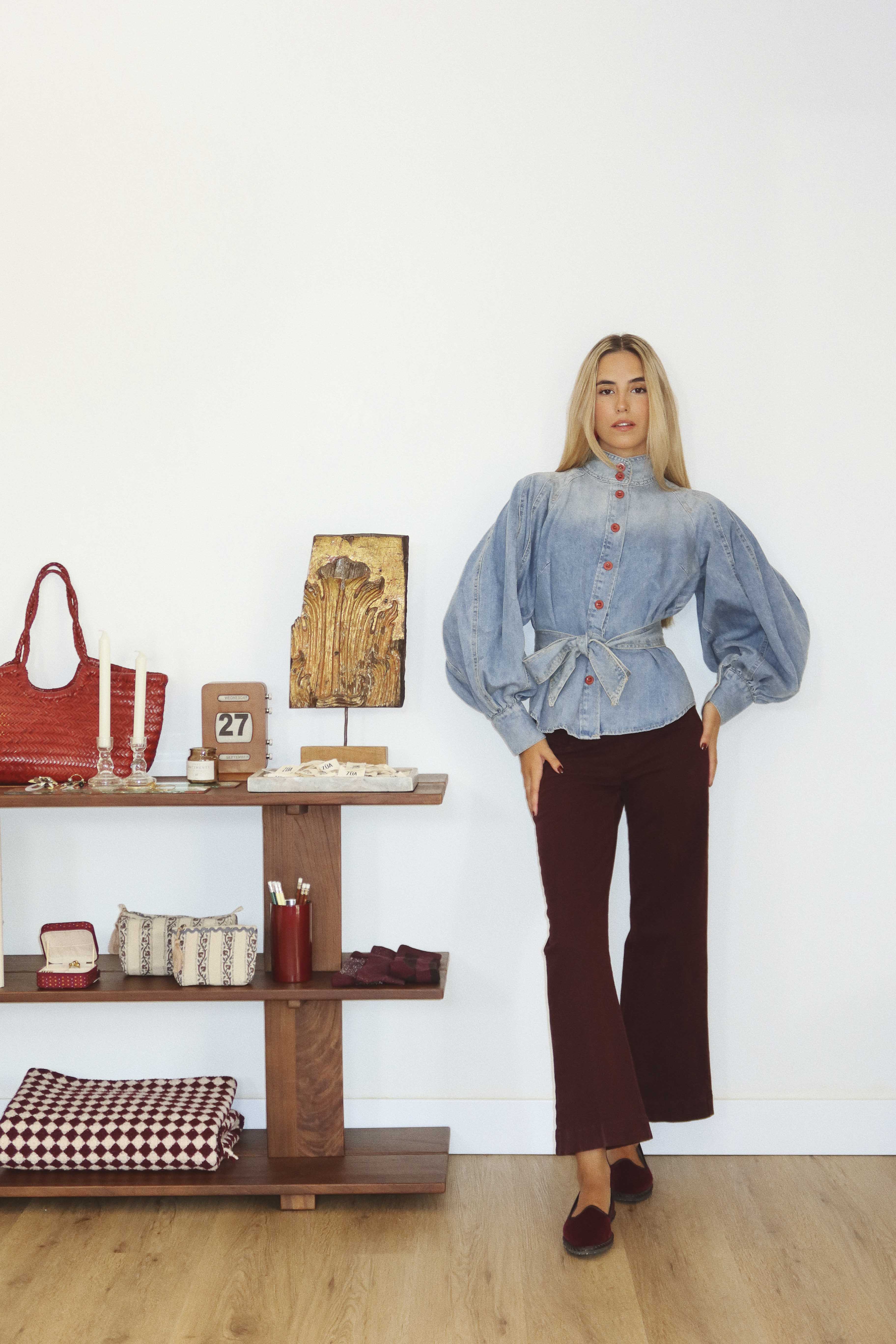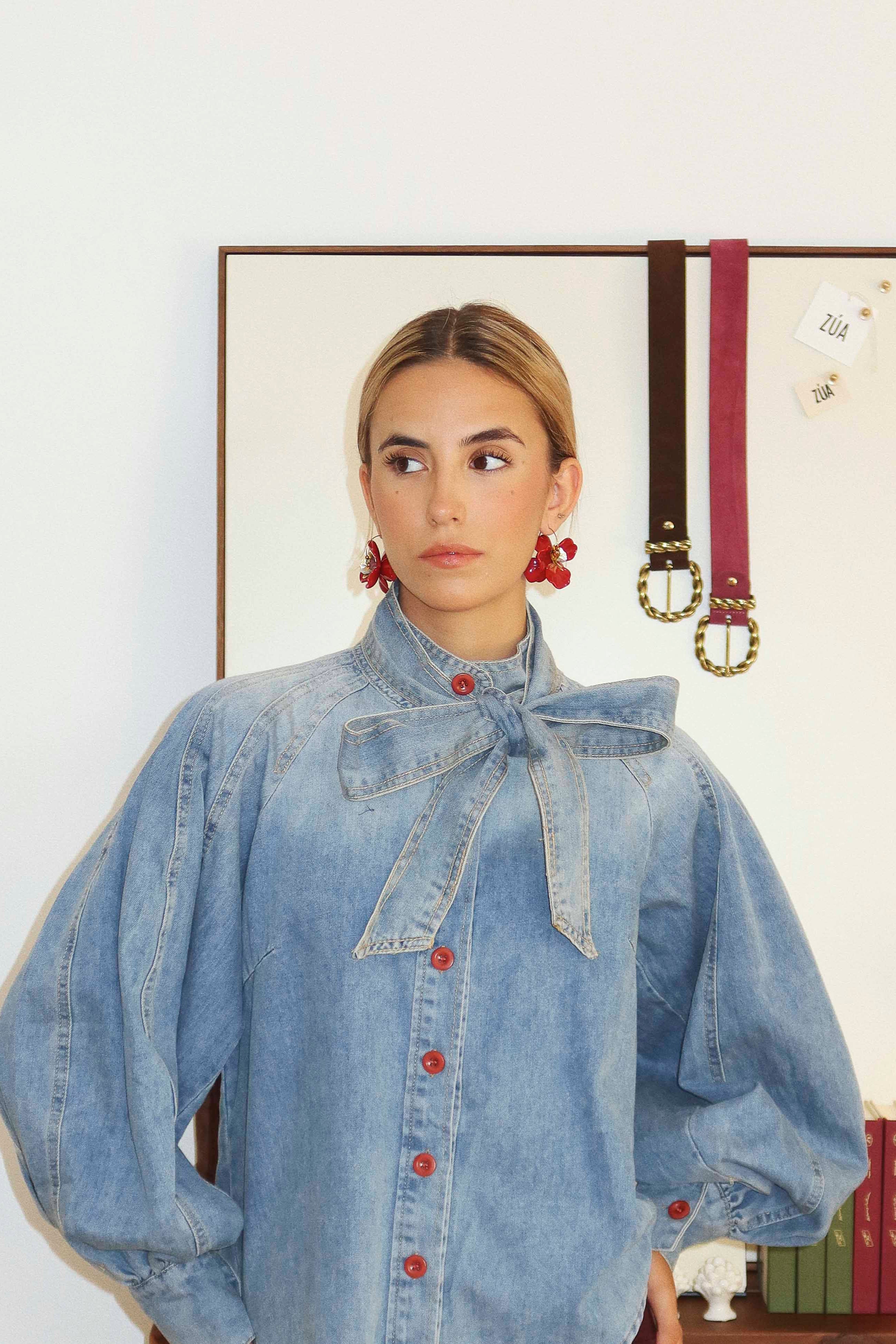Camisa vaquera de algodón con cierre delantero con botones, manga abullonada, detalle costuras y cinturón.