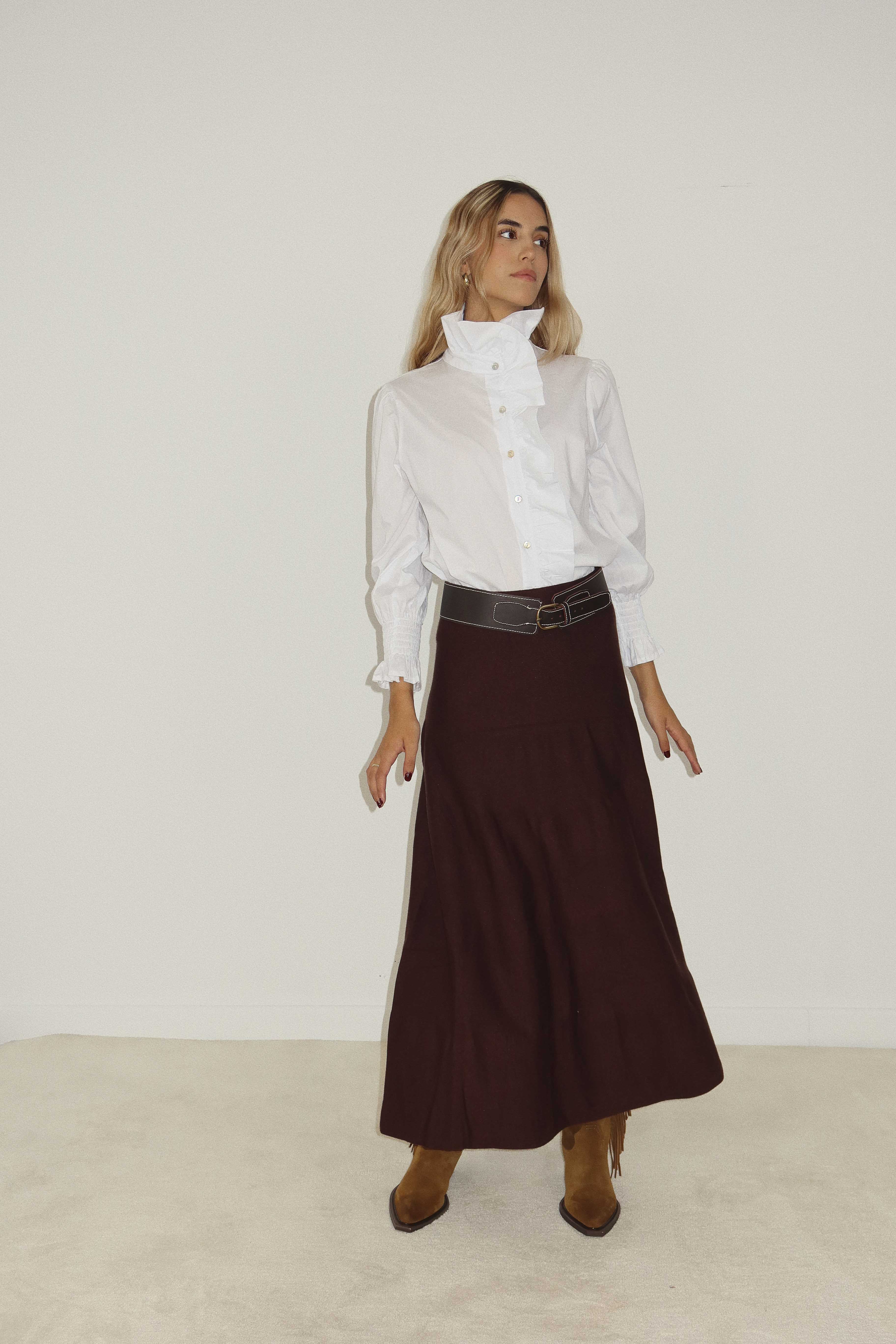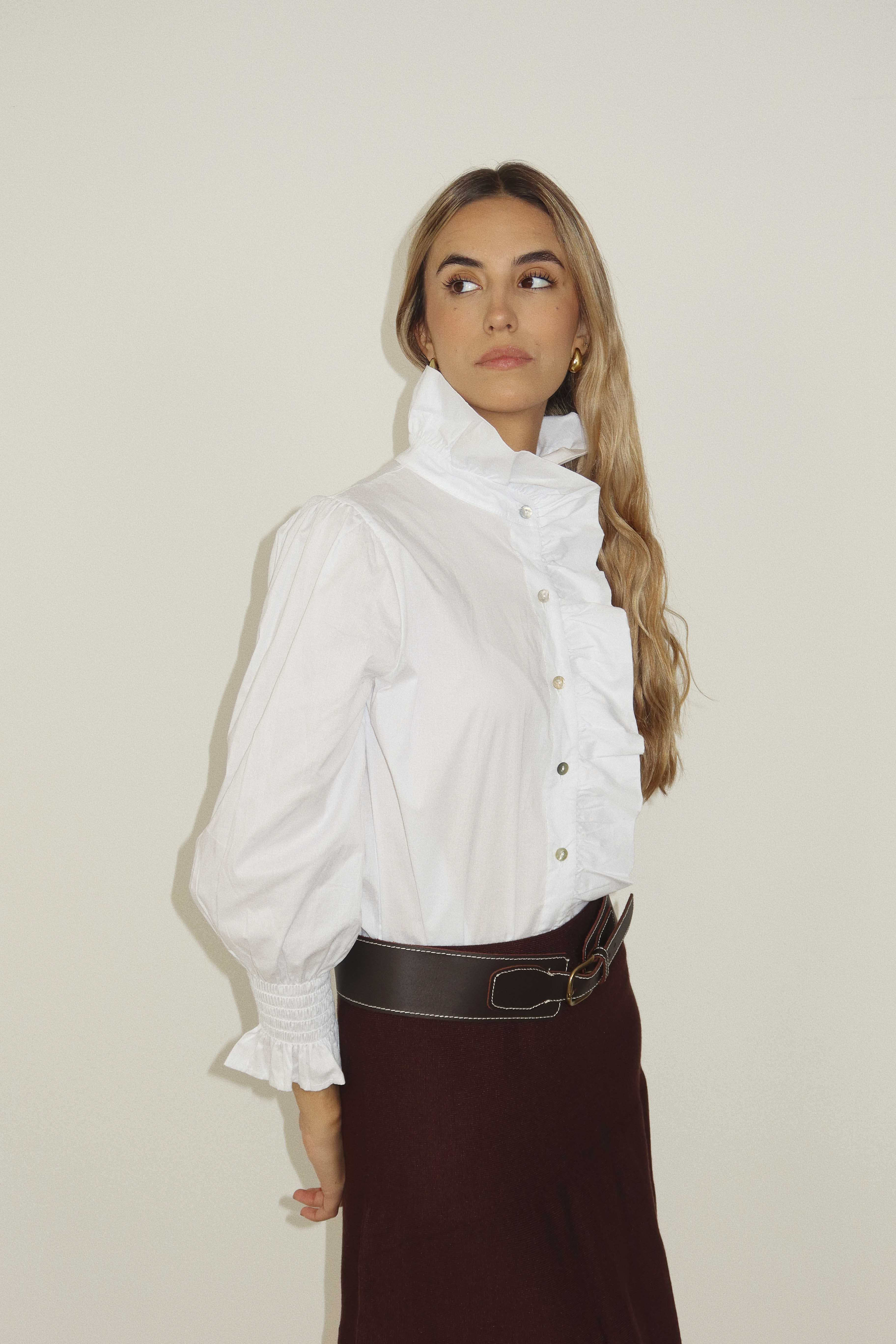 Camisa con cuello de volante, puños elásticos y cierre delantero con botones.