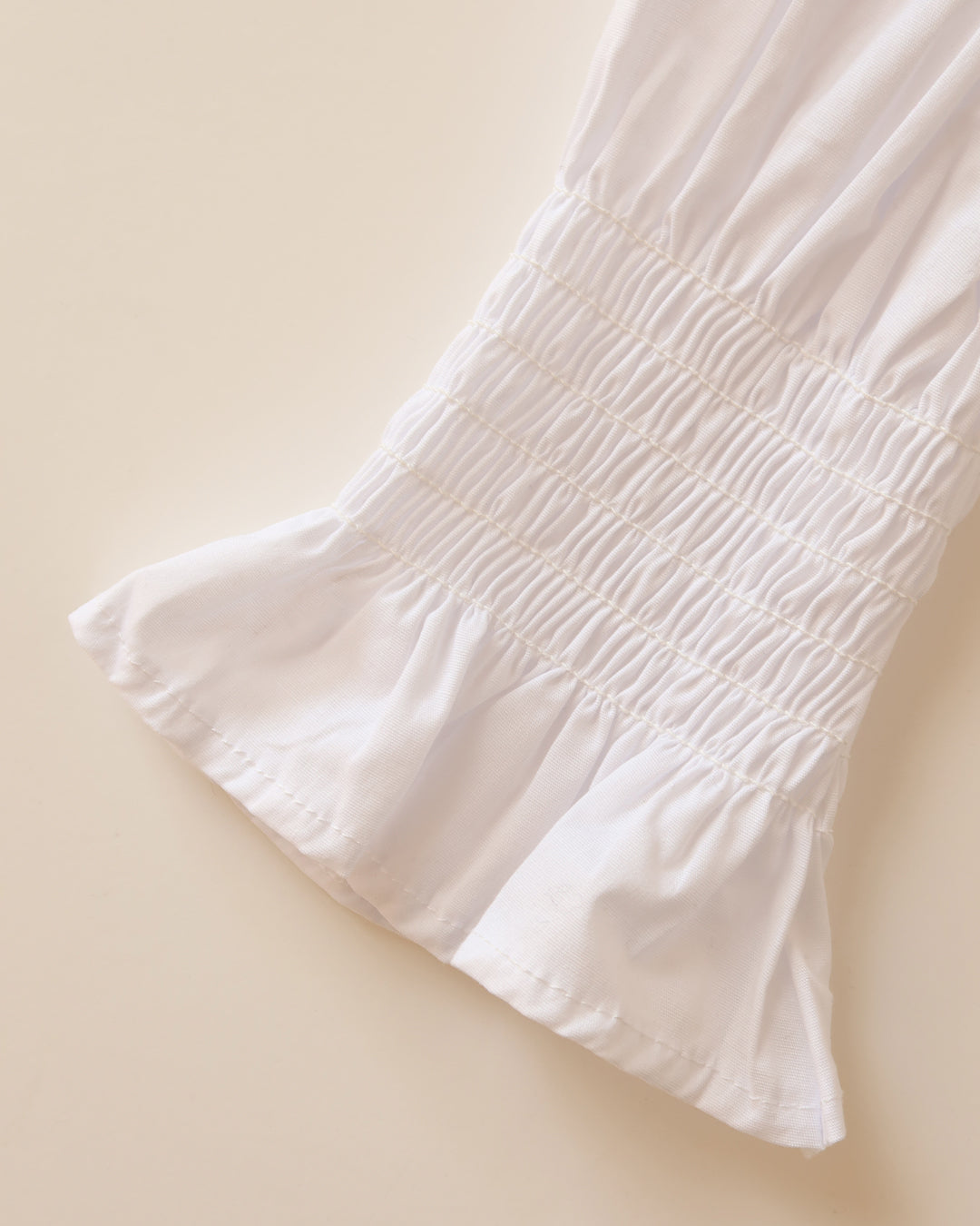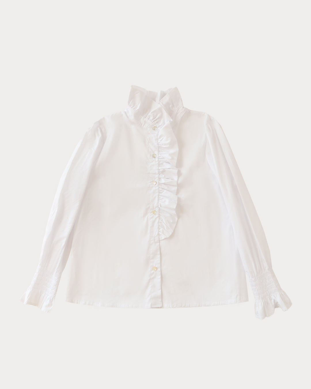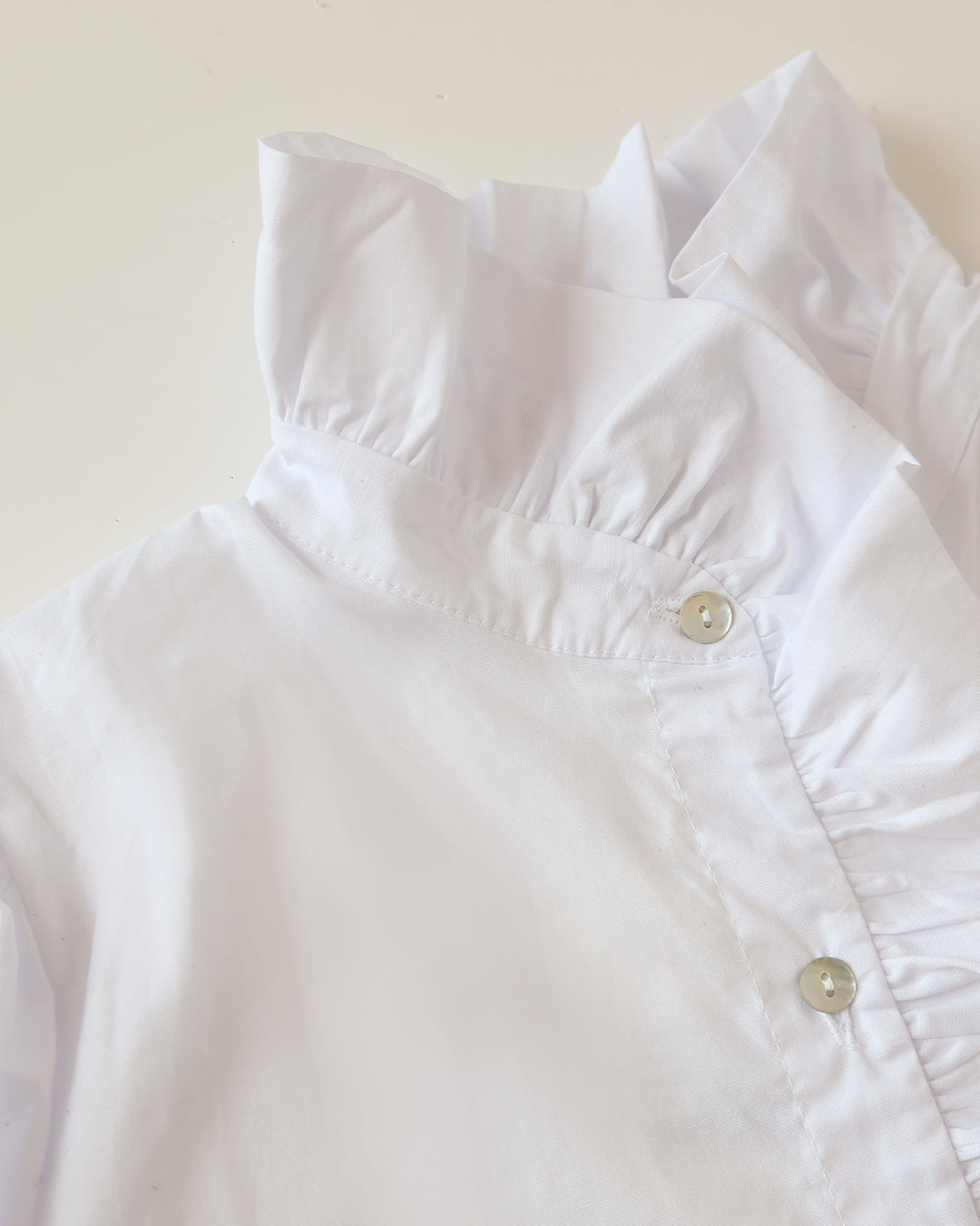 Camisa con cuello de volante, puños elásticos y cierre delantero con botones.