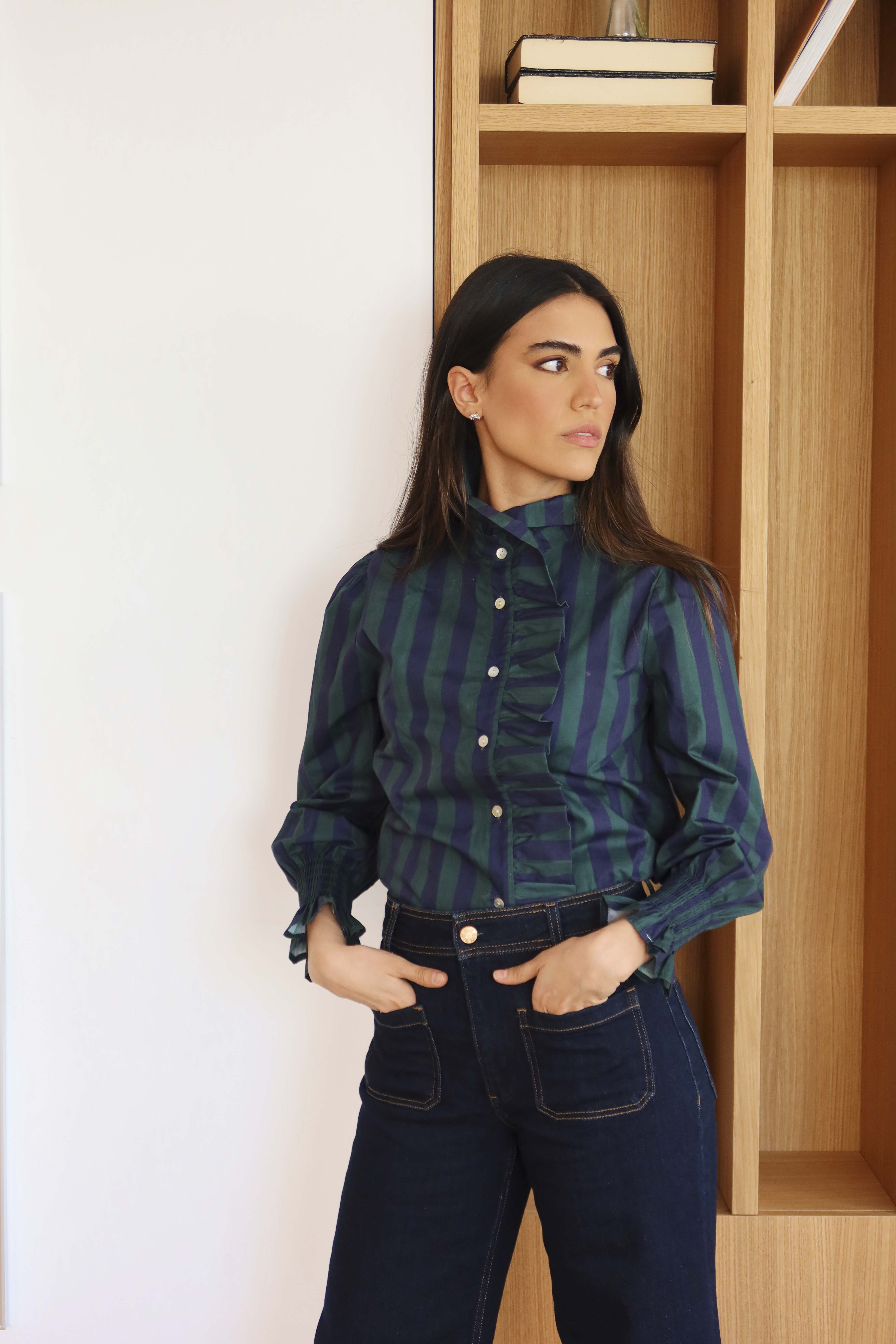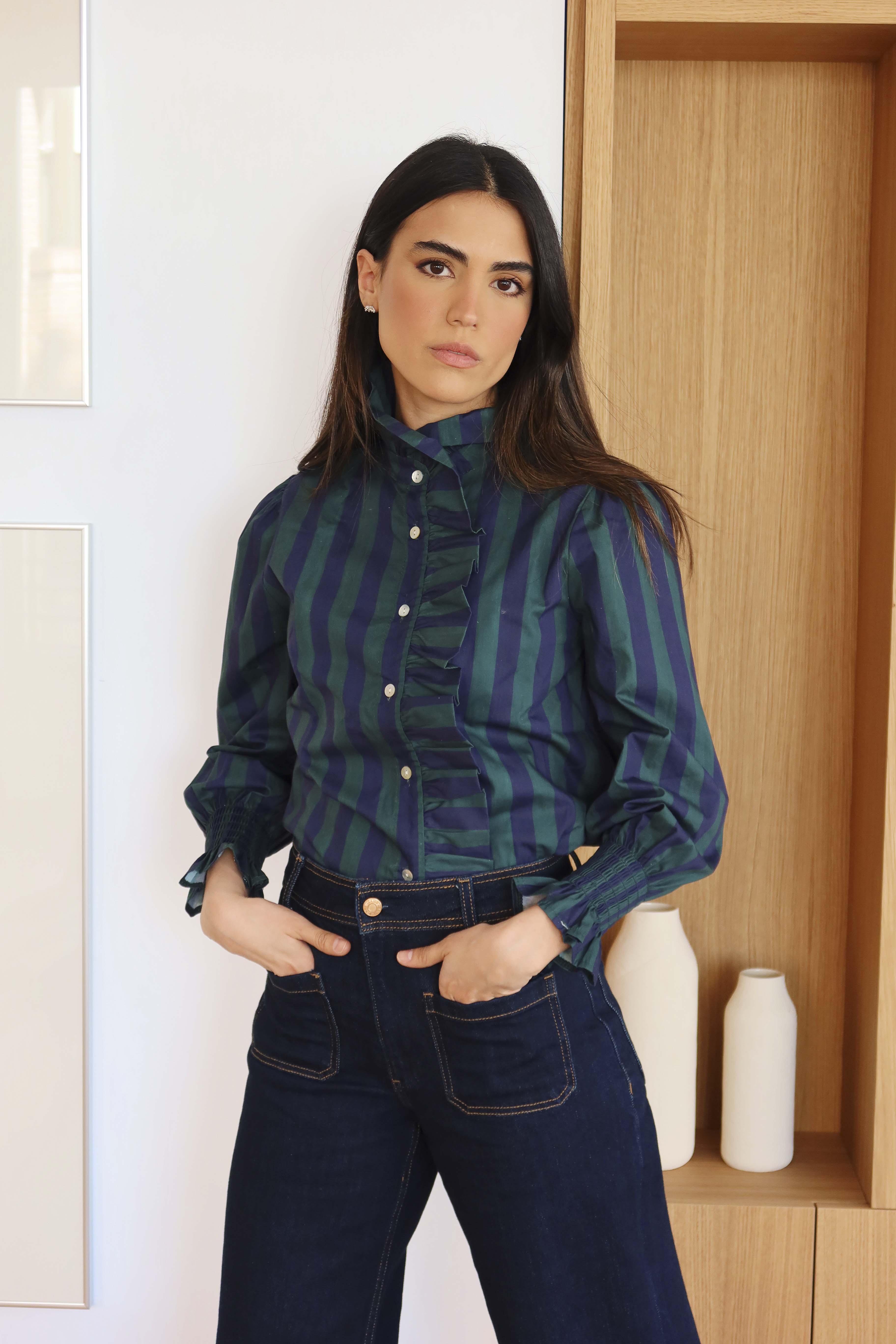 Camisa con cuello de volante, puños elásticos y cierre delantero con botones.