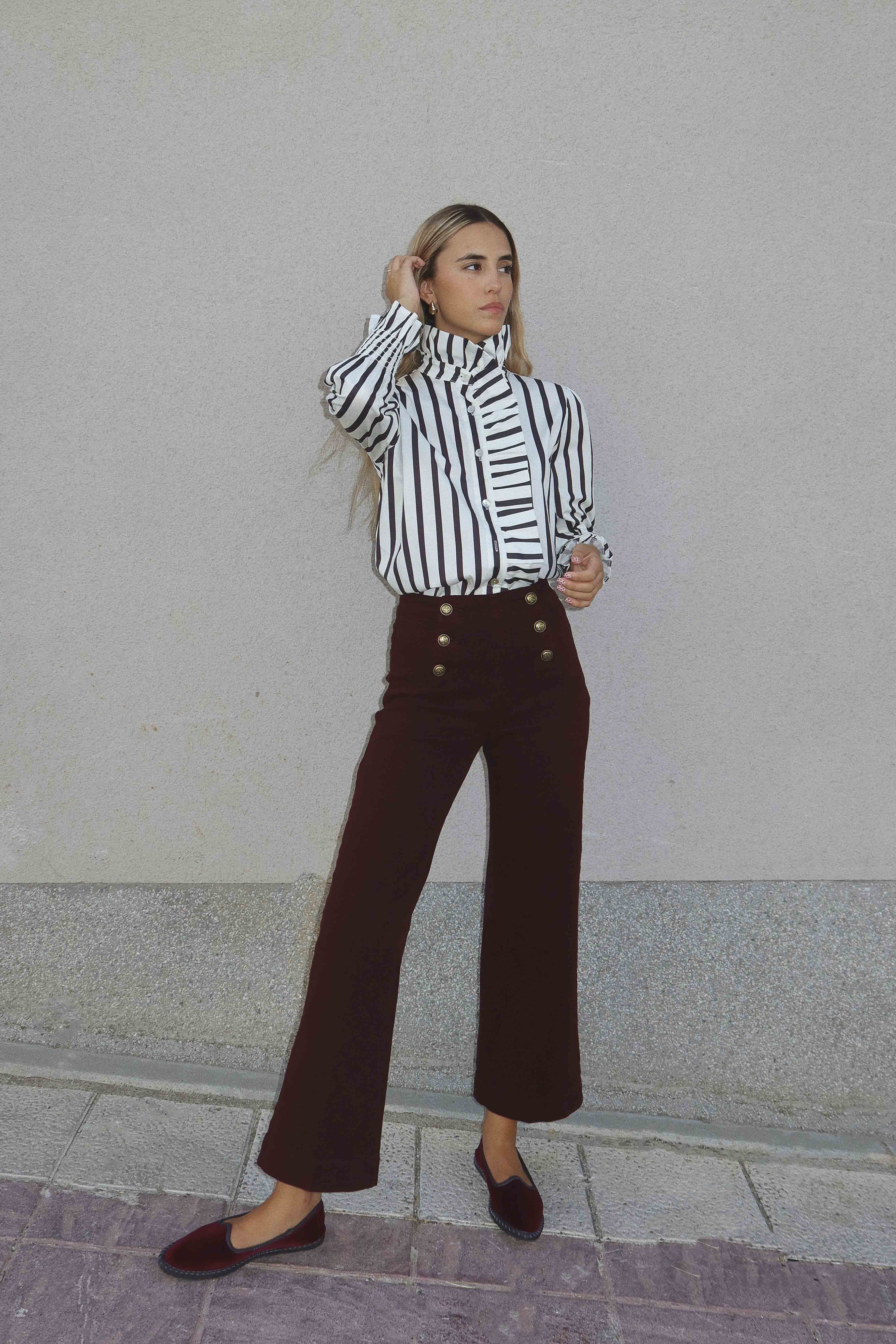 Camisa con cuello de volante, puños elásticos y cierre delantero con botones.