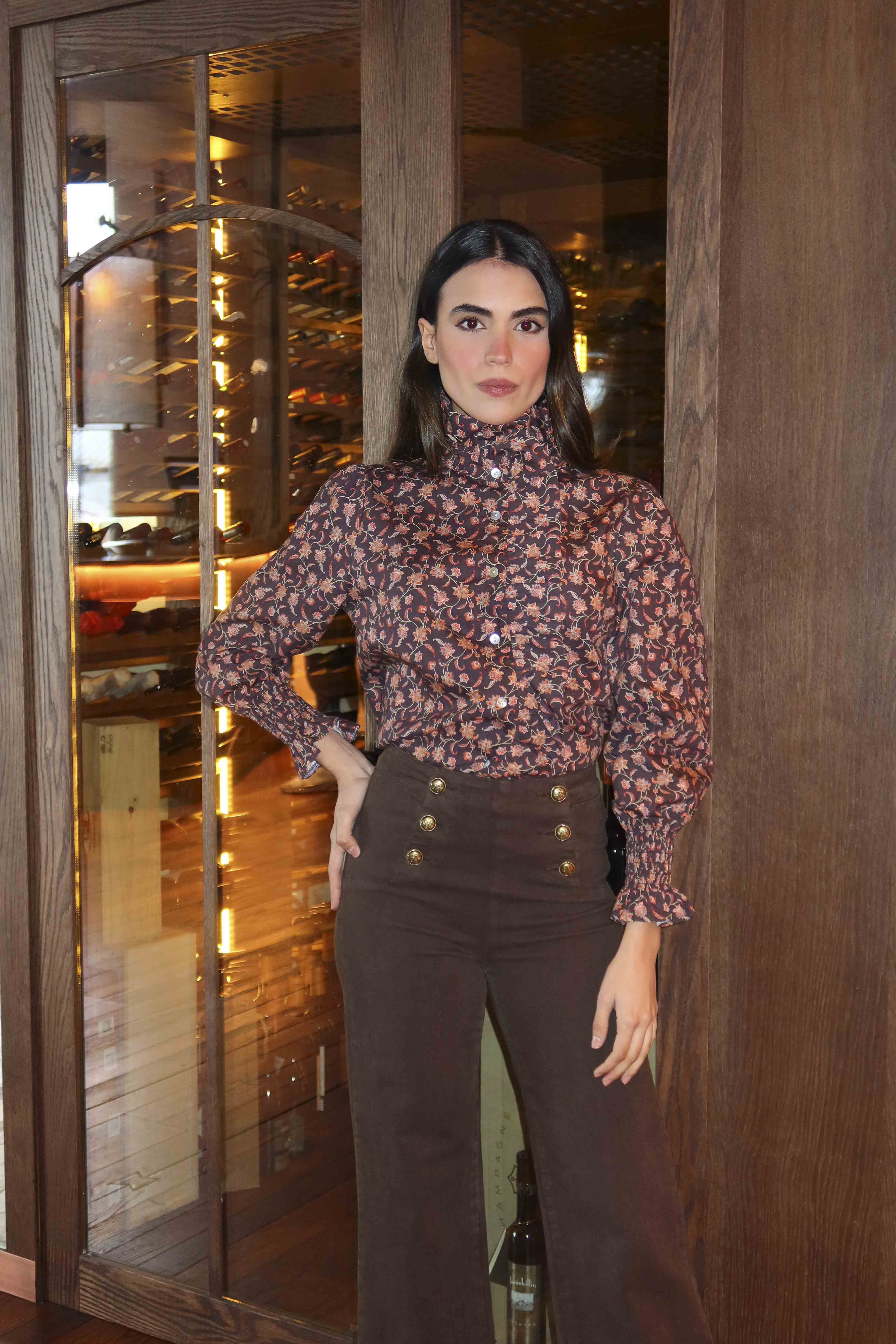 Camisa con cuello de volante, puños elásticos y cierre delantero con botones.