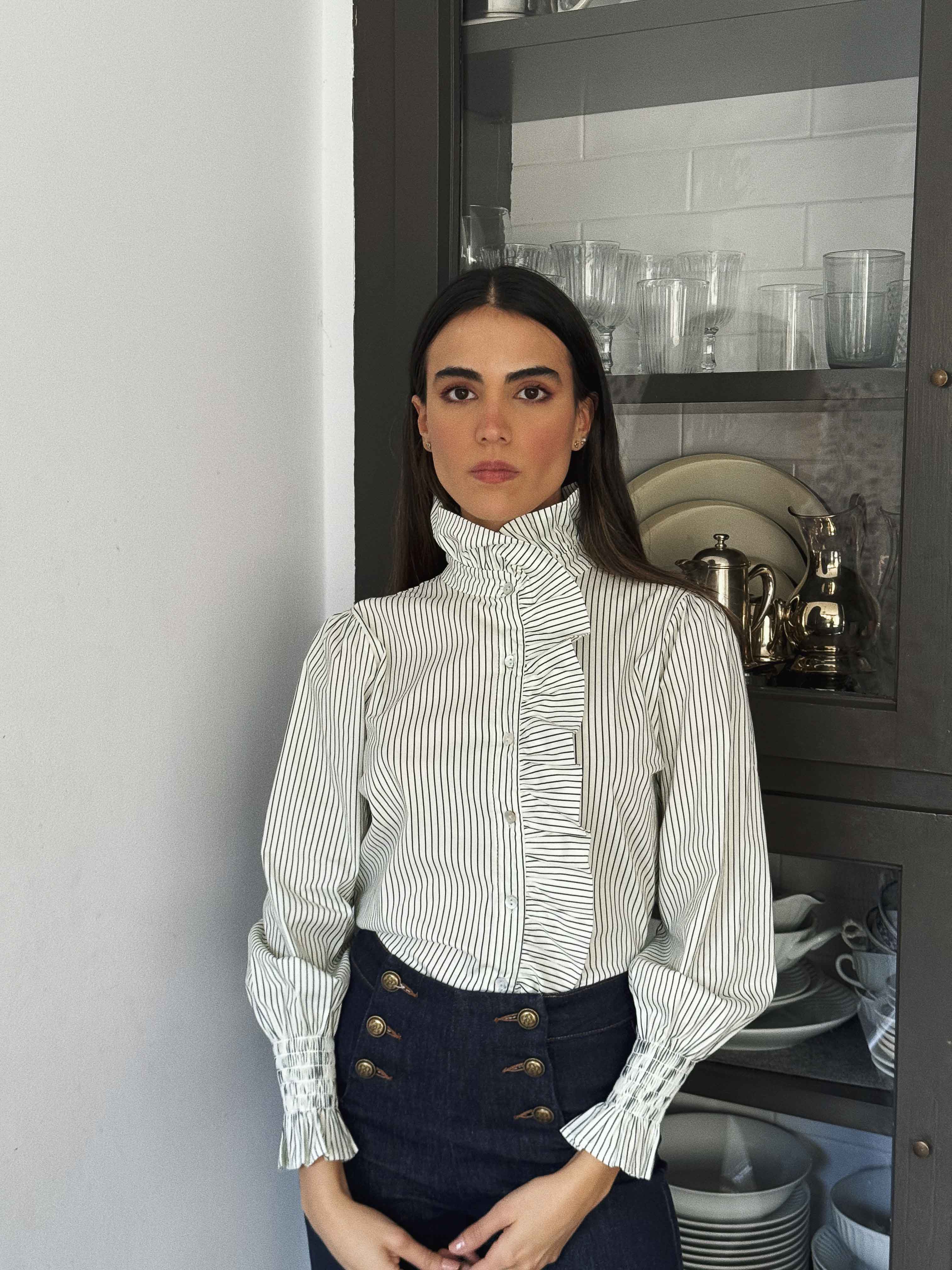 Camisa con cuello de volante, puños elásticos y cierre delantero con botones.