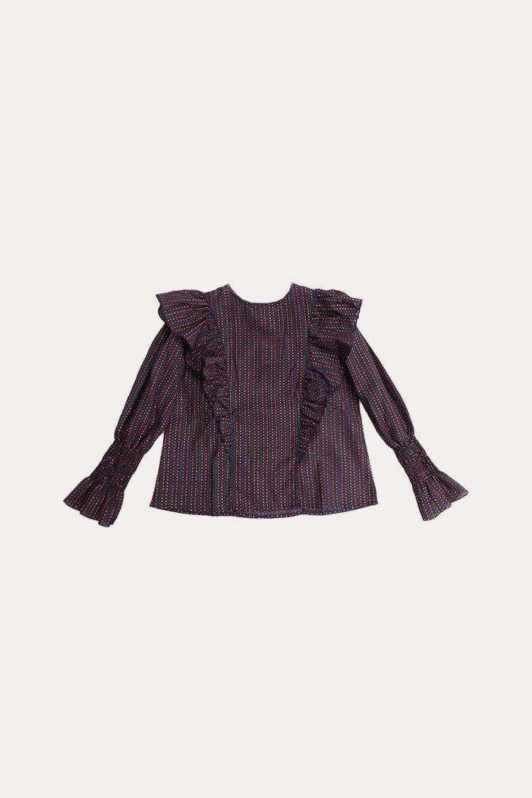 Camisa de manga larga con estampado. Detalles con volantes y puño con elástico y volante.