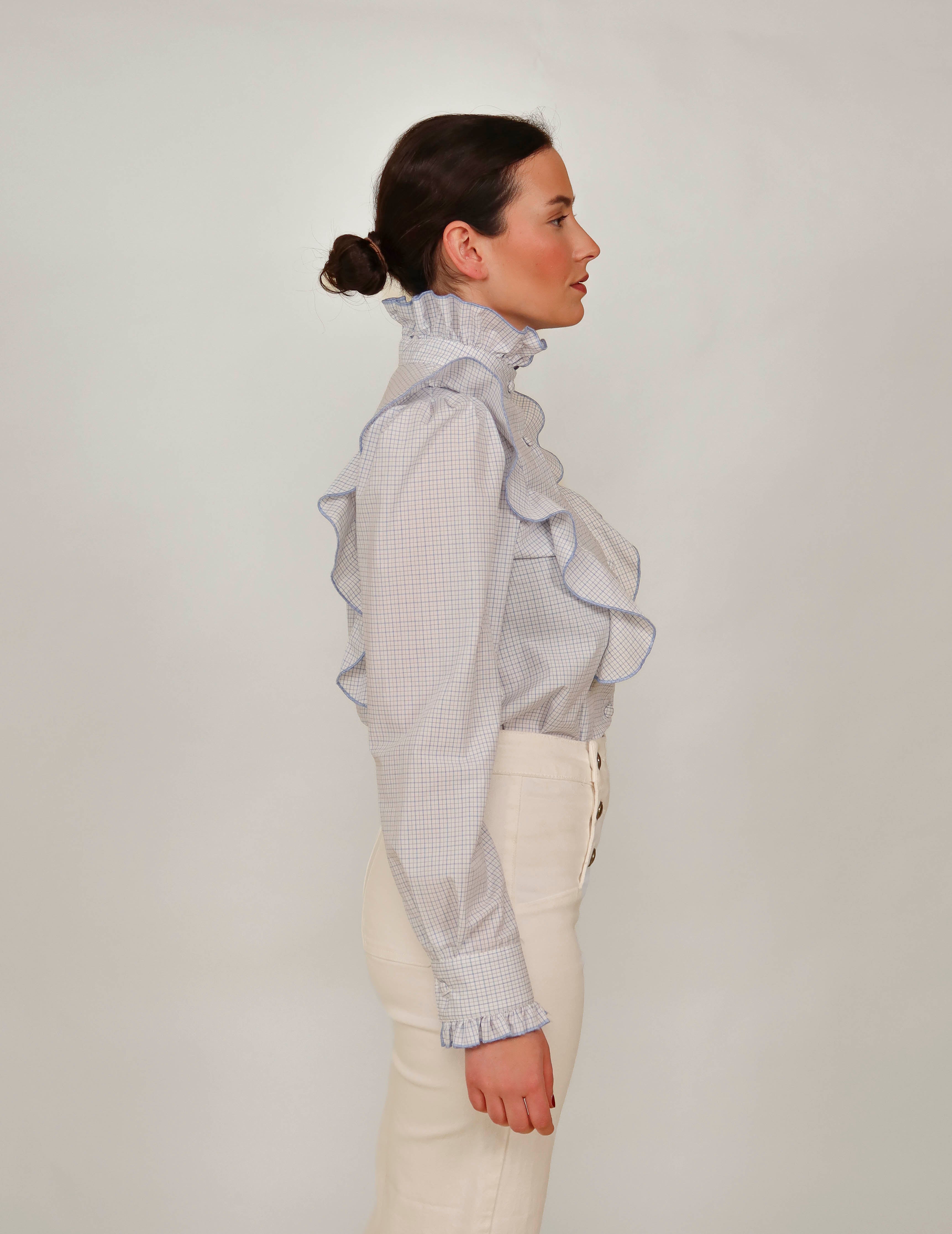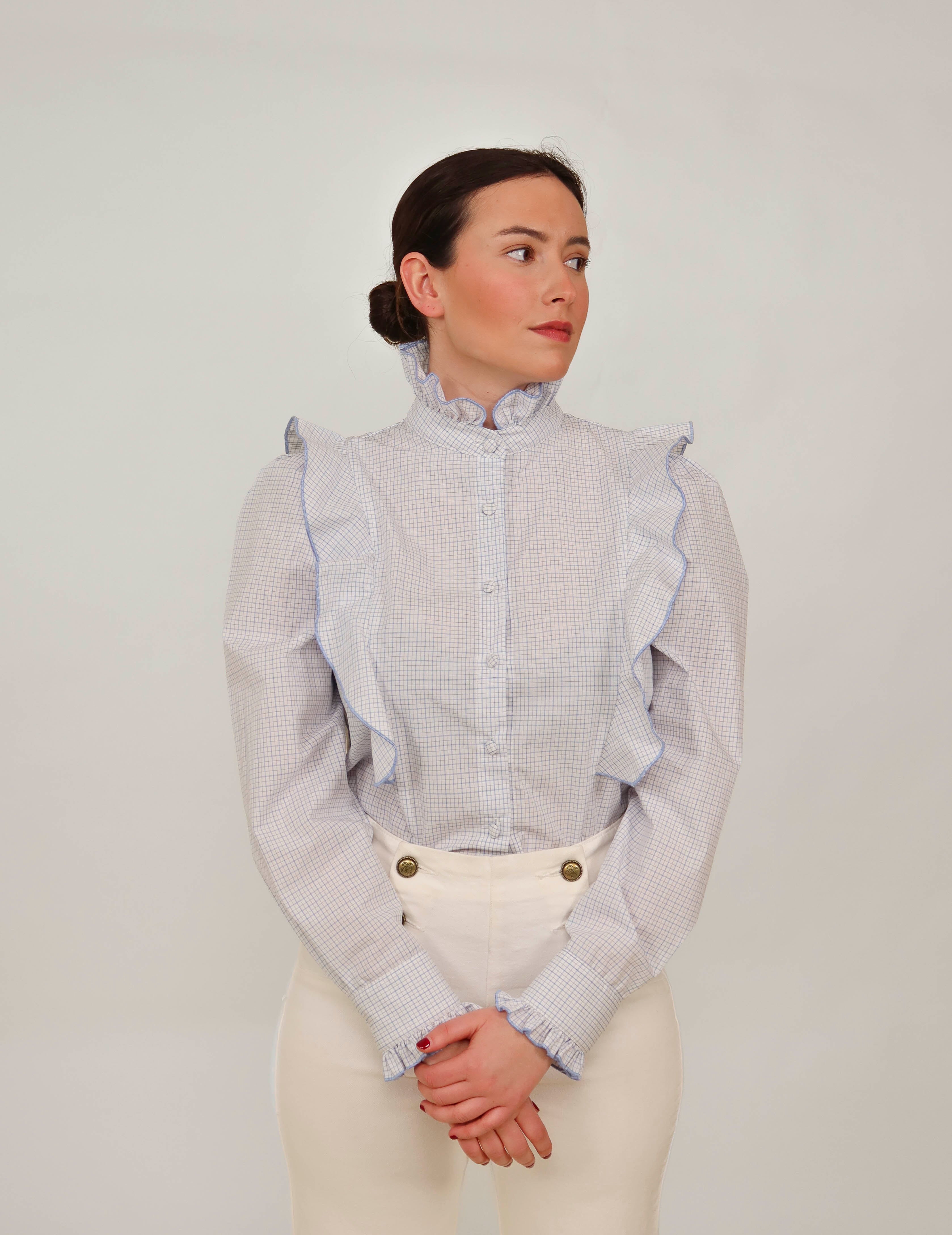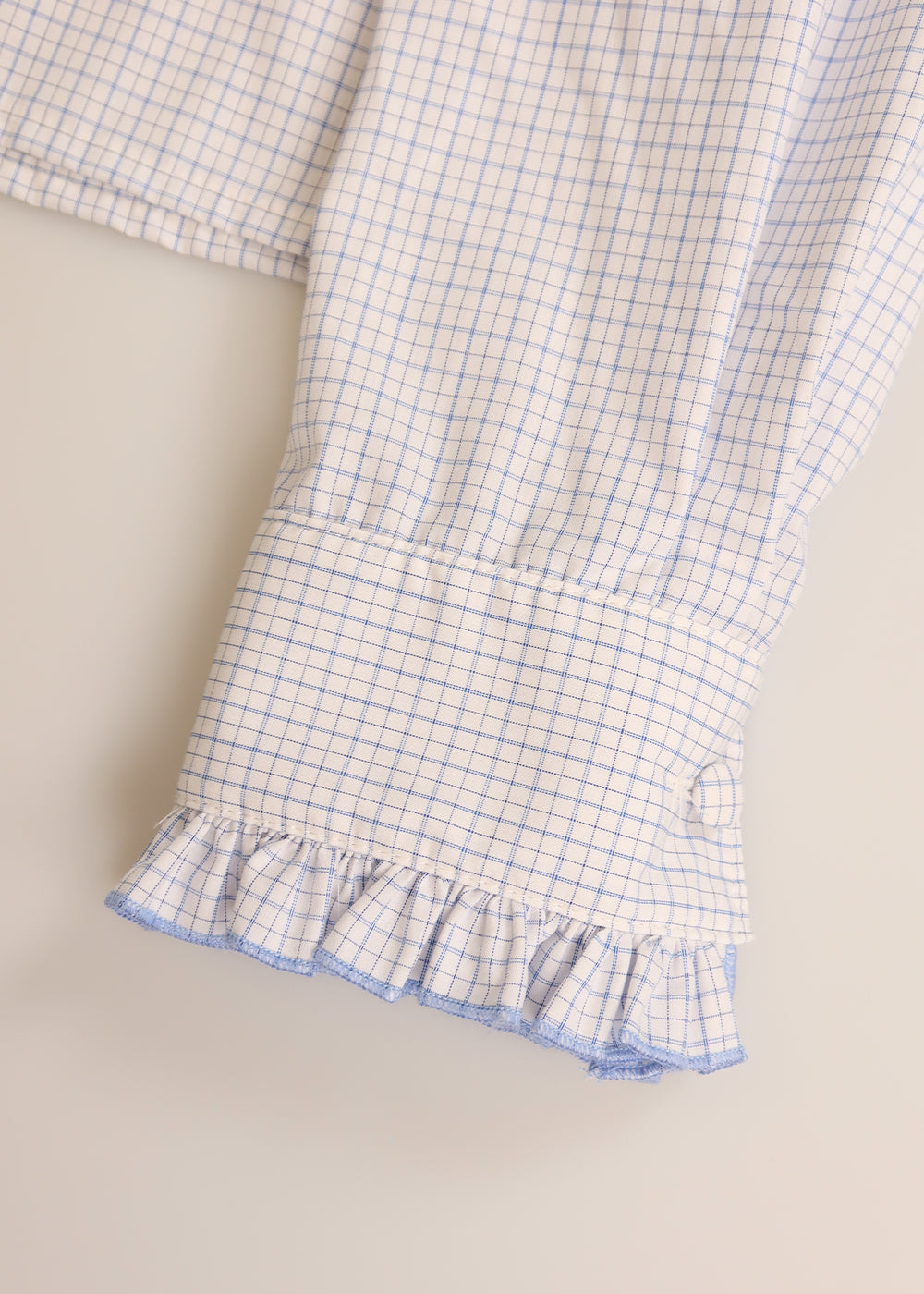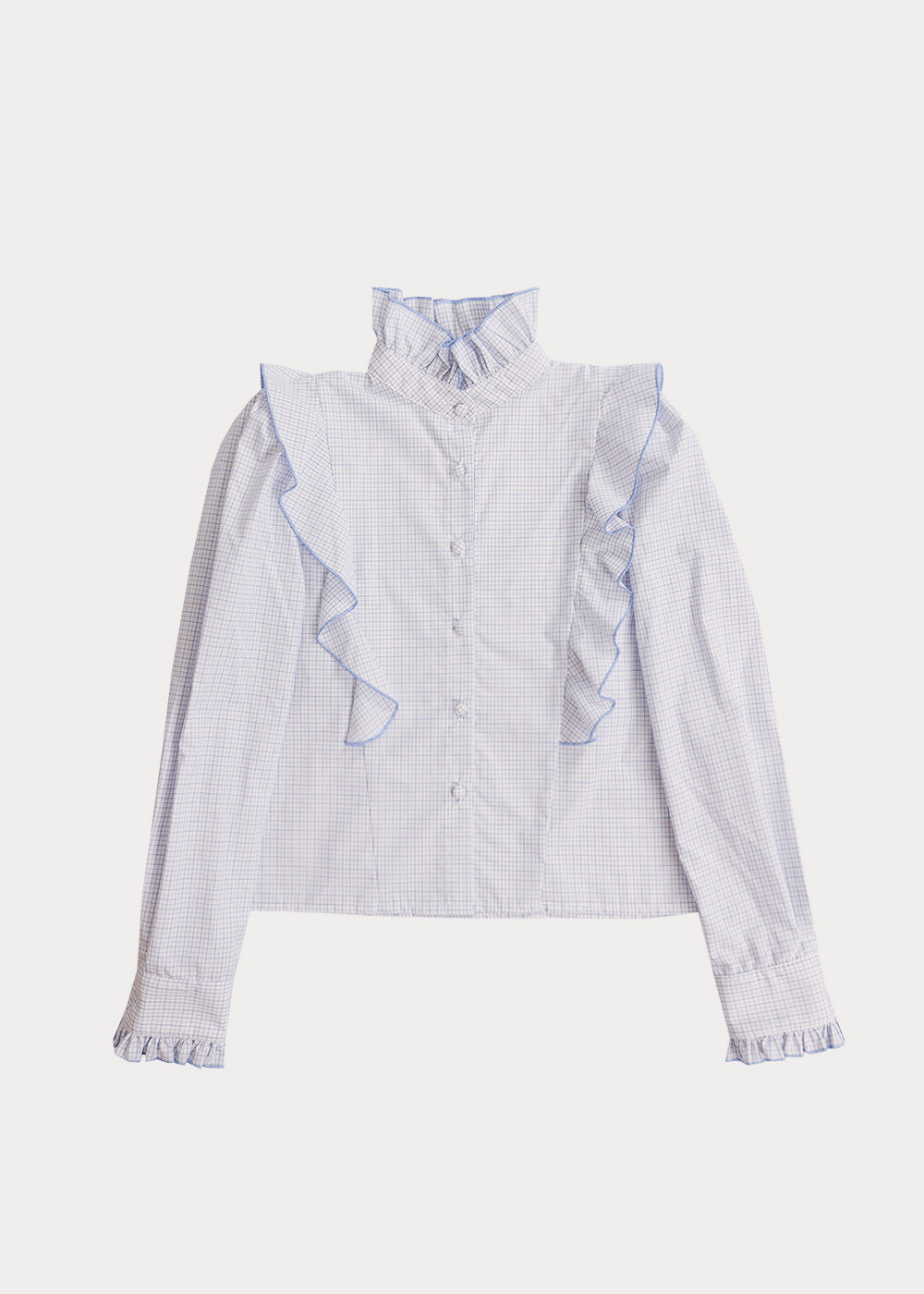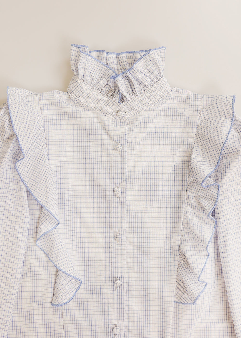 Camisa de algodón, cuello alto con volante. Detalles con volantes y puño cerrado con botón.