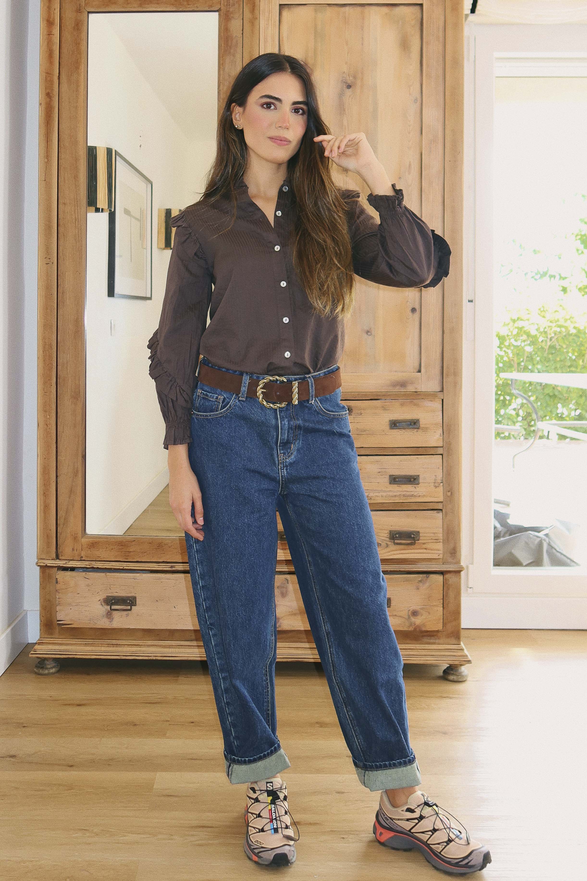 Camisa con cuello de volante, mangas decoradas con volante, puños elásticos y cierre delantero con botones.