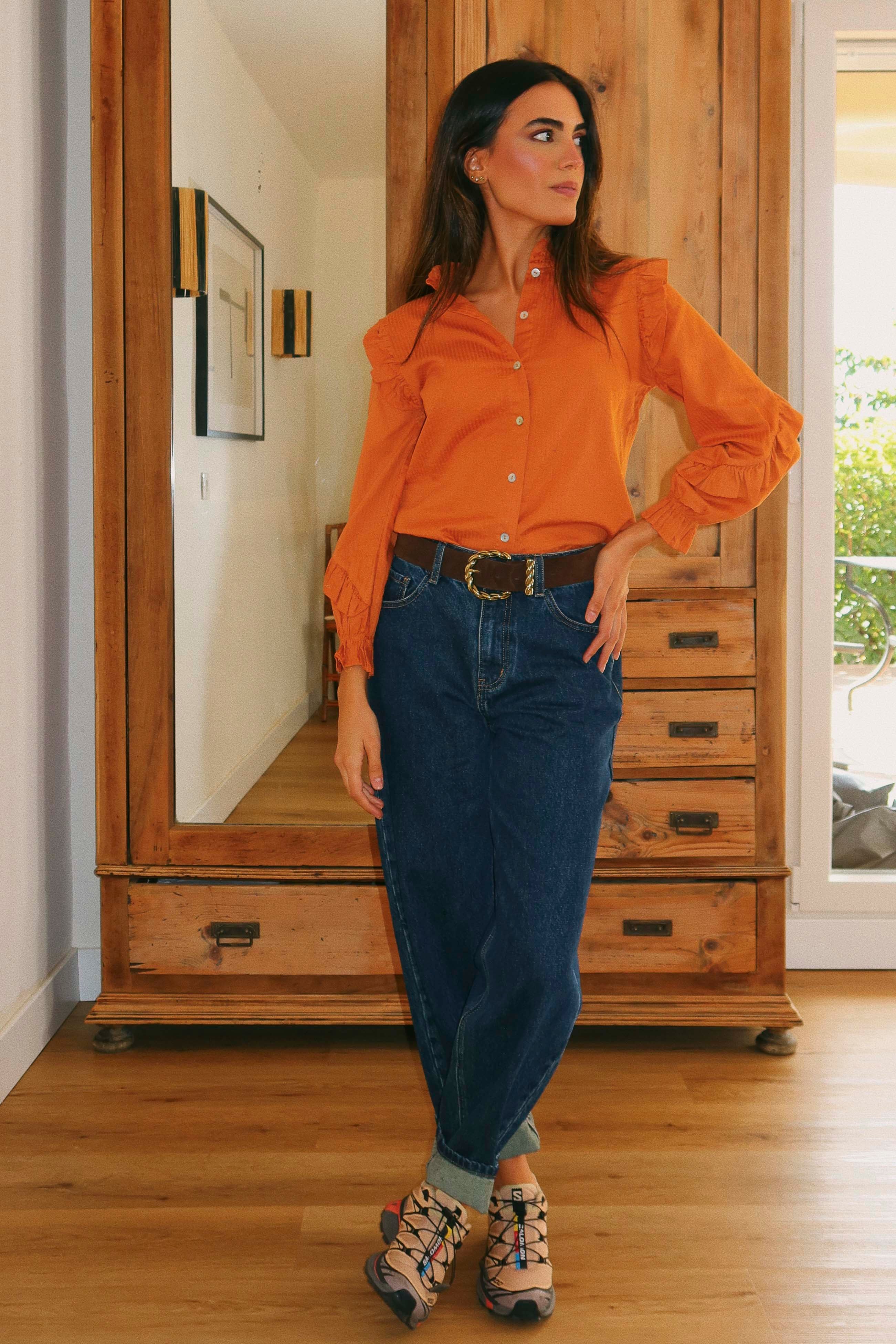 Camisa con cuello de volante, mangas decoradas con volante, puños elásticos y cierre delantero con botones.