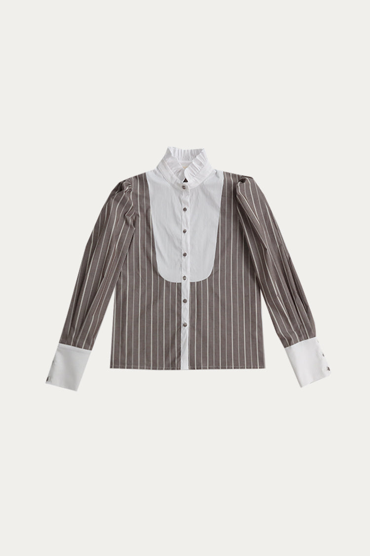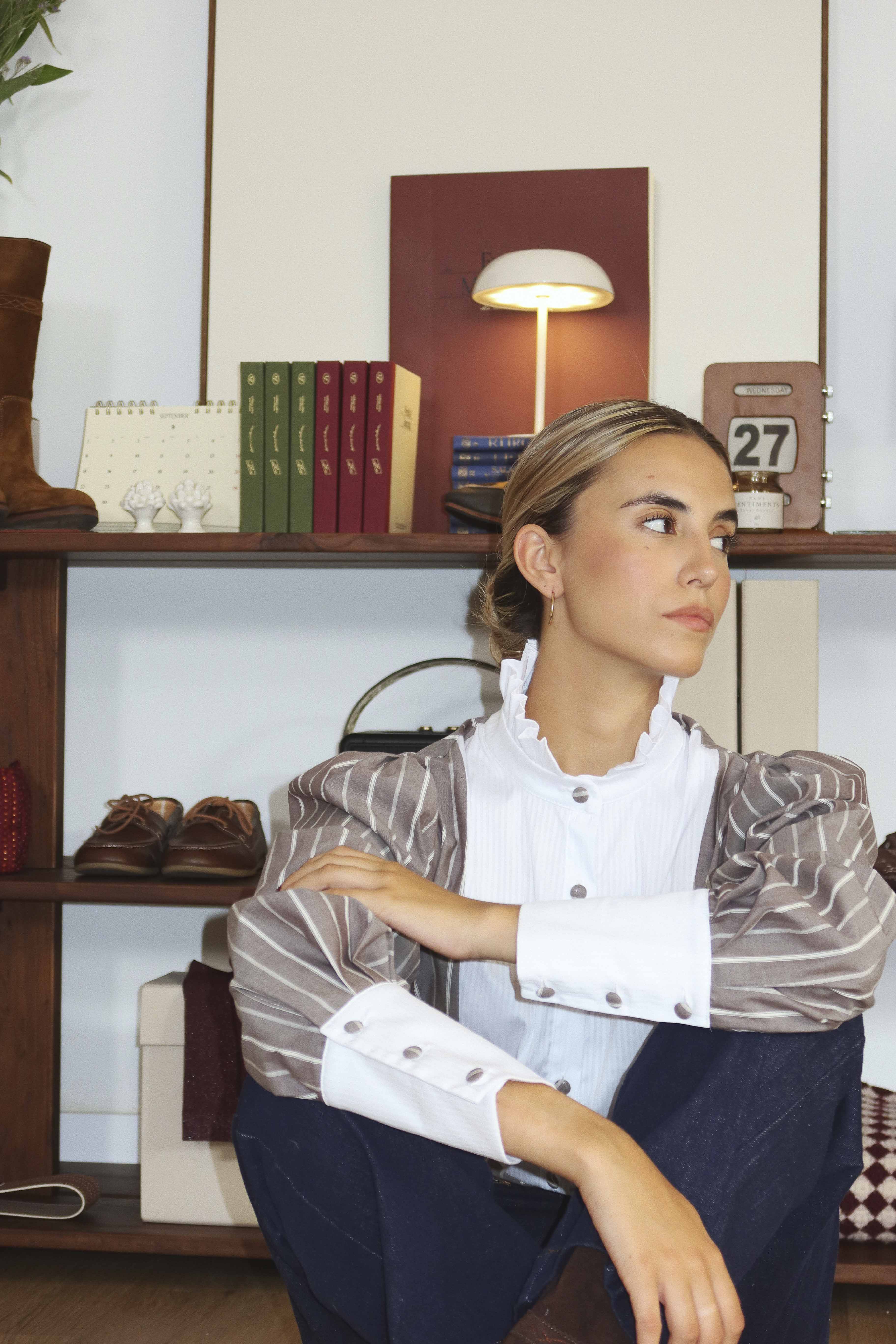 Camisa con el cuello de volante, cierre delantero con botones forrados. Puño cerrado con botones forrados.