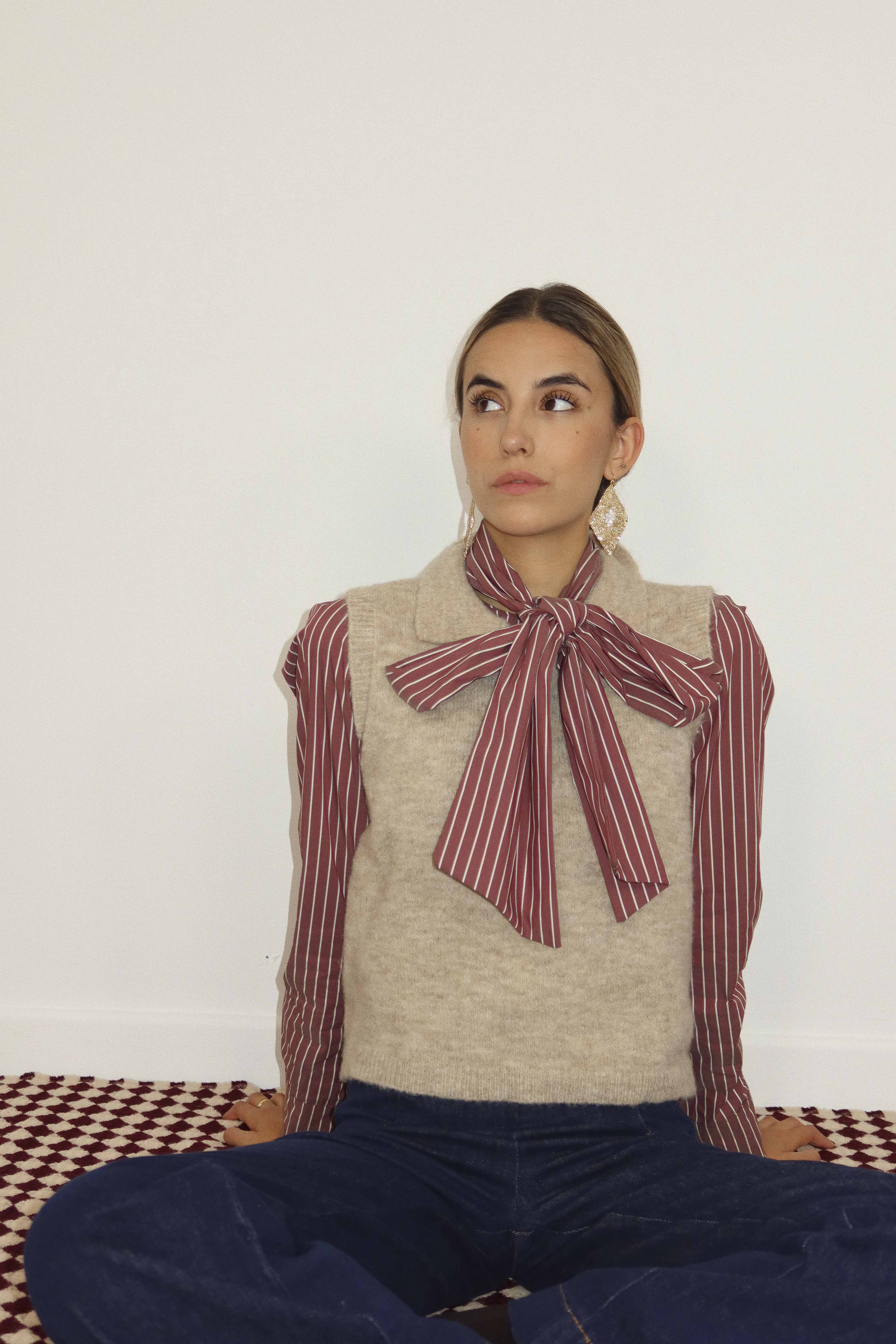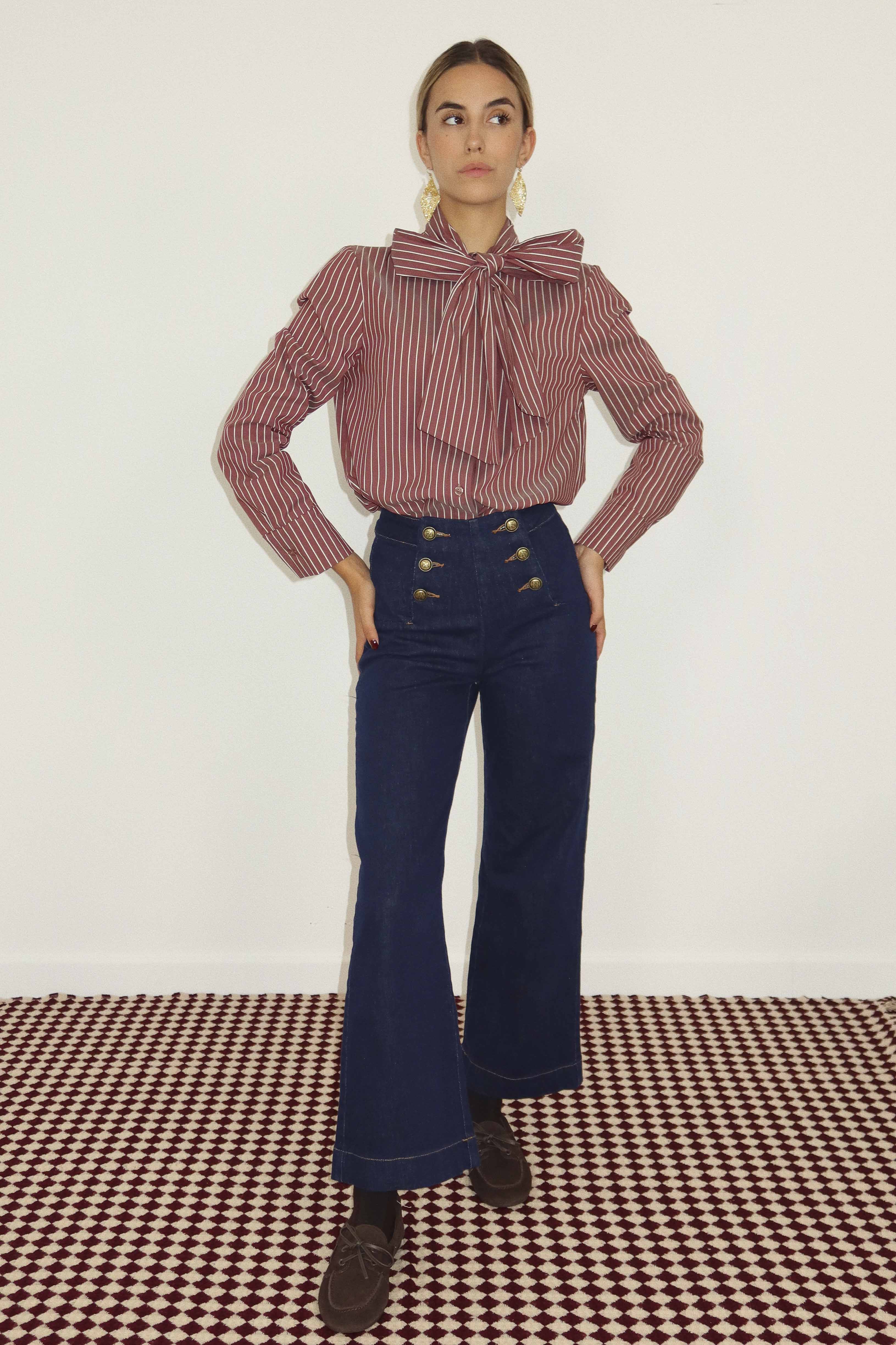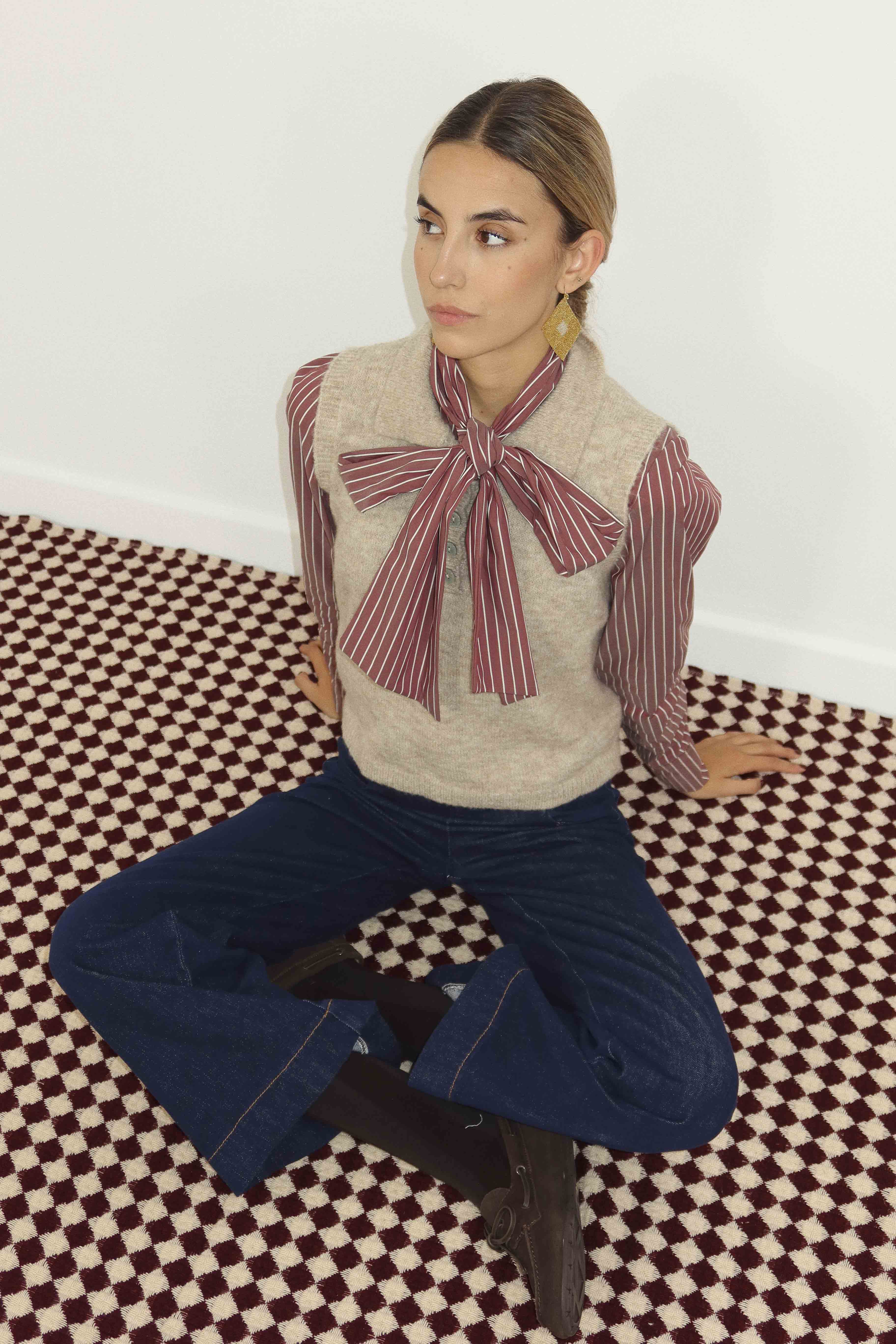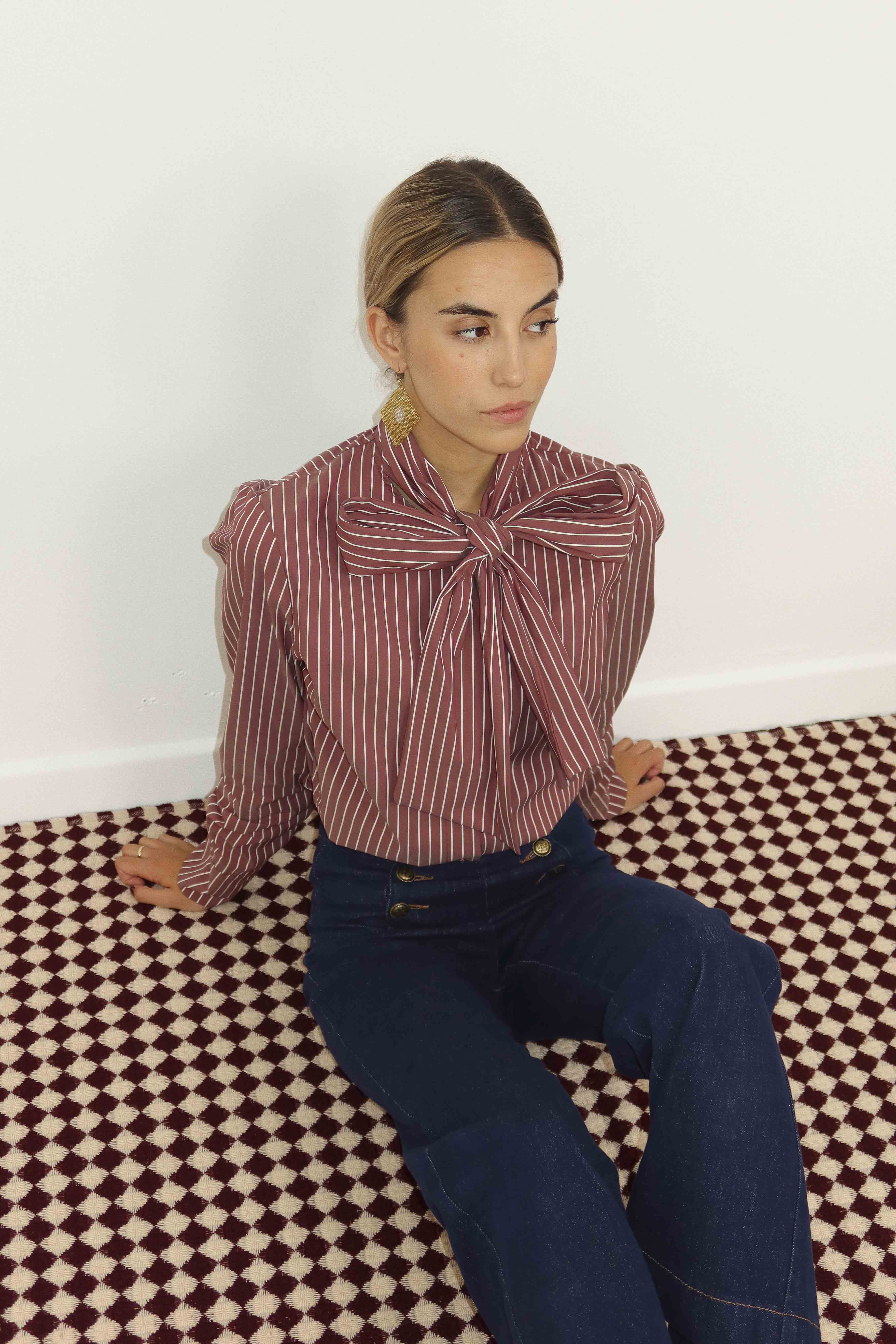 Camisa de cuello subido con lazo y manga larga. Puños con cierre de botón.