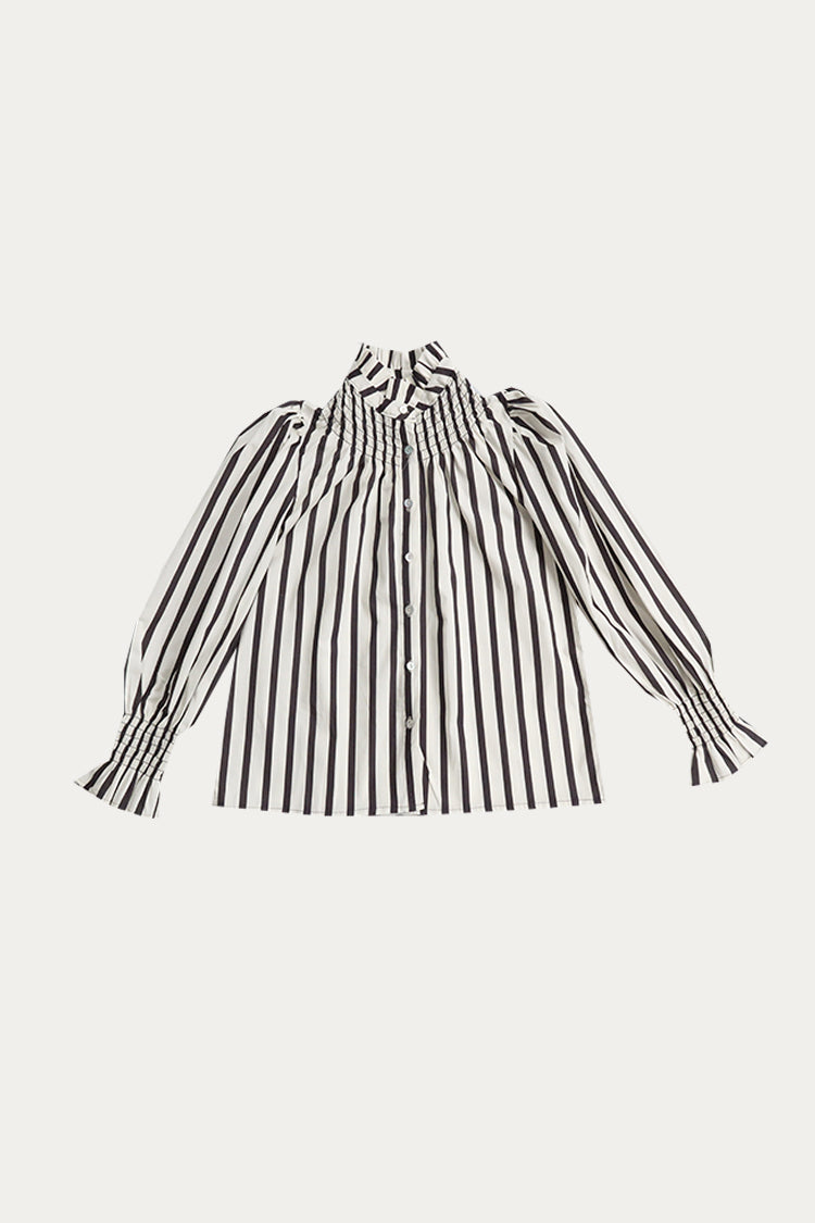 Camisa con cuello de volante, puños elásticos y cierre delantero con botones.