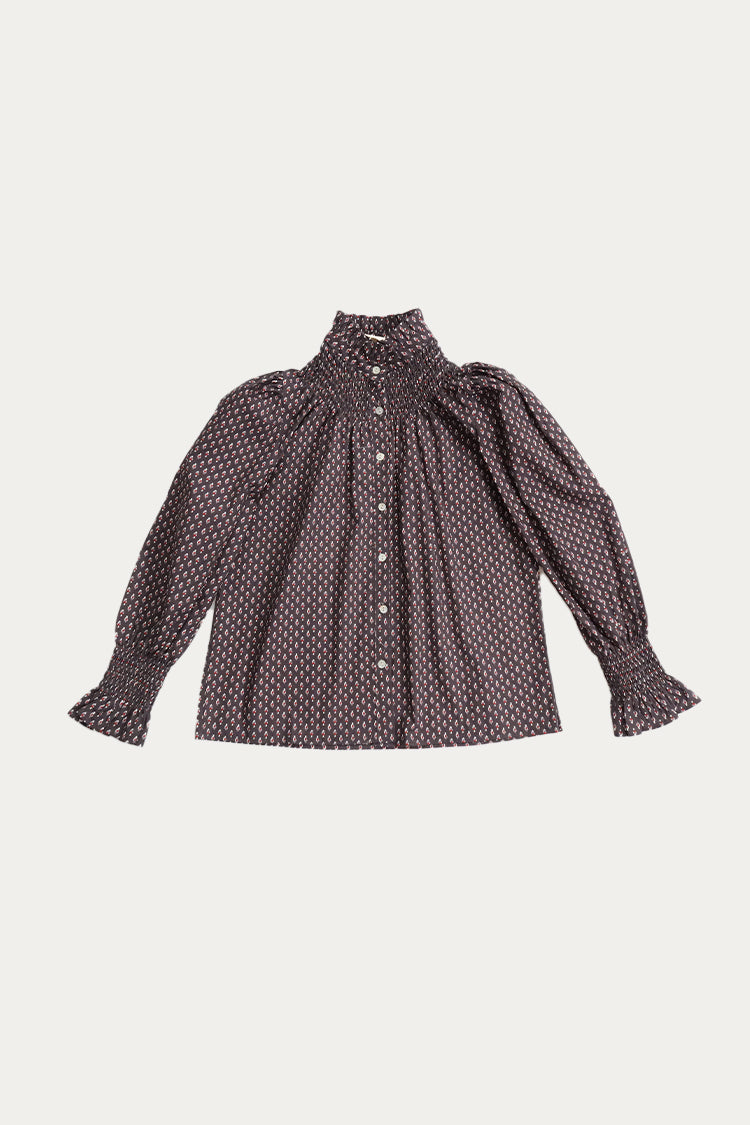 Camisa con cuello de volante, puños elásticos y cierre delantero con botones.