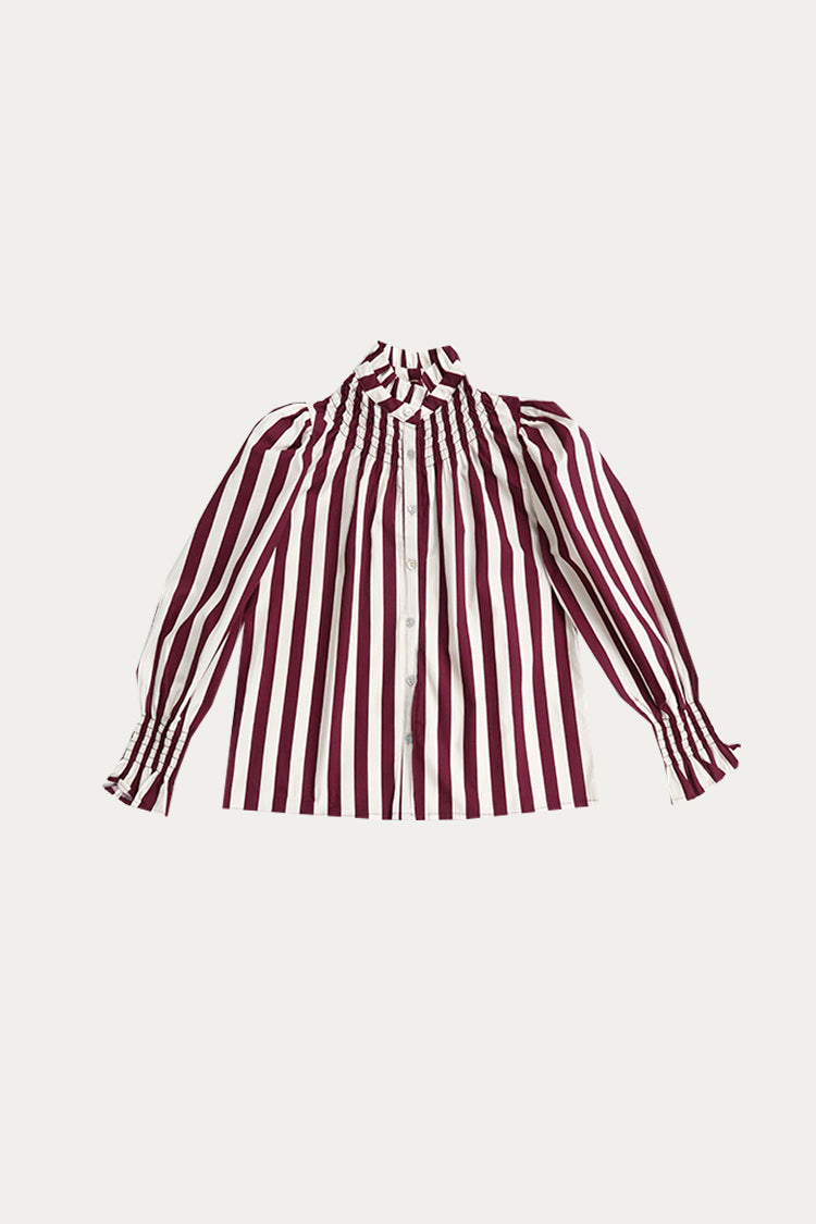 Camisa con cuello de volante, puños elásticos y cierre delantero con botones.