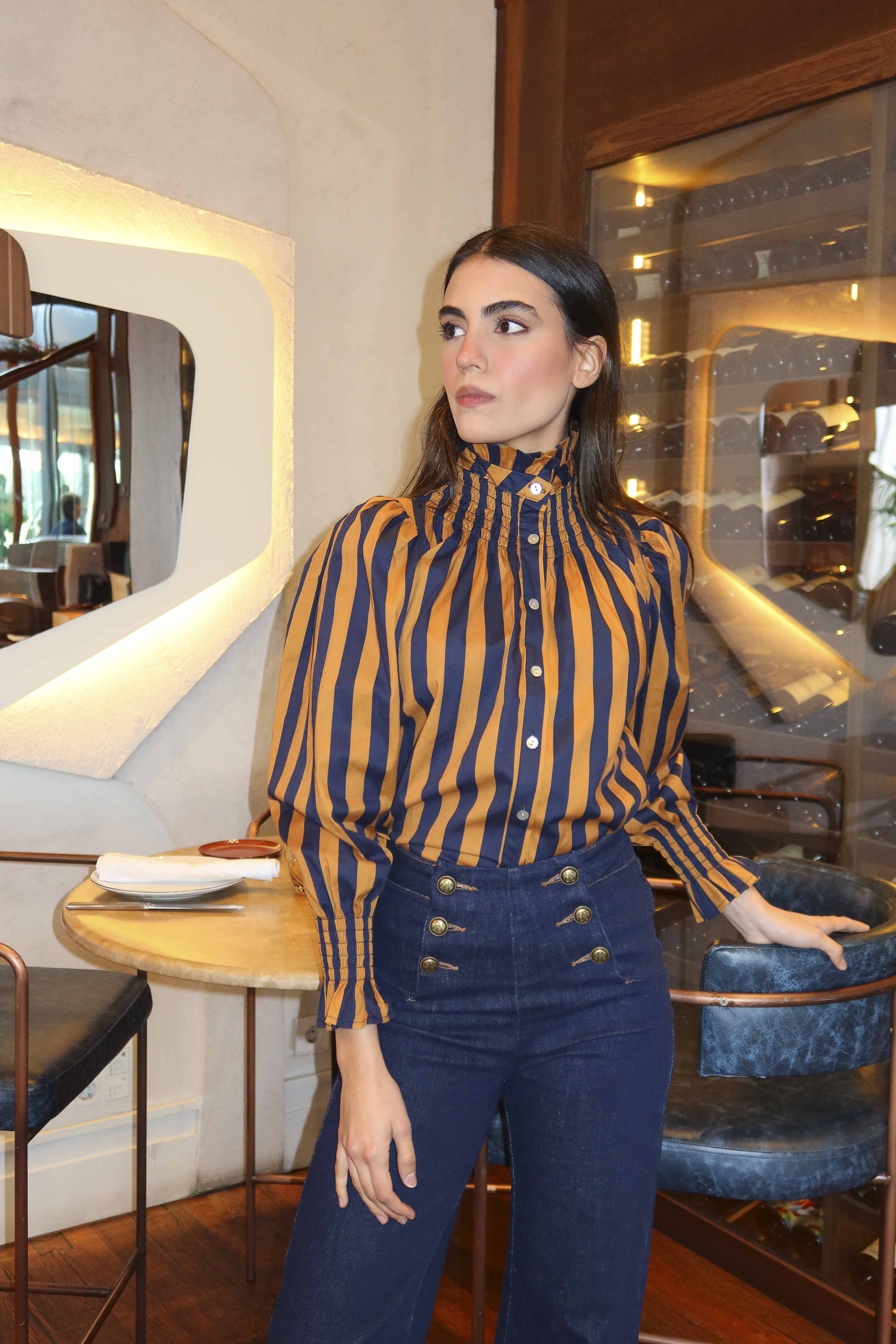 Camisa con cuello de volante, puños elásticos y cierre delantero con botones.