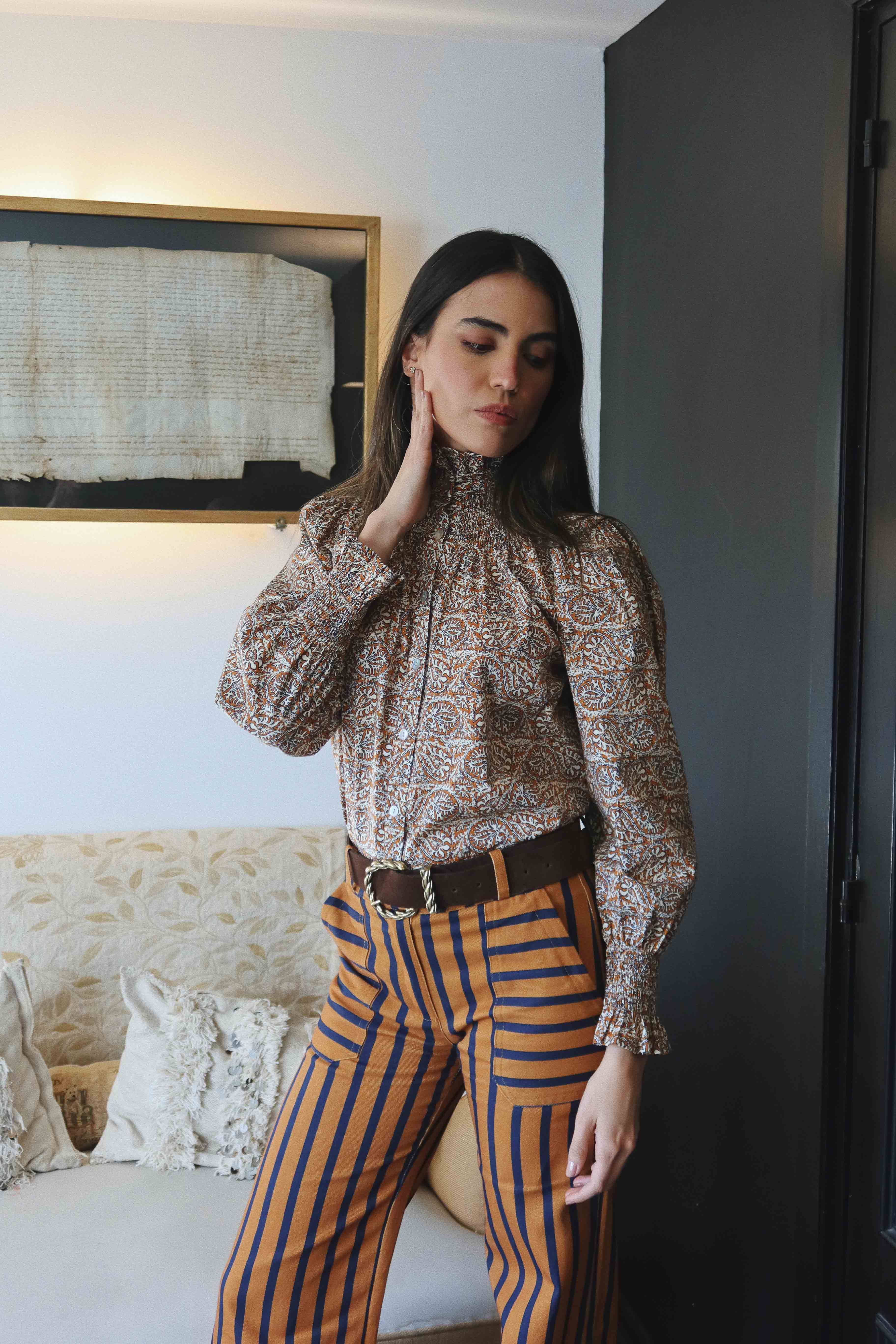 Camisa con cuello de volante, puños elásticos y cierre delantero con botones.