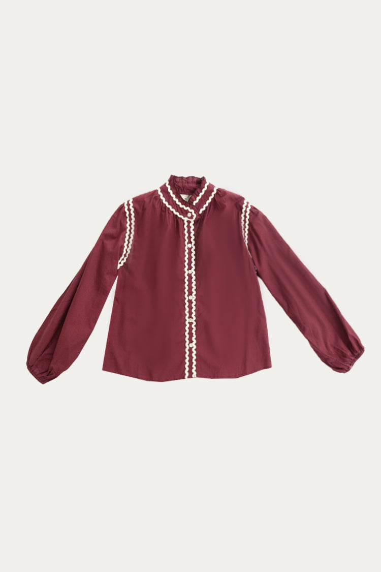 Camisa de manga larga, decorada con picunela. Puños con elástico y cierre delantero con botones.