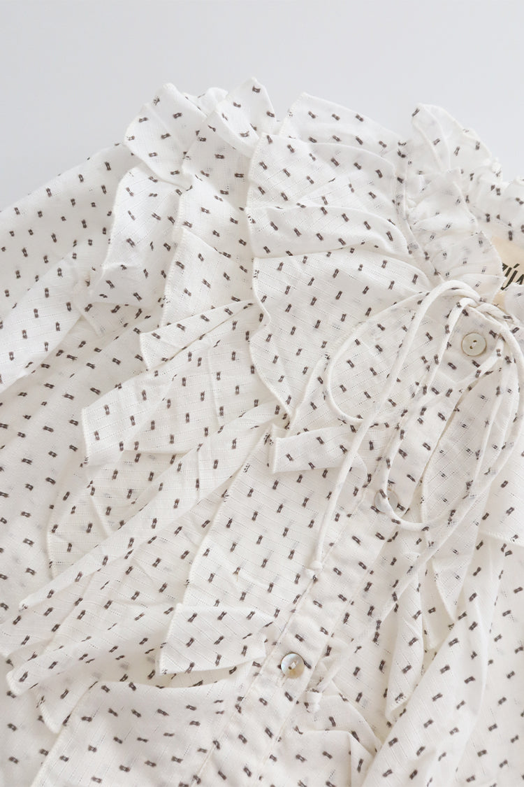 Camisa de manga larga, decorada con volantes y bordados. Cierre delantero con botones y lazo en el cuello. Puños con elástico y volante.