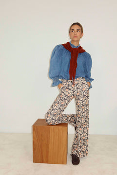 Camisa con cuello de volante, puños elásticos y cierre delantero con botones.