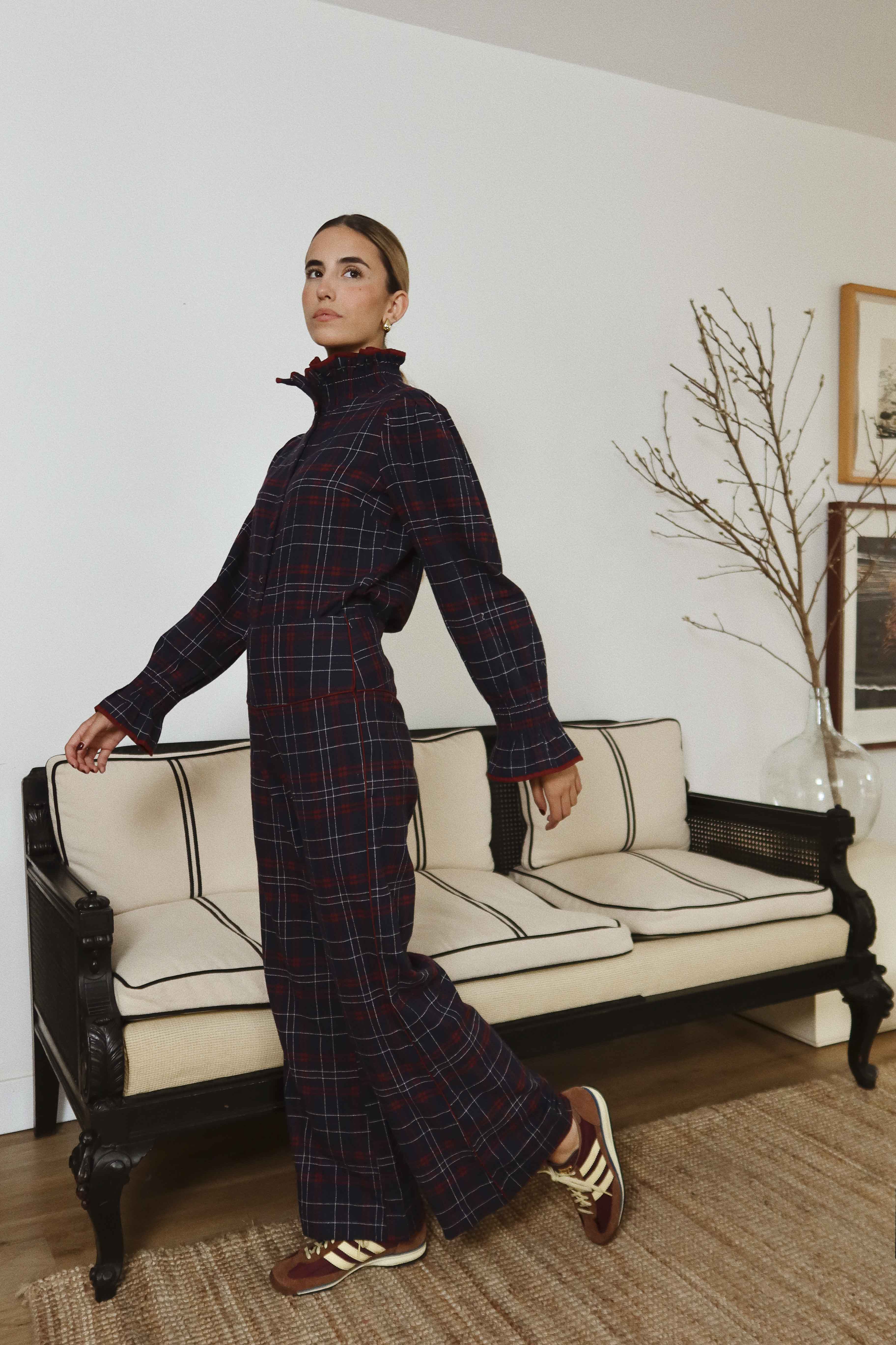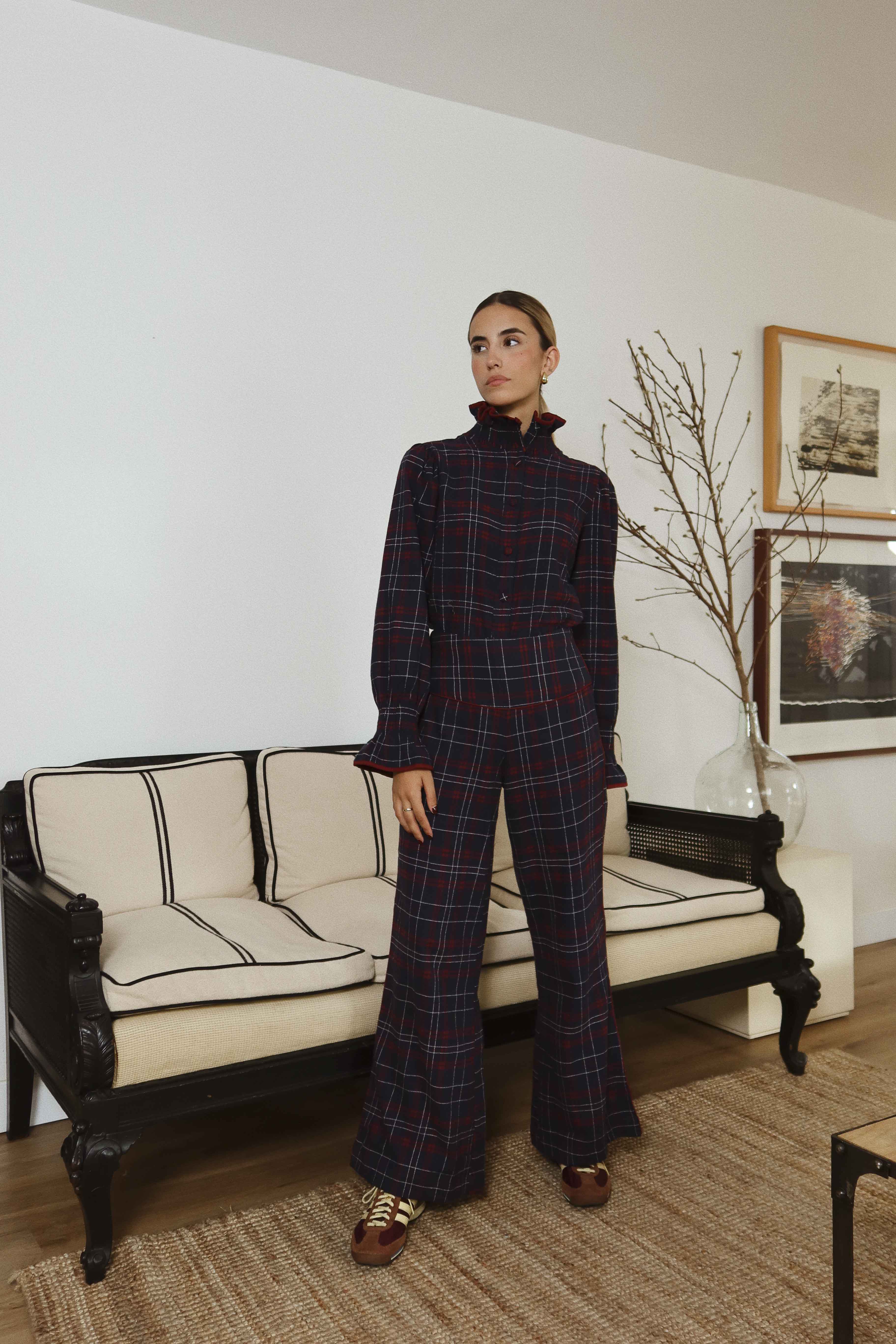 Camisa de manga larga, estampado escocés, con cuello alto de volantes, cierre delantero con botones forrados, puños elásticos.