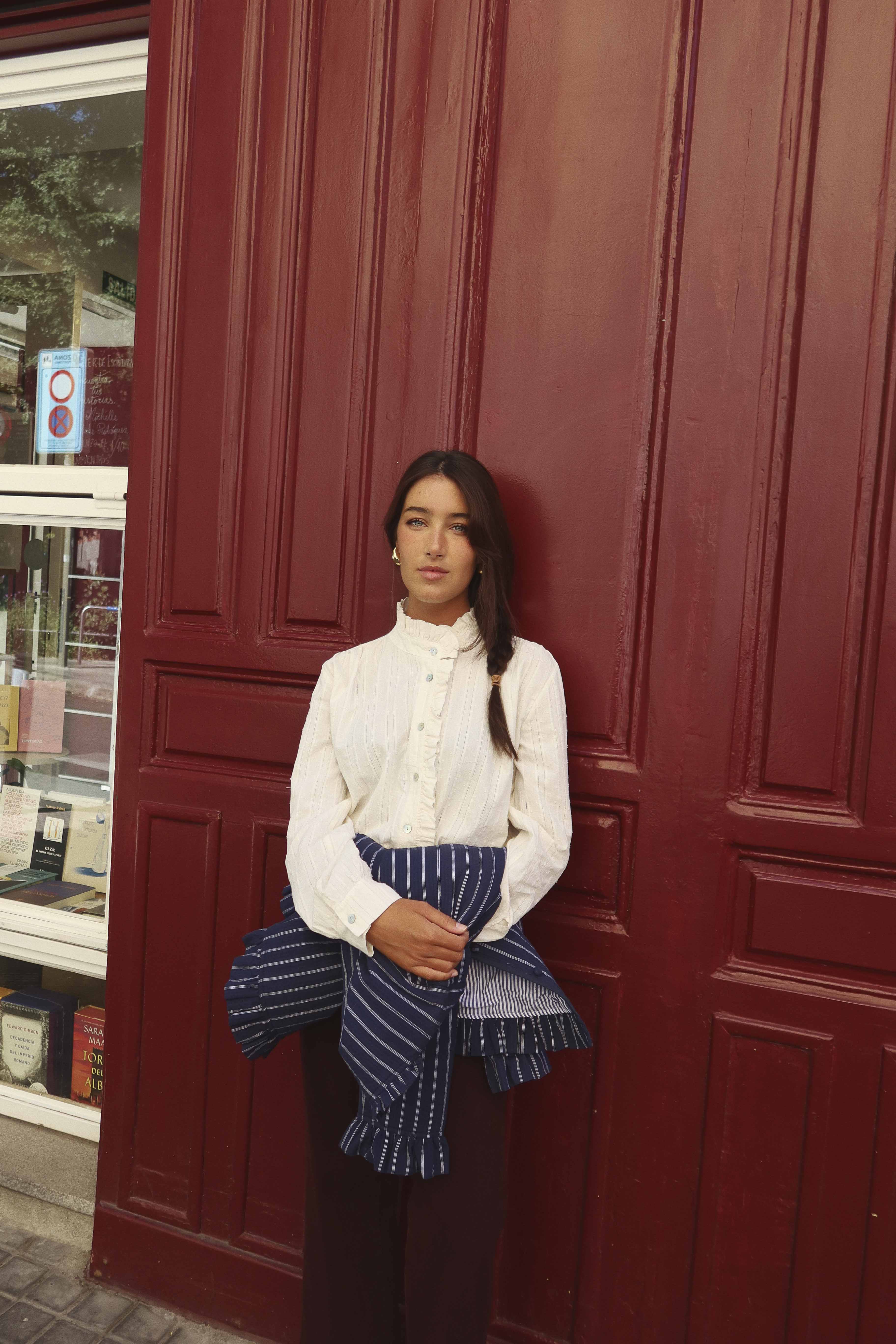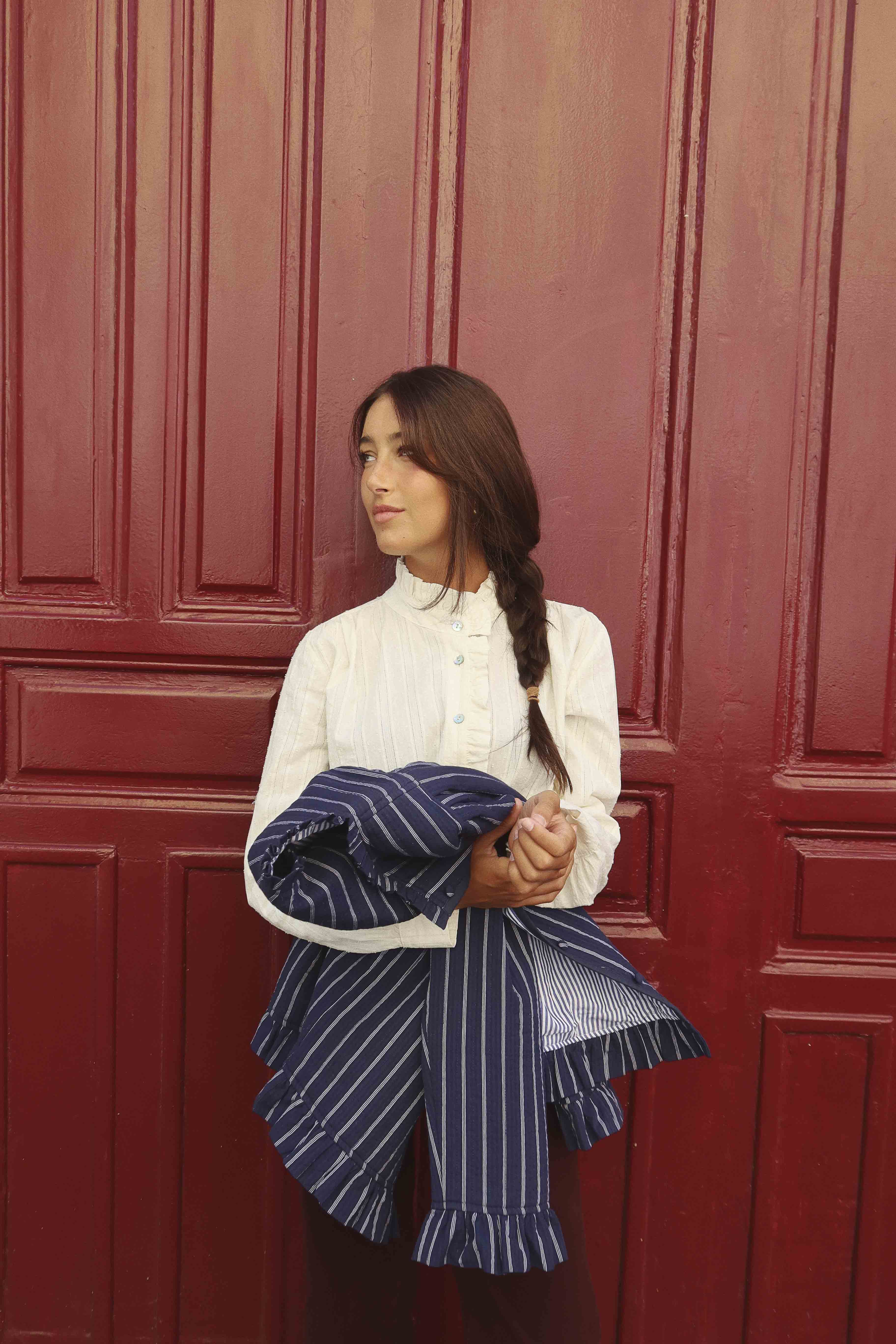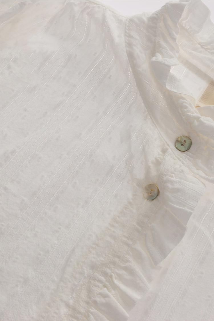 Camisa de manga larga, decorada con bordados y volantes. Cierre delantero con botones.