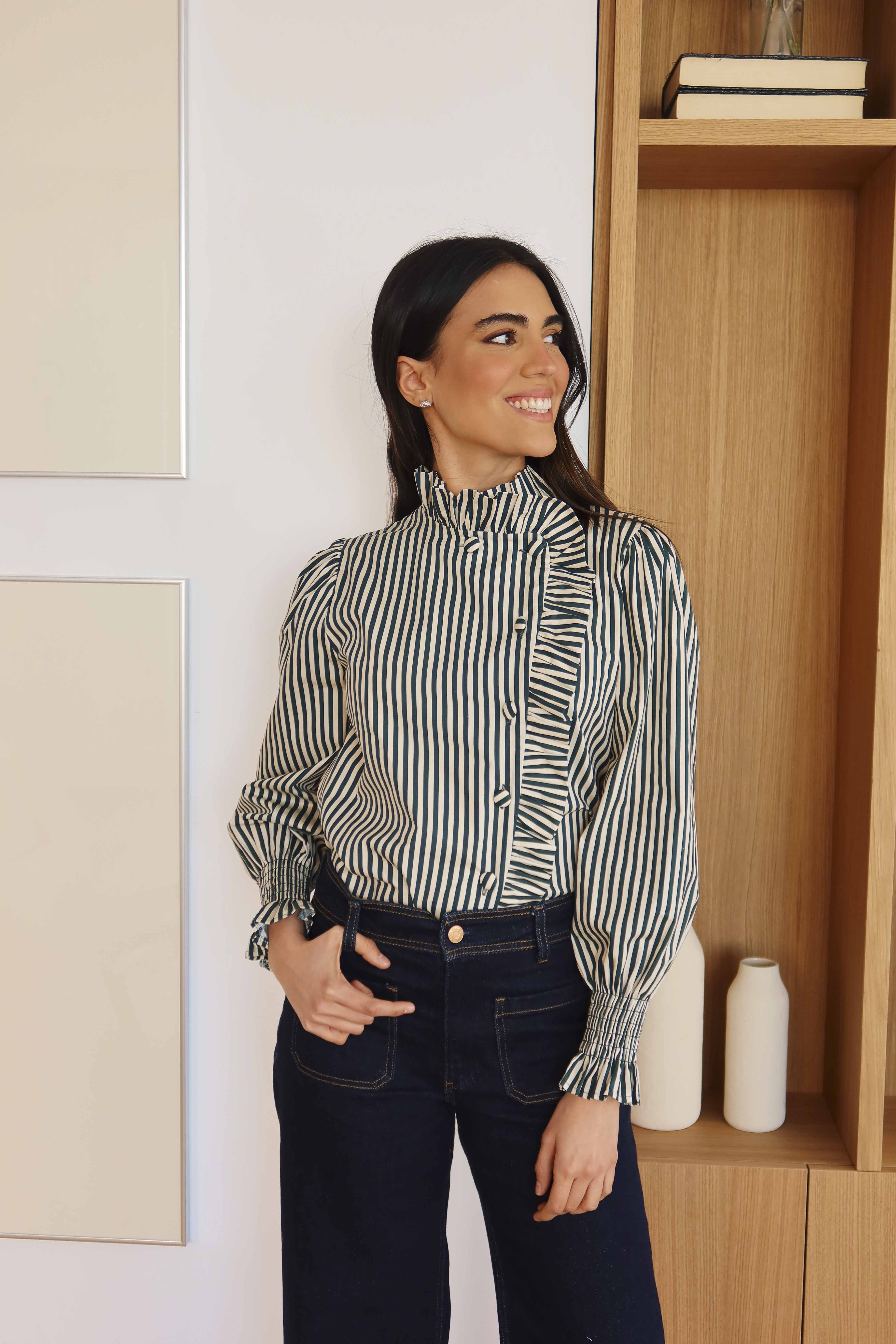 Camisa decorada con volantes, puños elásticos y cierre delantero con botones forrados.