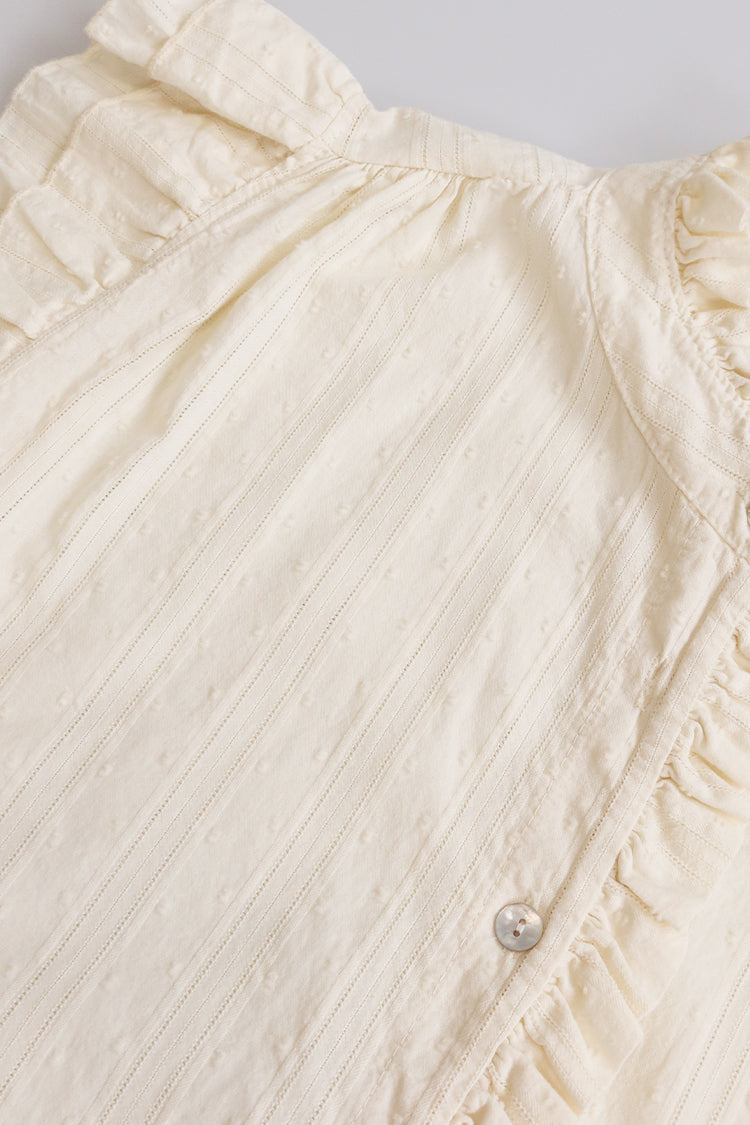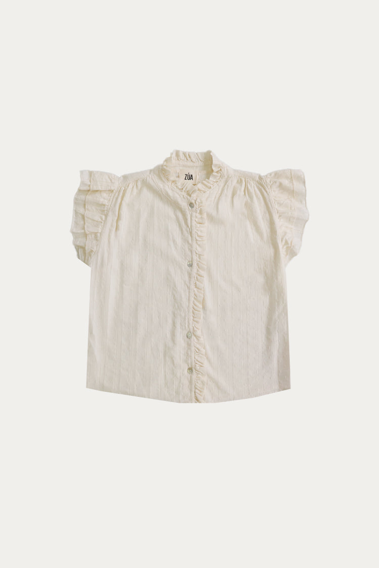 Camisa de algodón, cuello de volante. Manga corta con volante. Cierre delantero con botones.