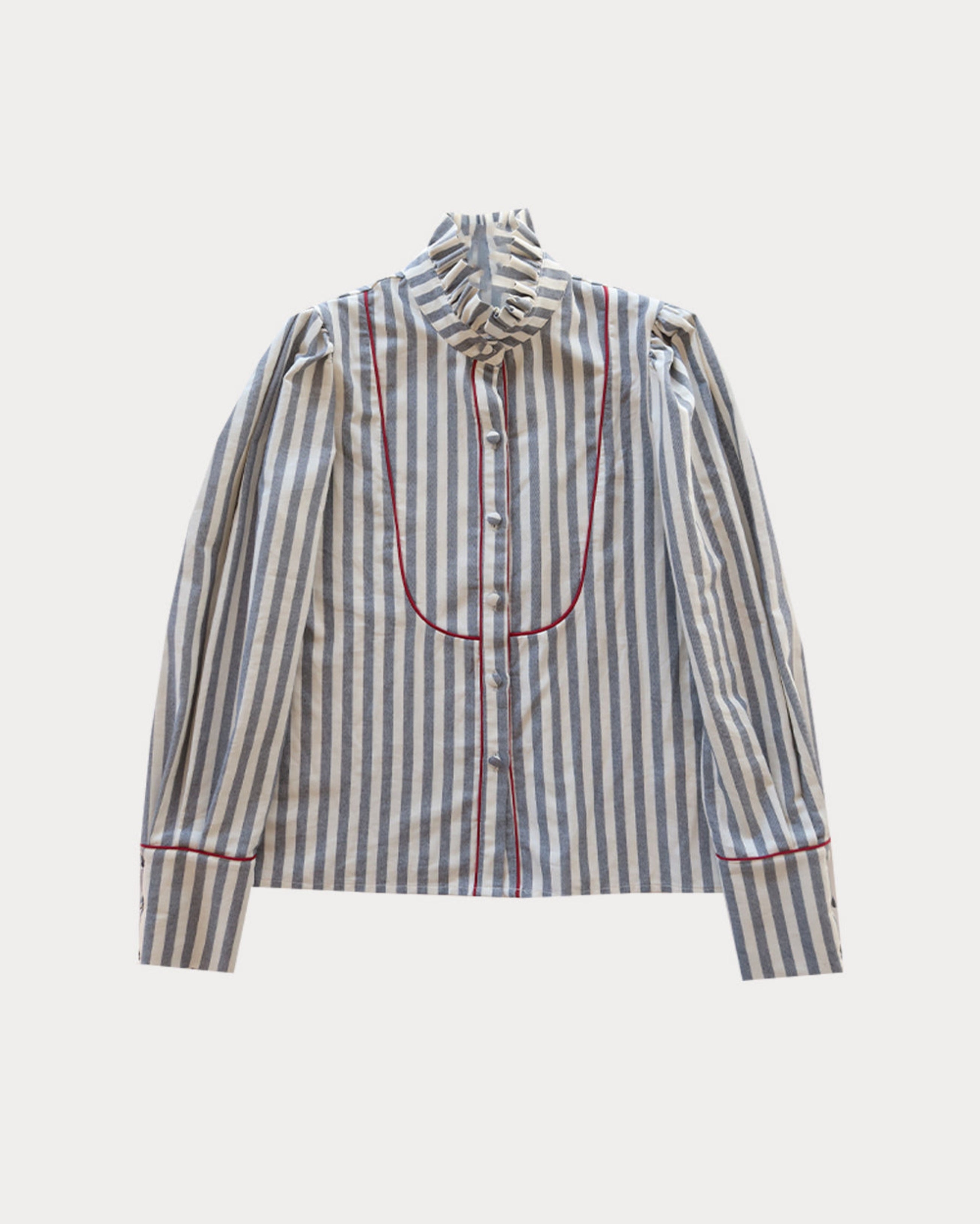 Camisa con el cuello de volante, cierre delantero con botones forrados. Puño cerrado con botones forrados.