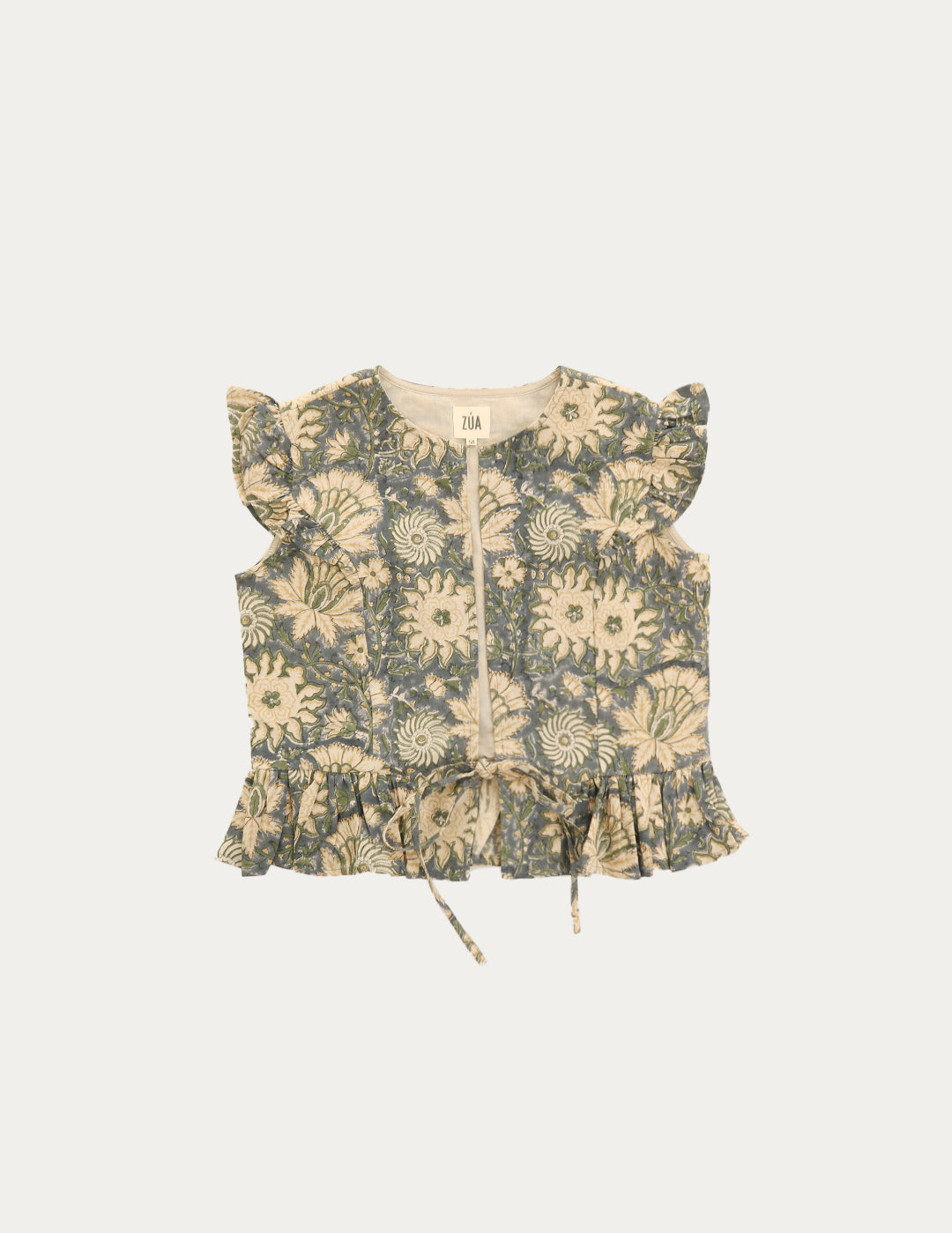 Chaleco abierto con cierre delantero de lazos, forro en su interior y detalle de volantes.