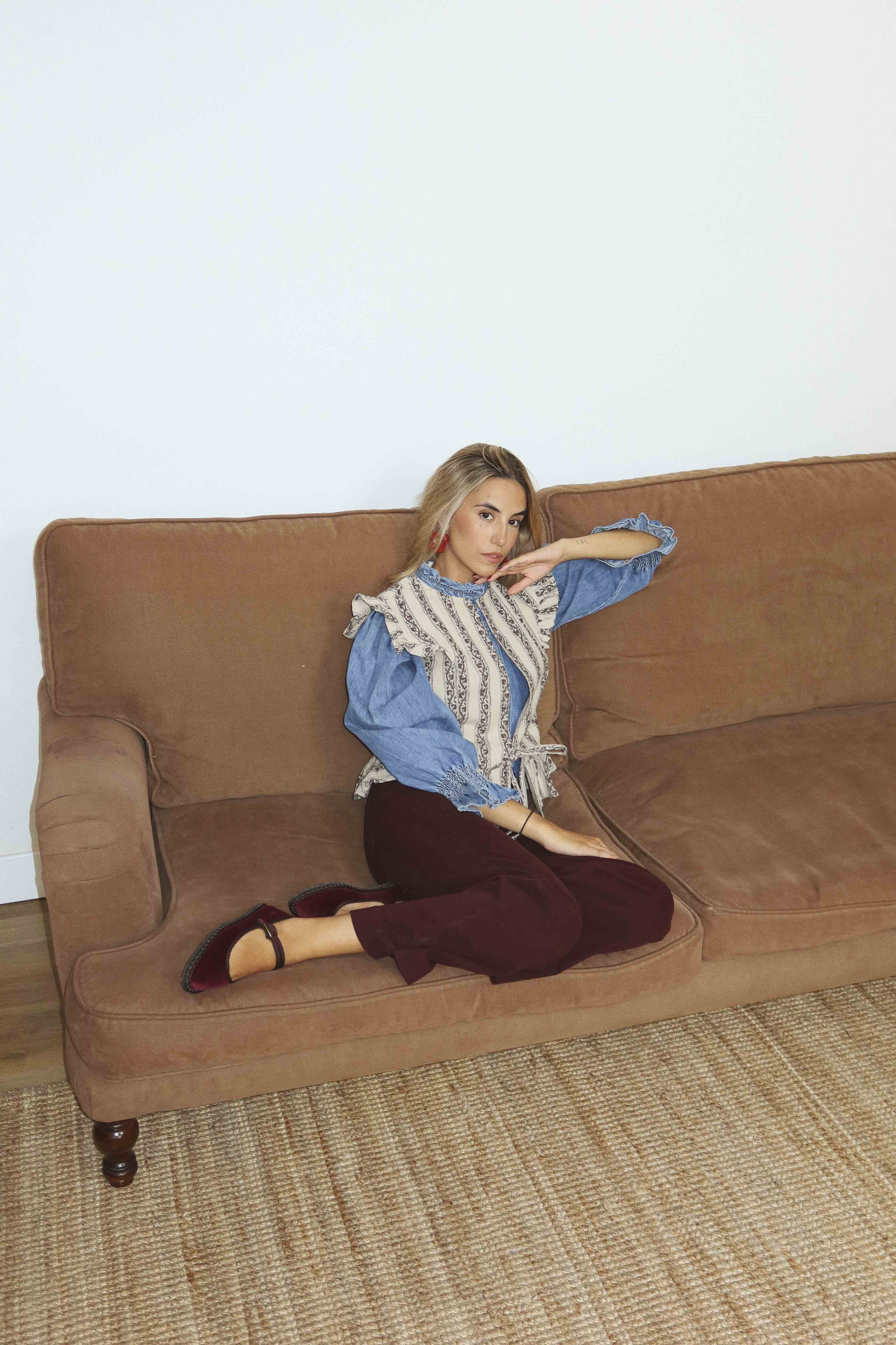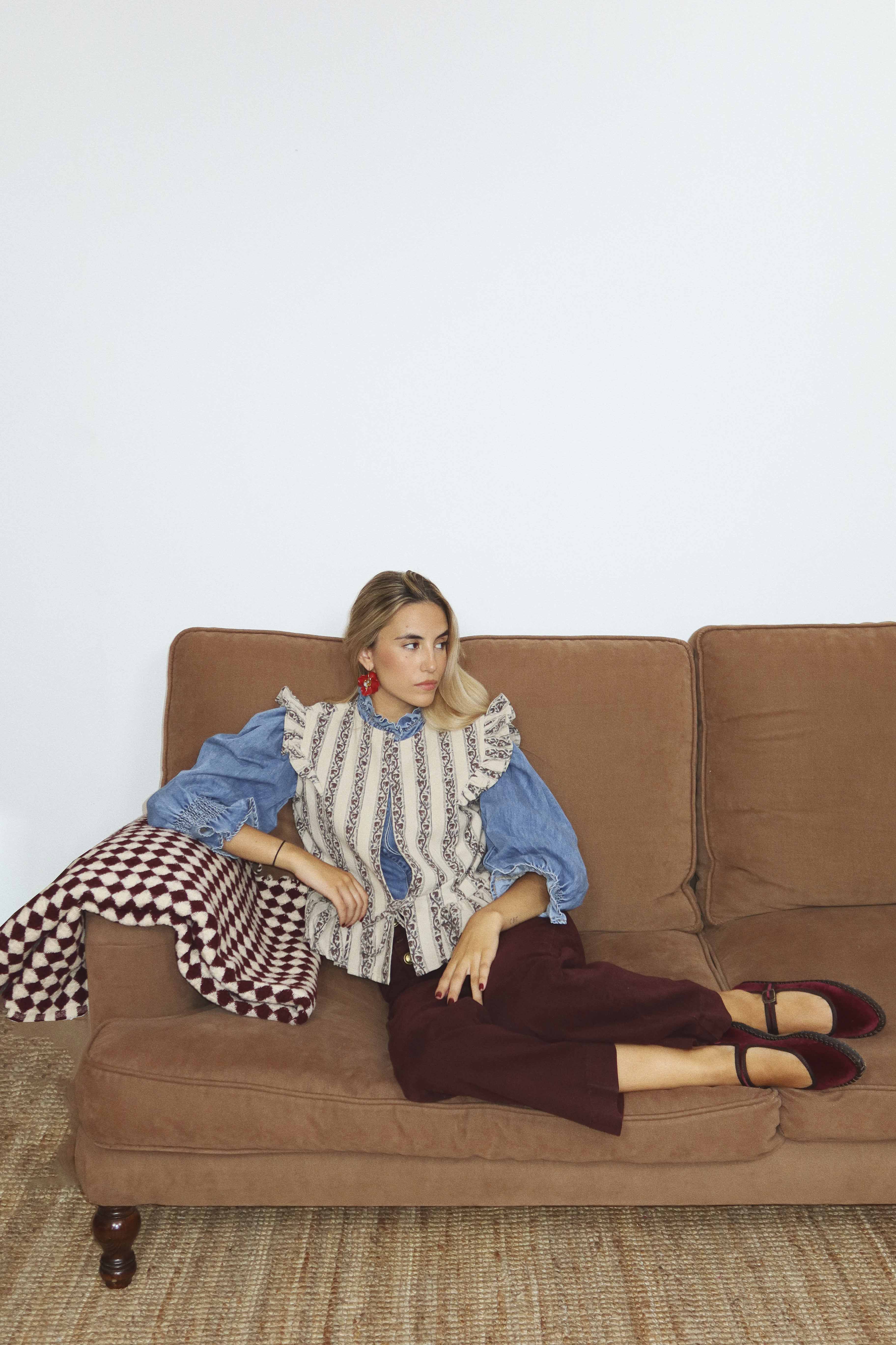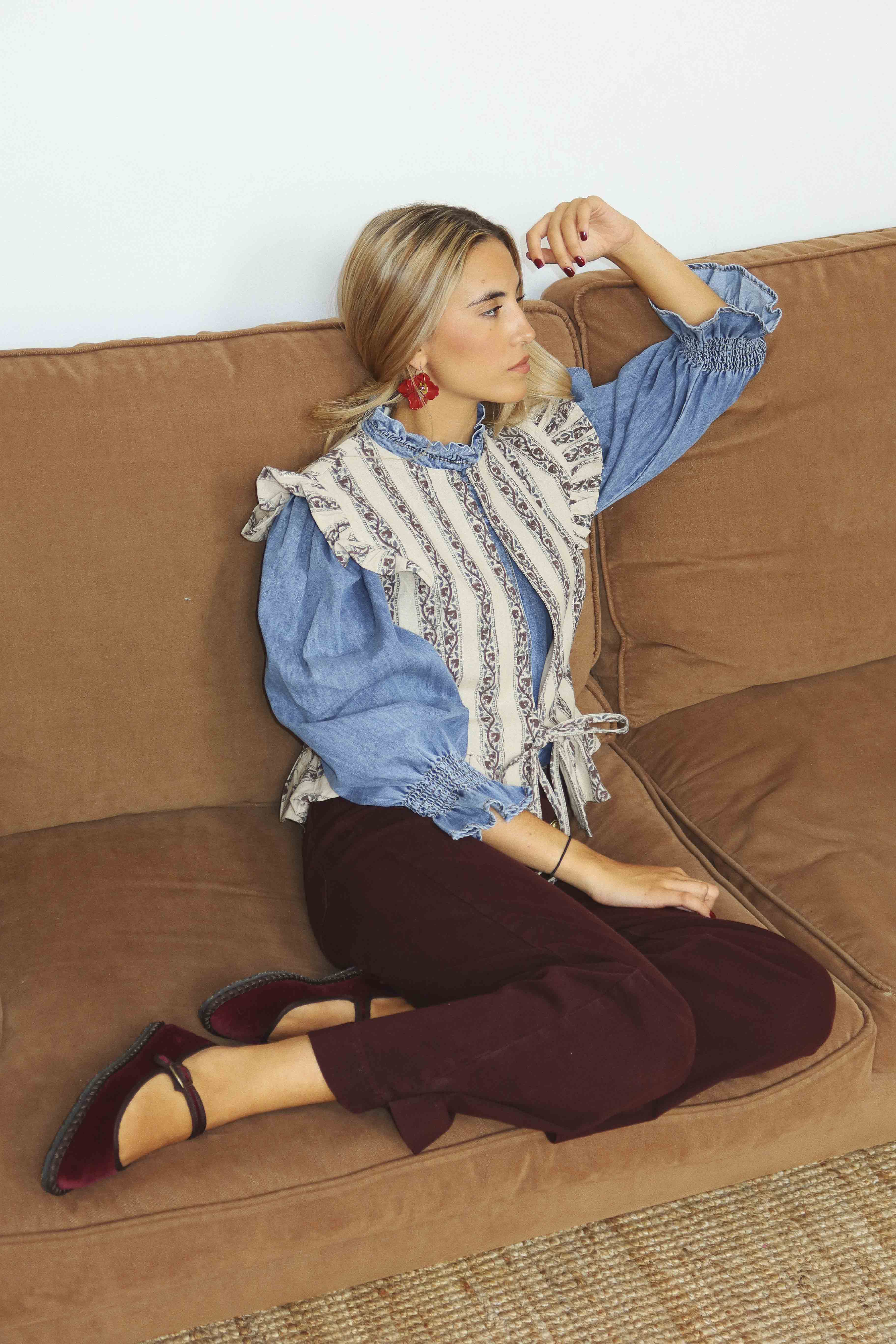 Chaleco abierto con cierre delantero de lazos, forro en su interior y detalle de volantes.