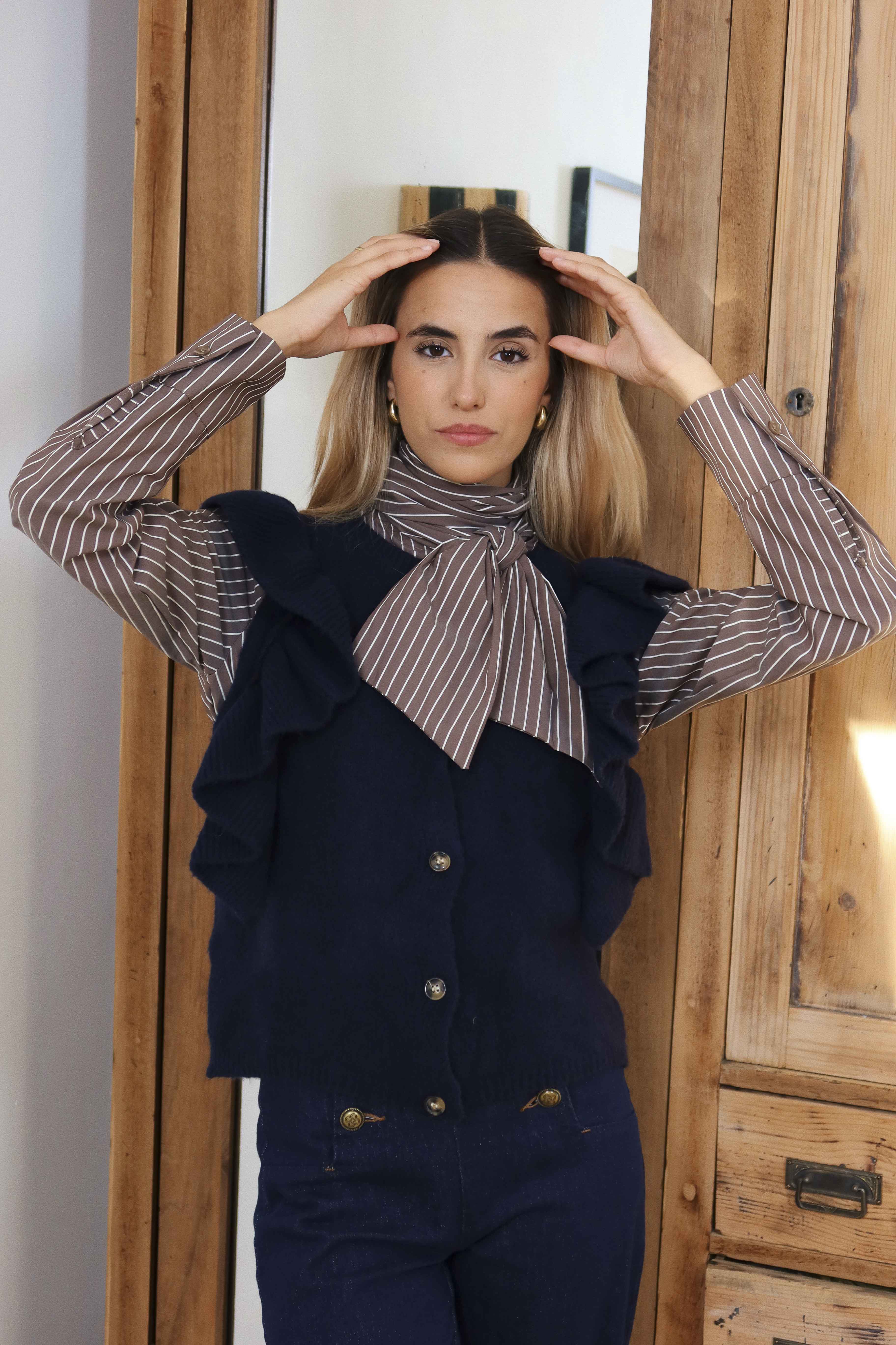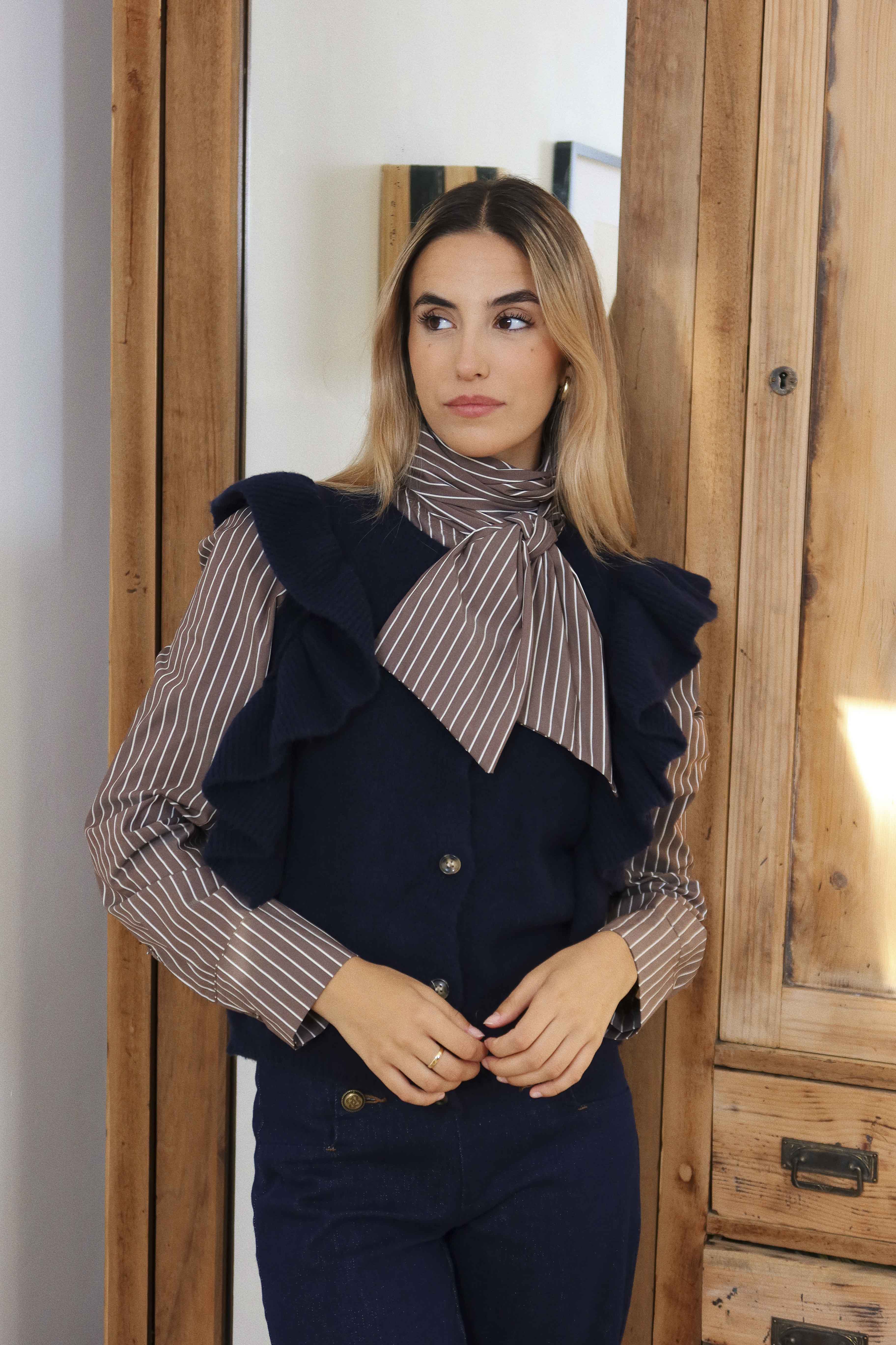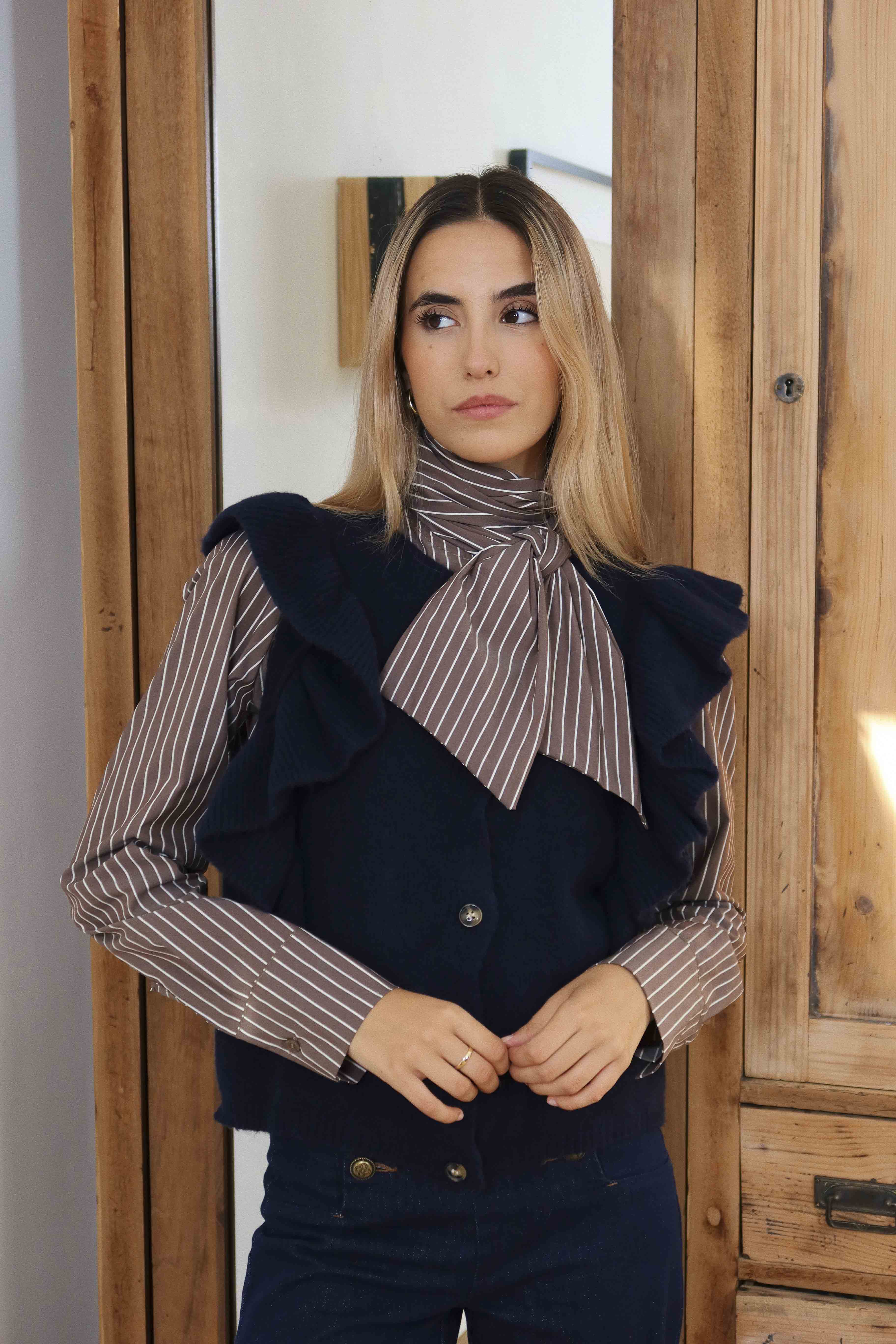Chaleco de punto, cierre delantero con botones, cuello redondo y detalles de volantes.