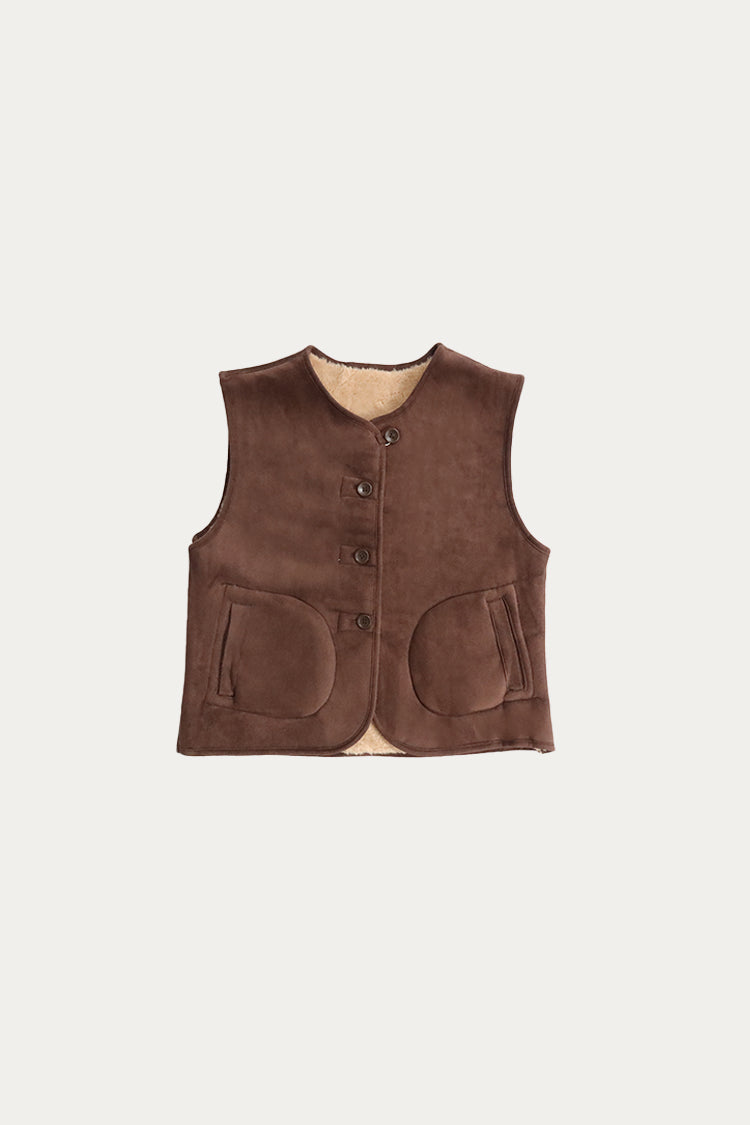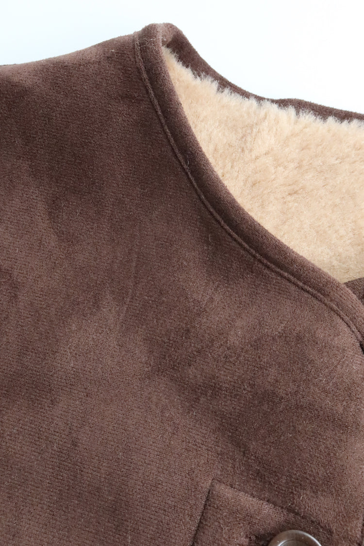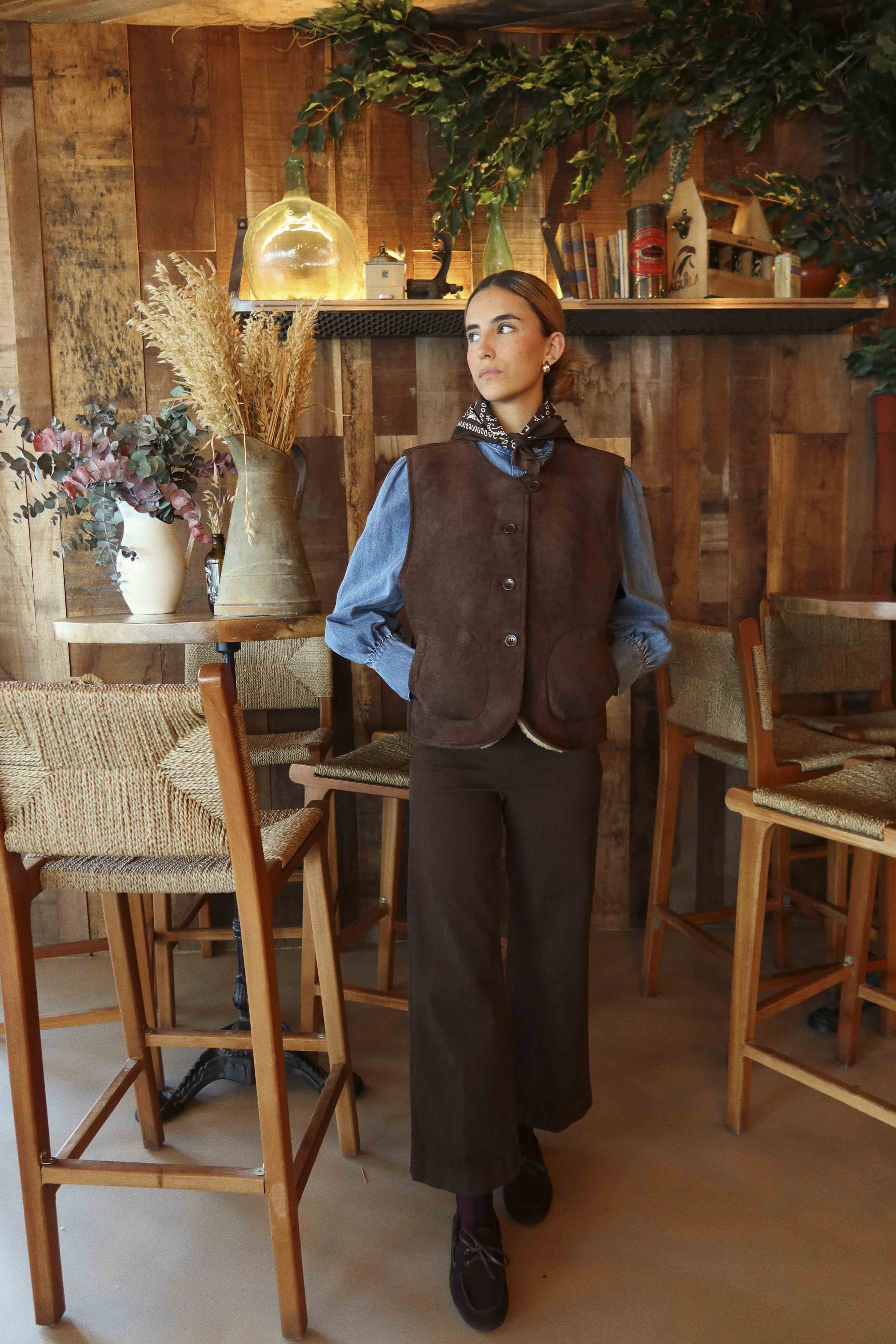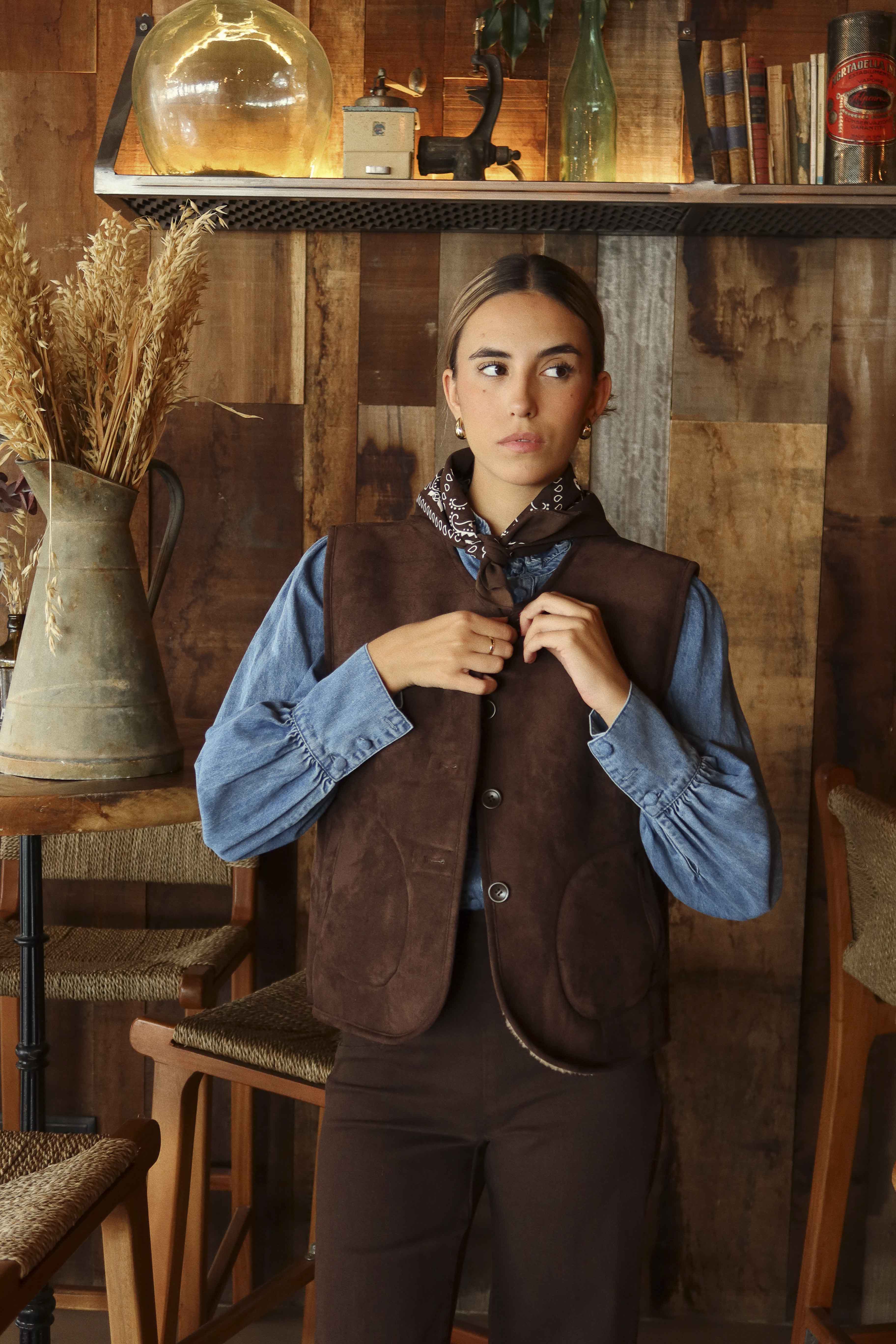 Chaleco con cuello redondo, cierre delantero con botones, forro en su interior.