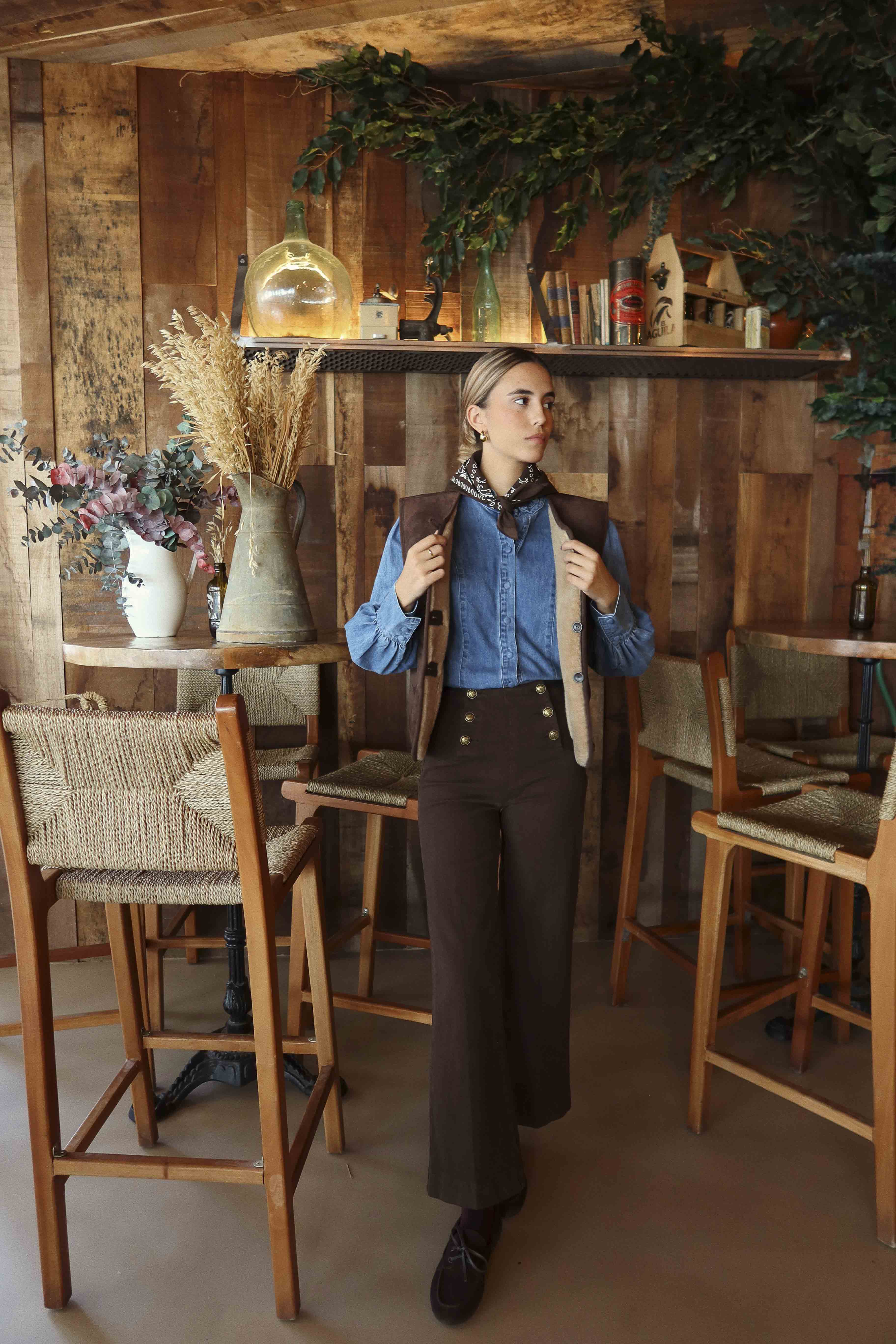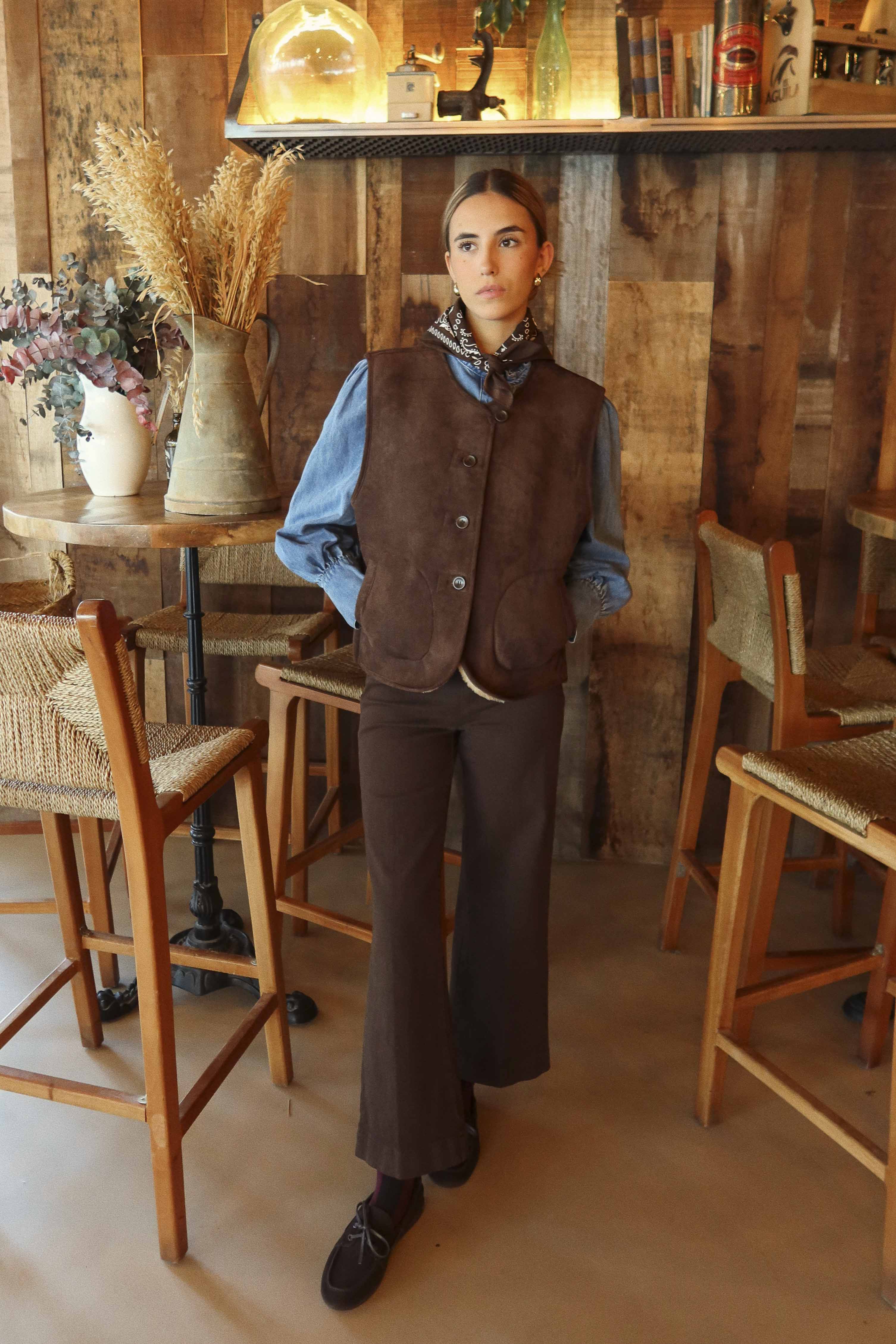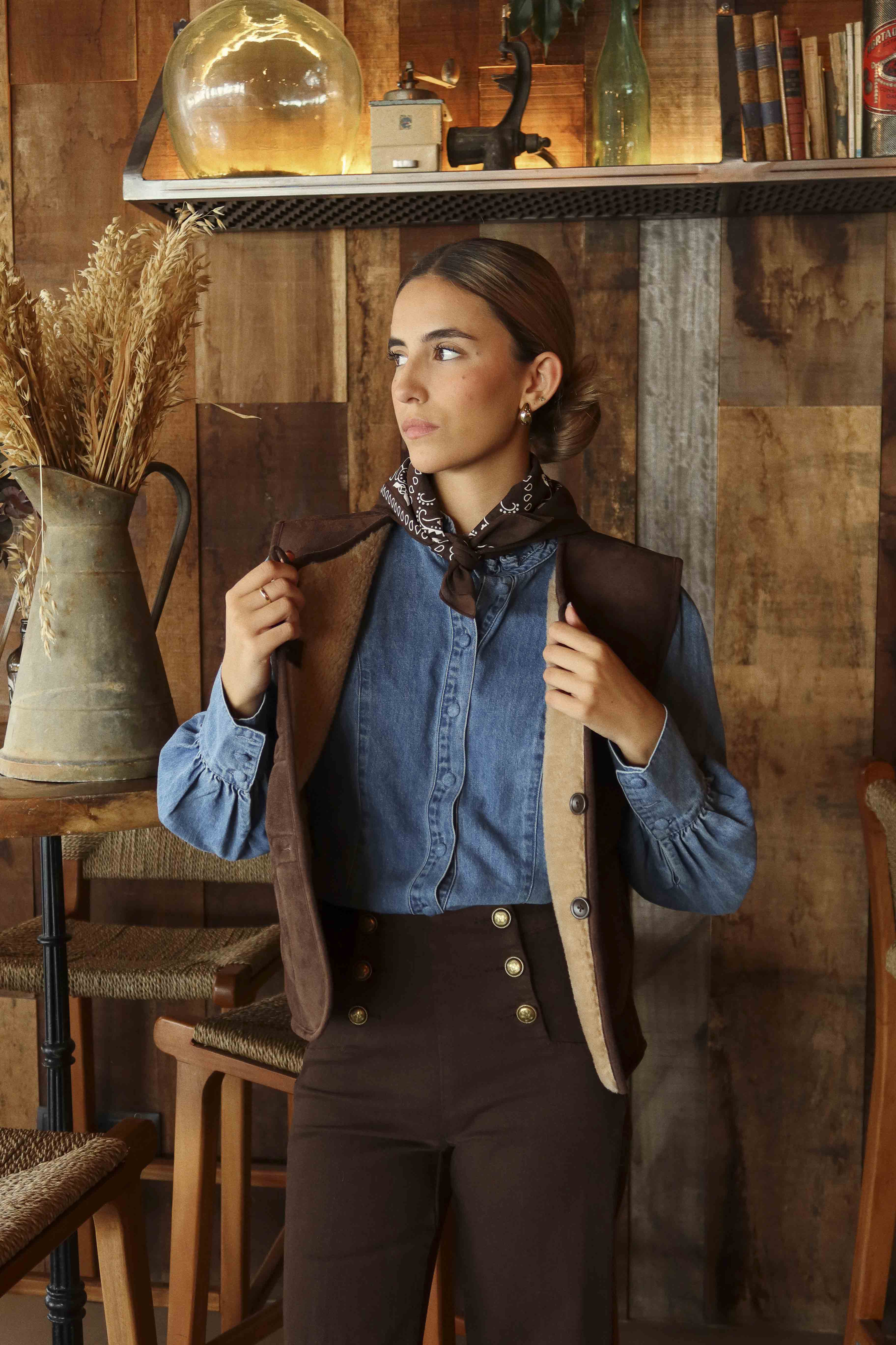 Chaleco con cuello redondo, cierre delantero con botones, forro en su interior.