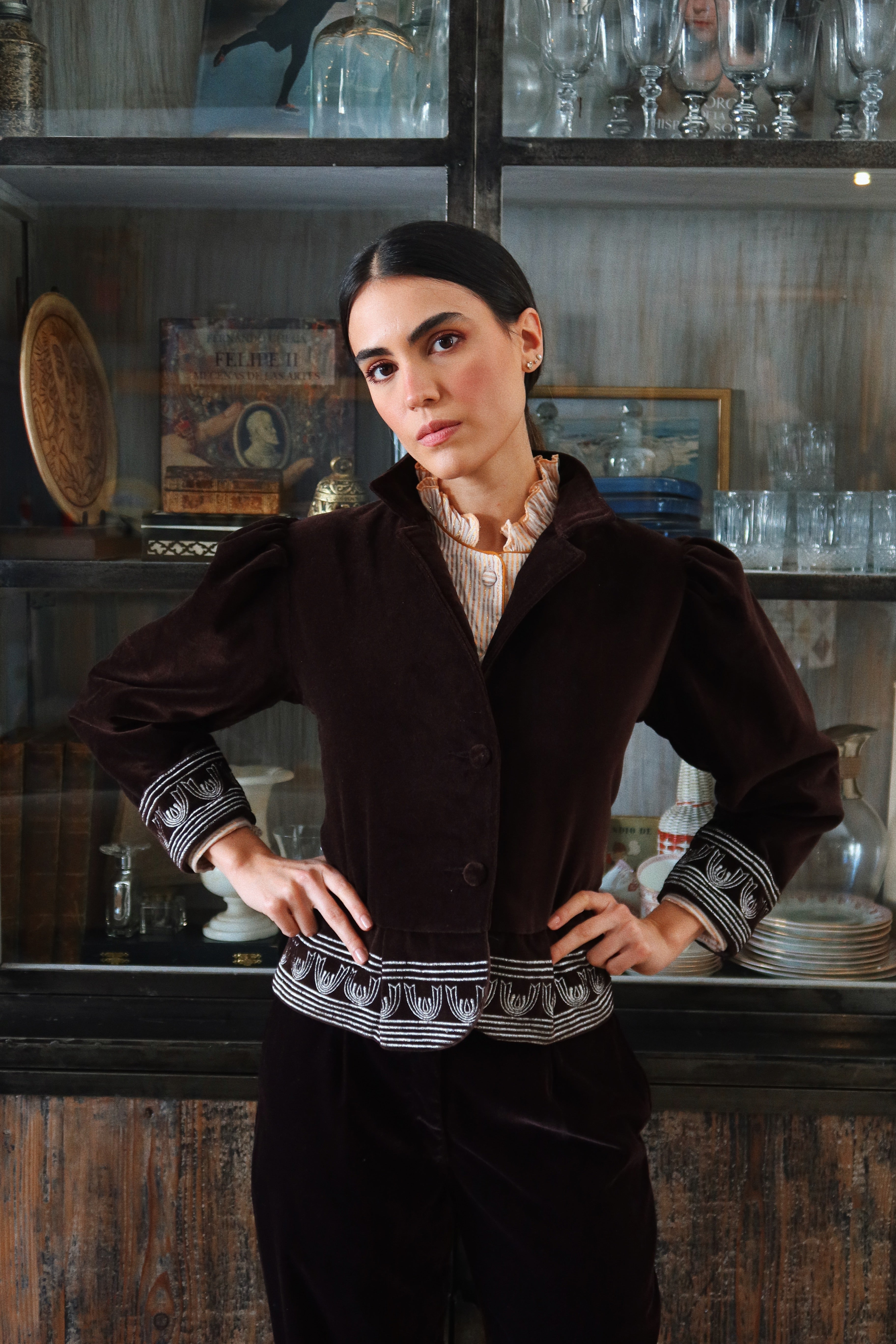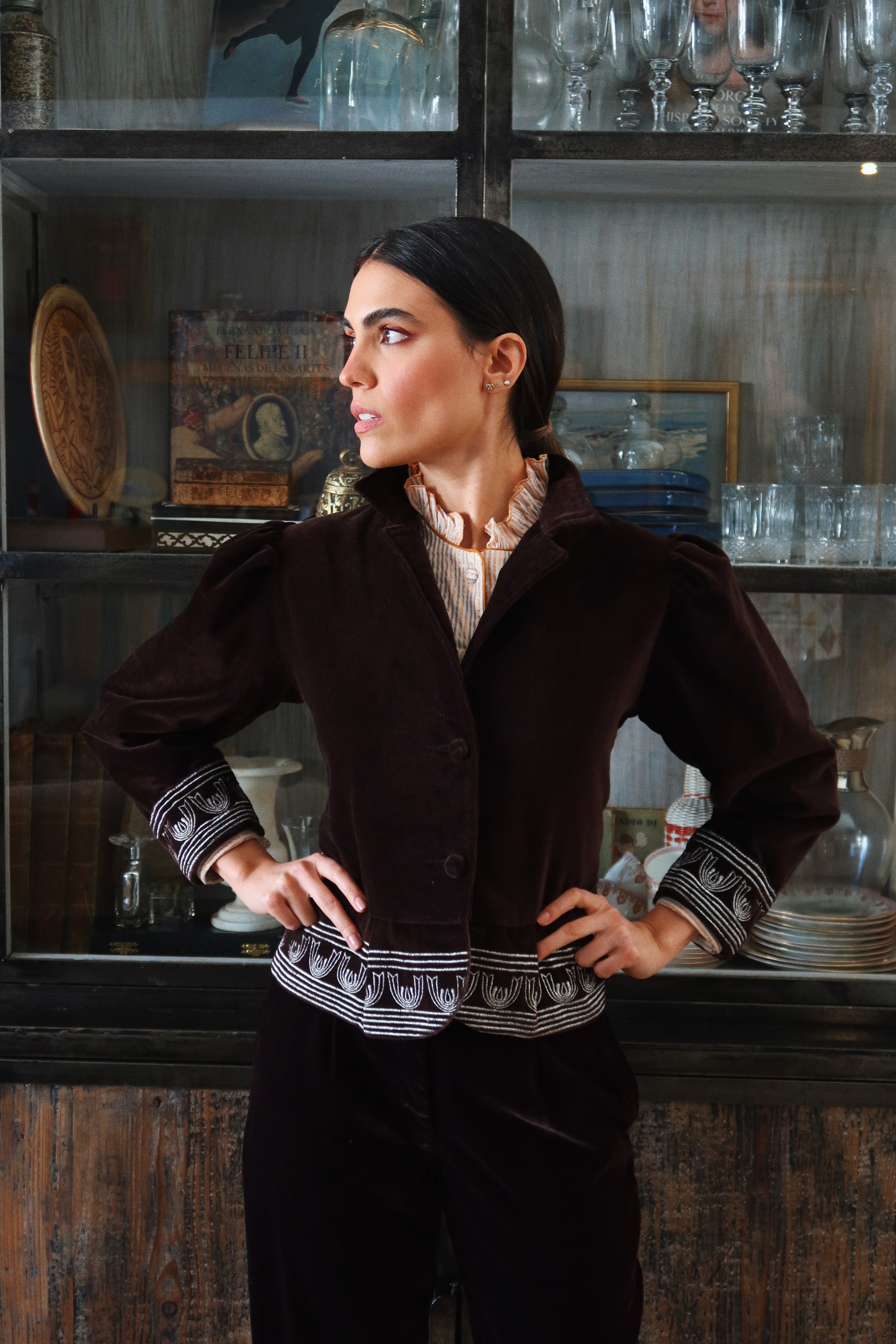 Chaqueta de terciopelo de seda decorada con bordados. Forro en su interior. Cierre delantero con botones forrados.