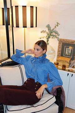 Chaqueta de manga larga abullonada, cuello redondo, cierre delantero con botones forrados. Forro en su interior. Puño sencillo cierre con botón forrado.
