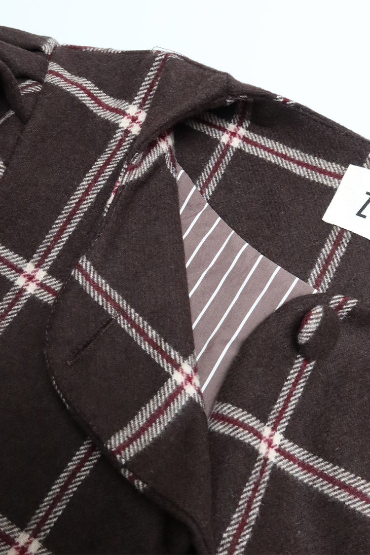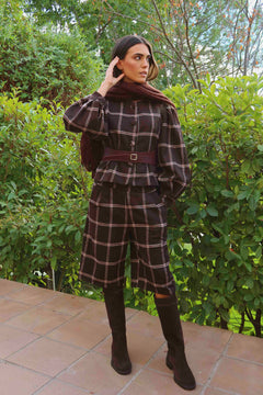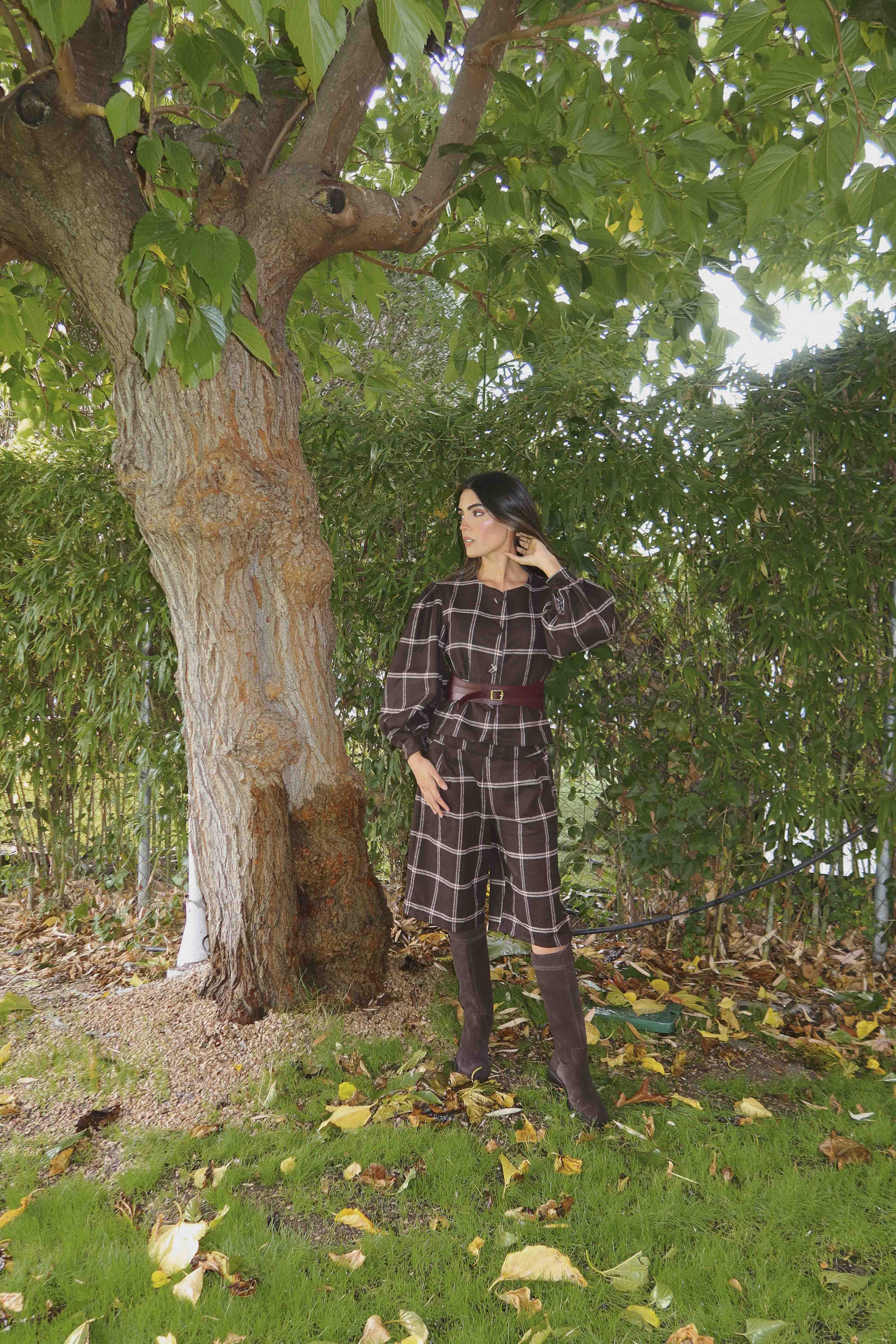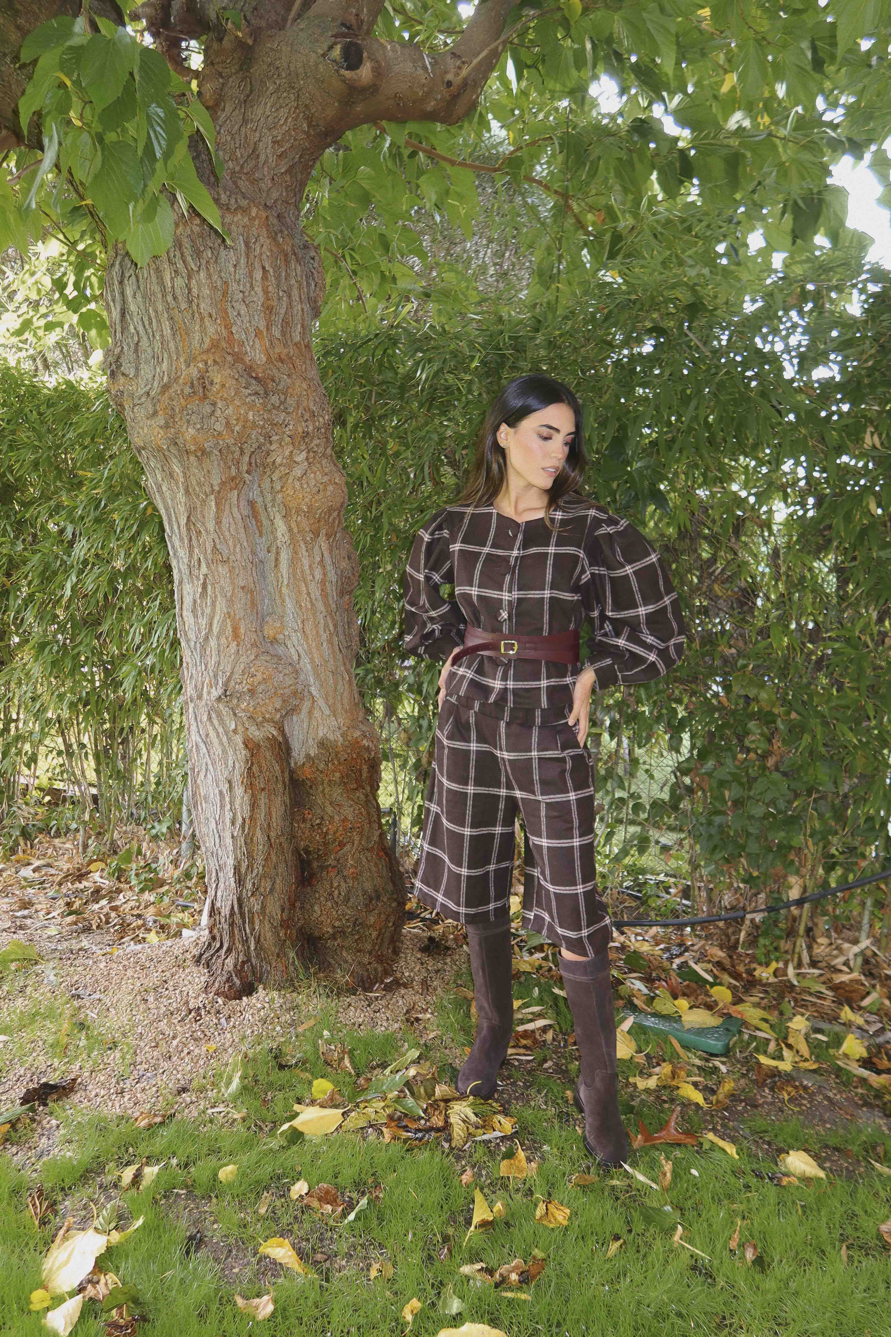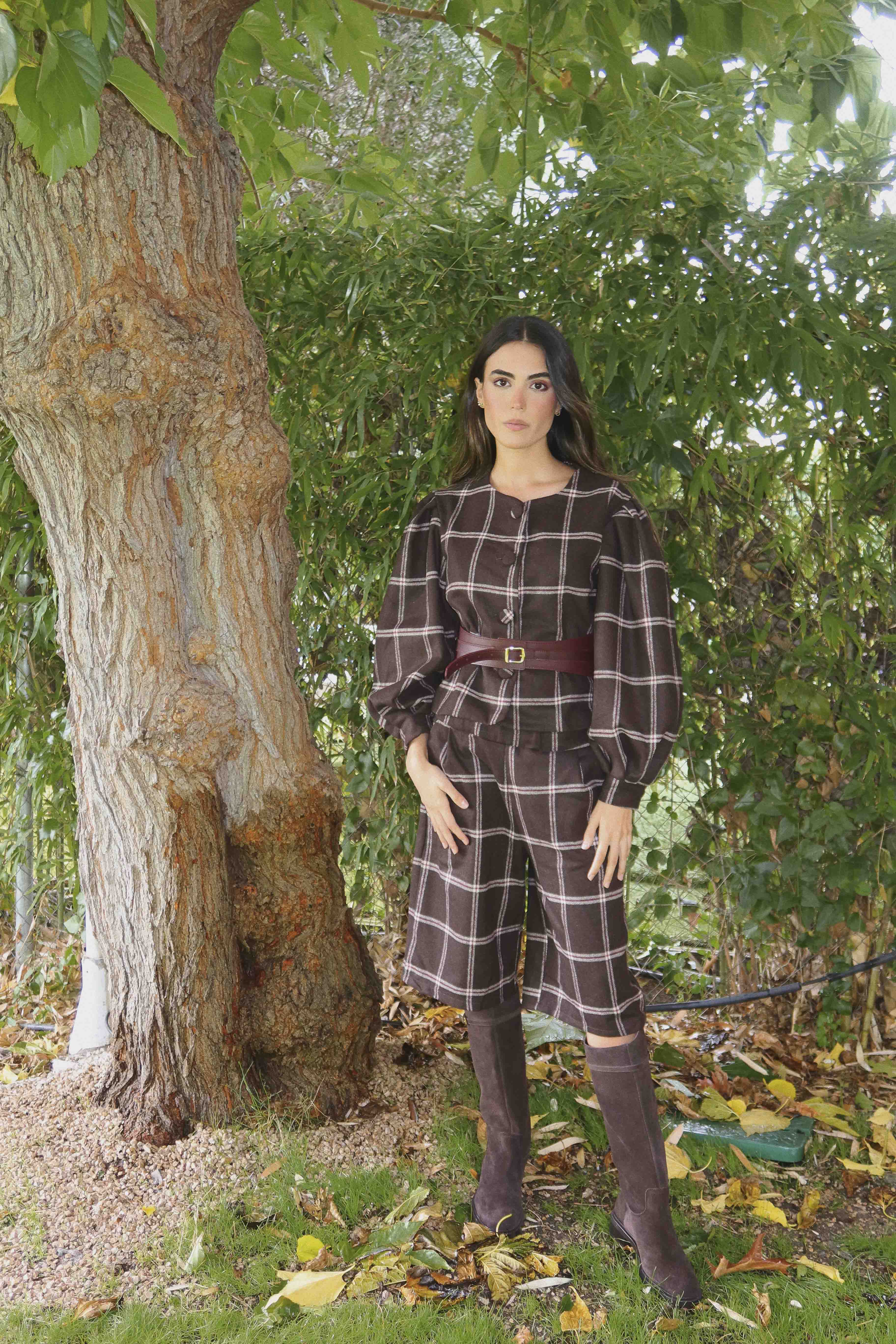 Chaqueta de manga larga abullonada, cuello redondo, cierre delantero con botones forrados. Forro en su interior. Puño sencillo cierre con botón forrado.