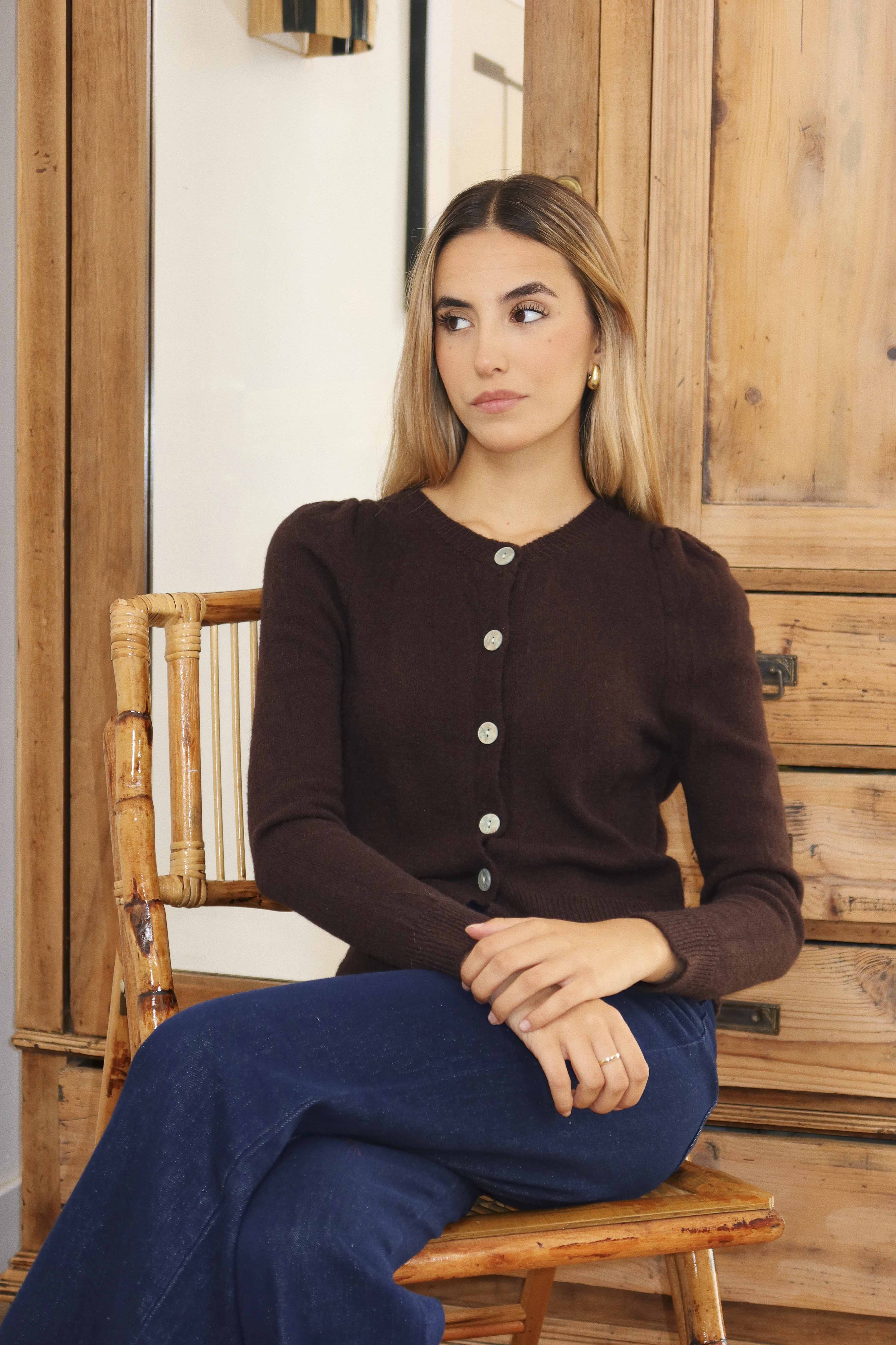 Chaqueta de manga larga de punto con cuello redondo, cierre con botones delanteros.