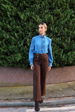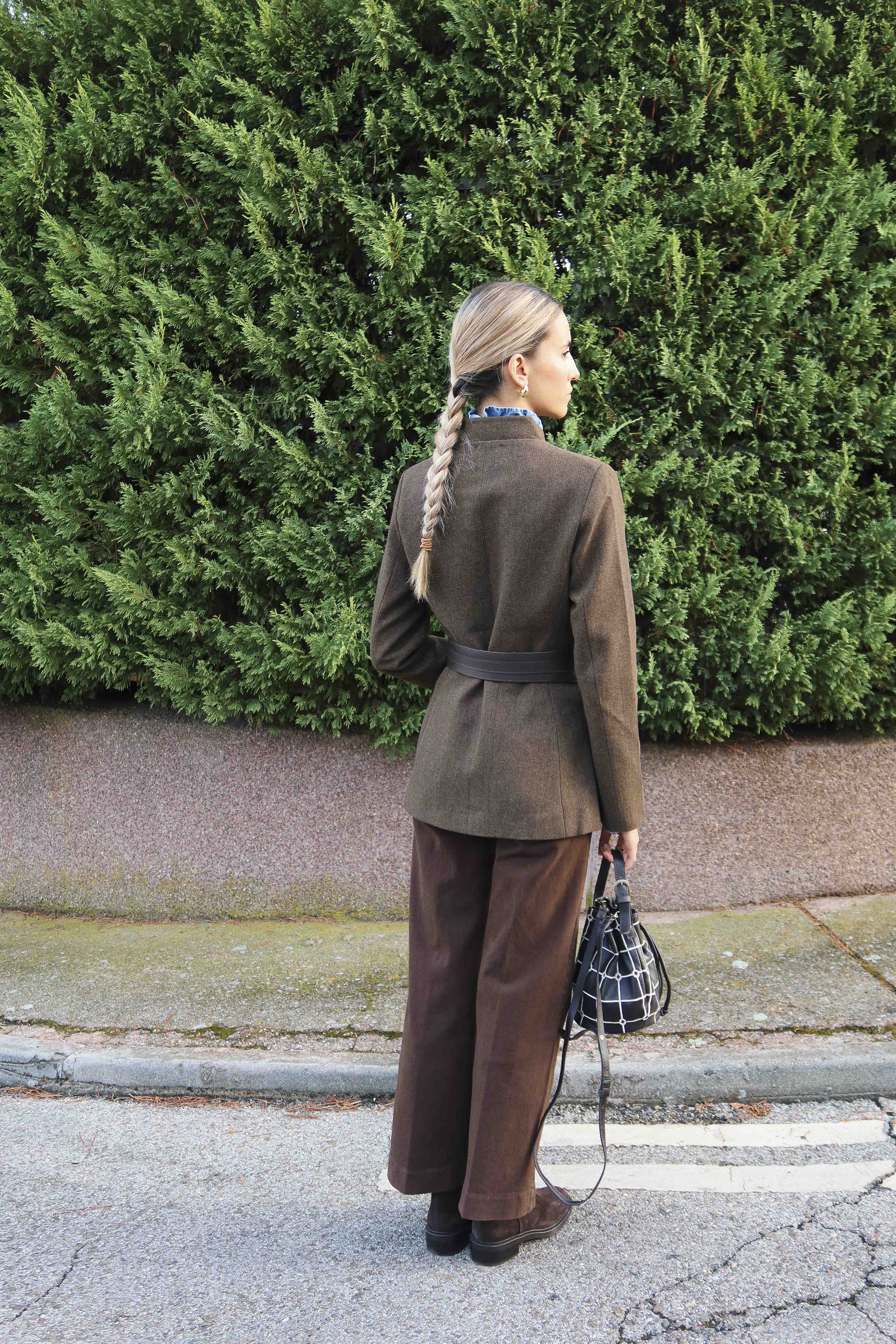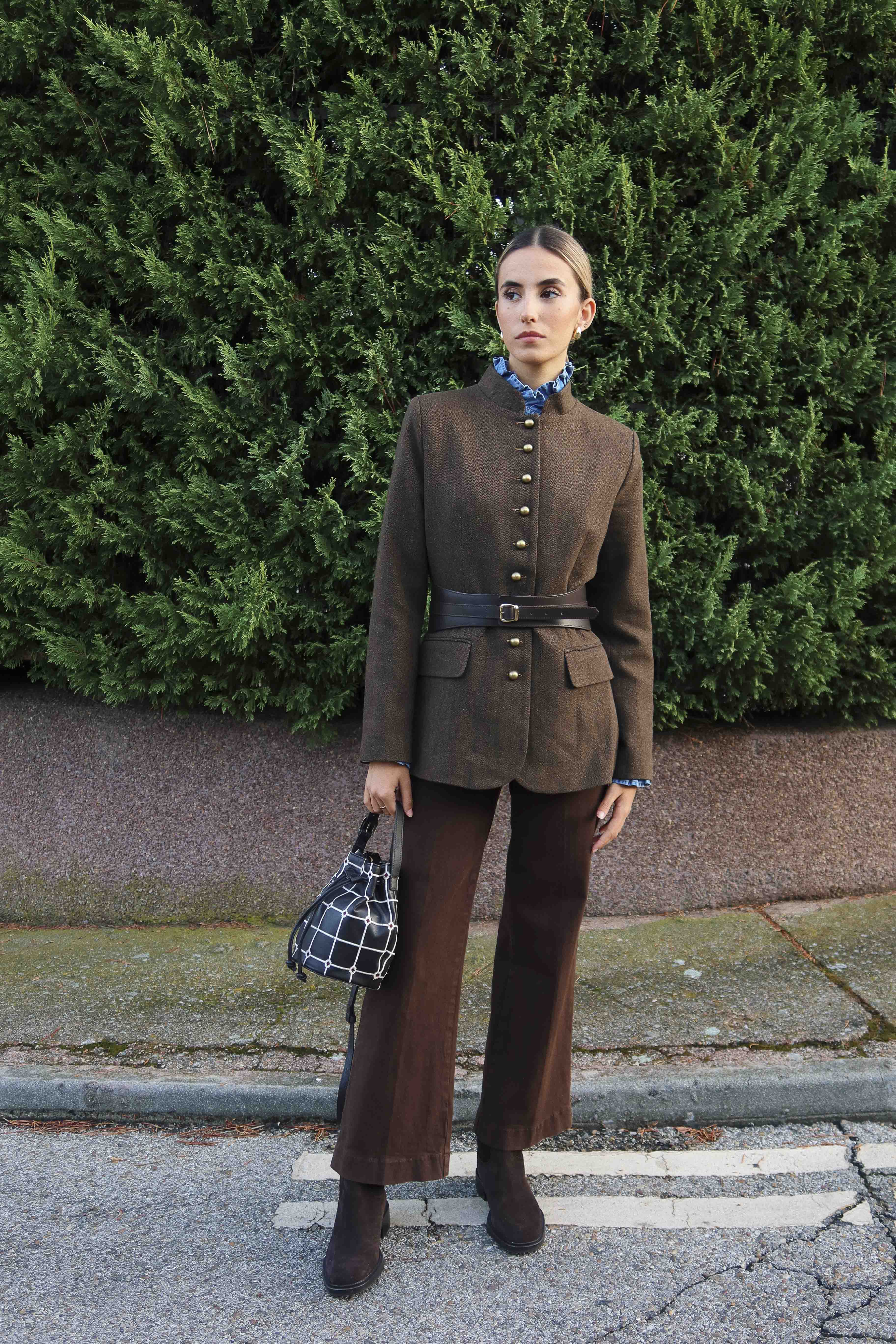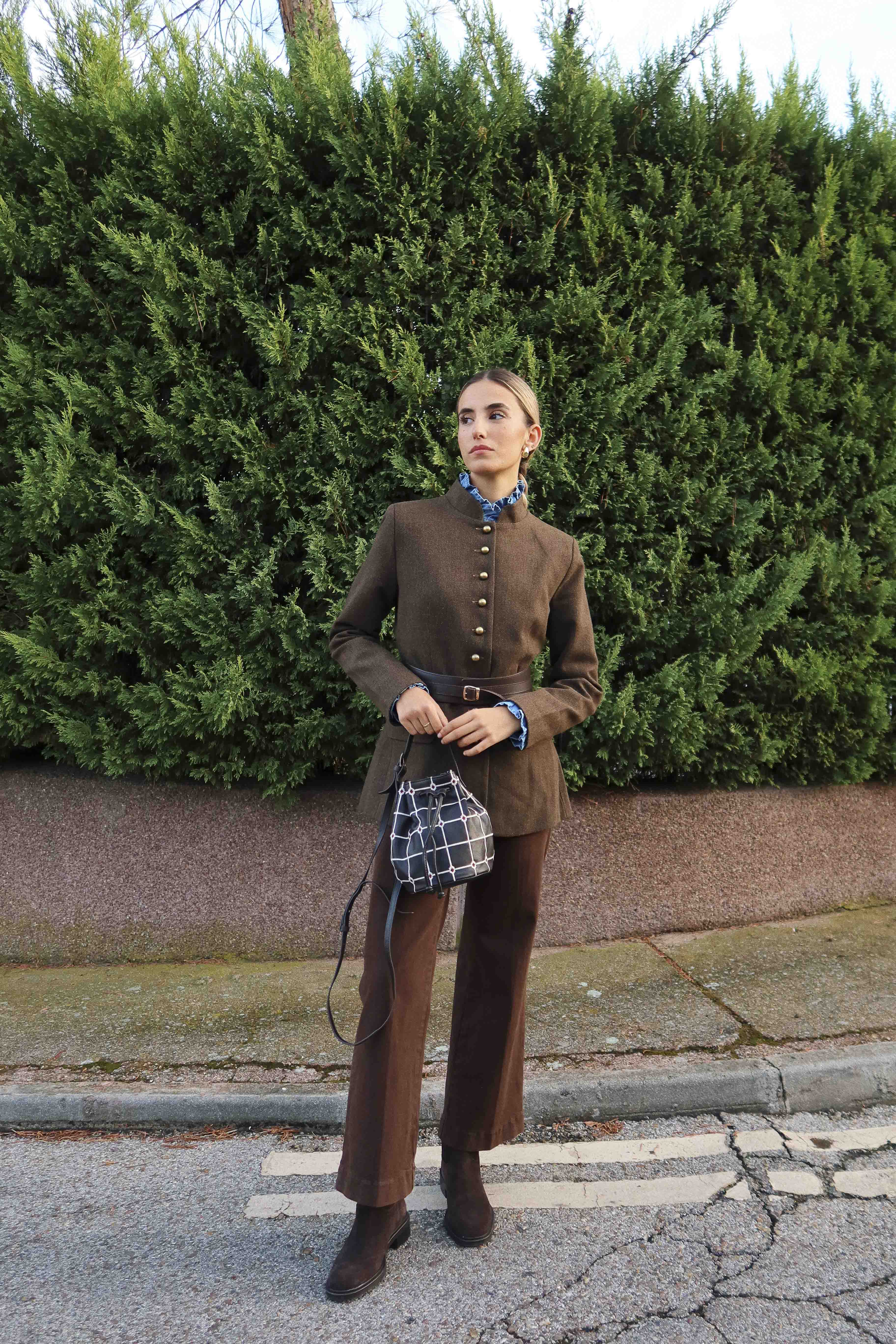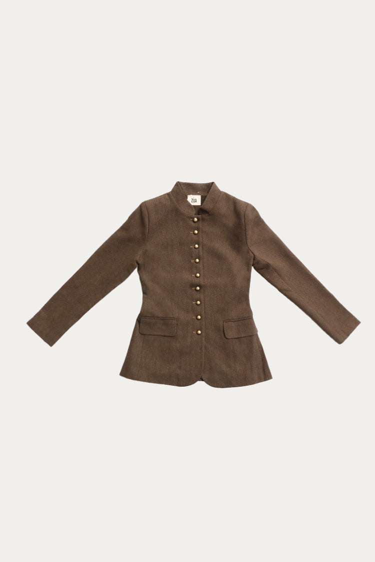 Chaqueta entallada en tono marrón topo, presenta cuello mao y cierre frontal con botones dorados metálicos, cuenta con falsos bolsillos delanteros con solapa.