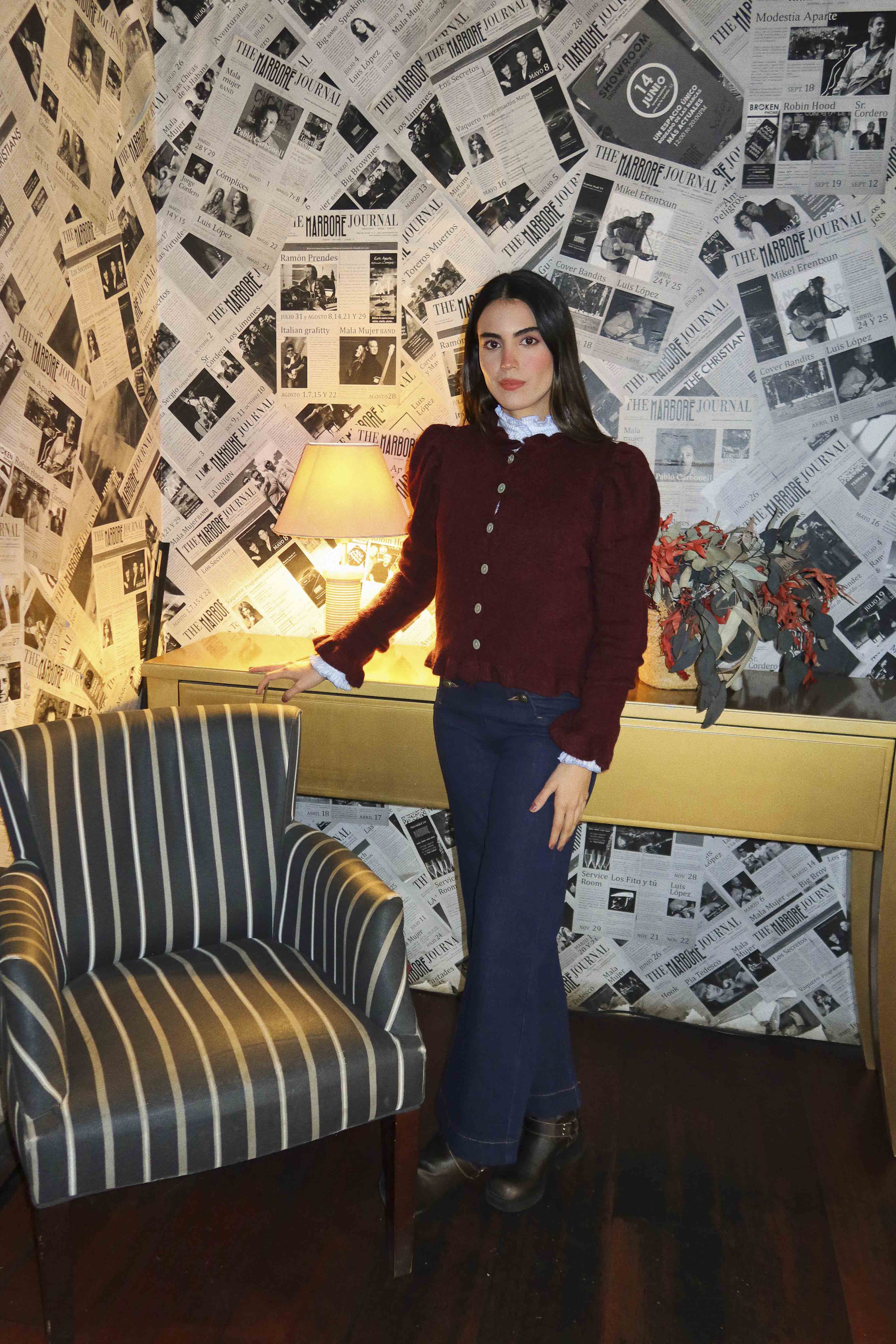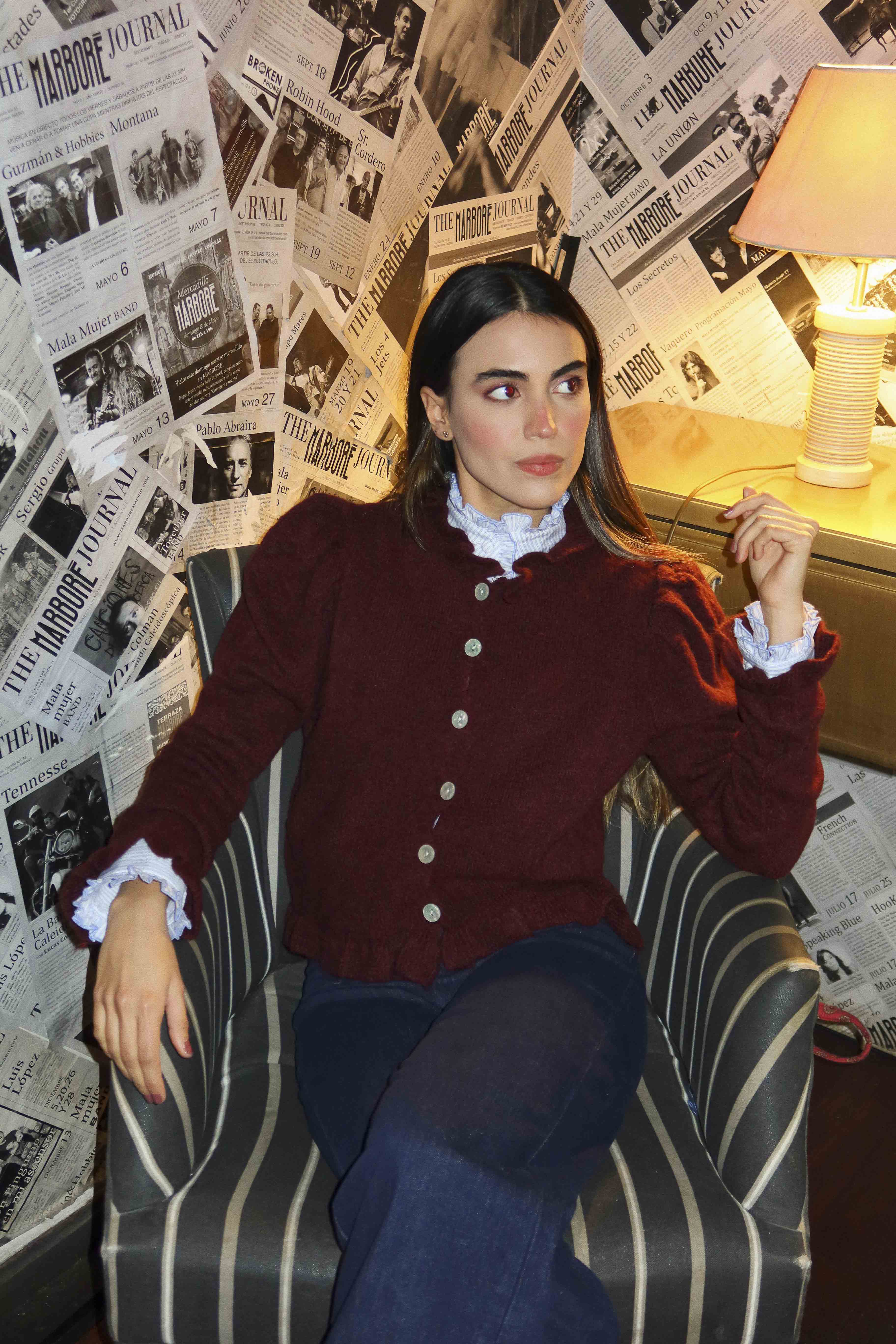 Chaqueta de punto, decorada con volantes en el cuello y puños. Cierre delantero con botones.