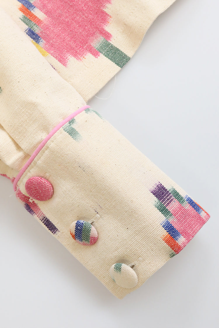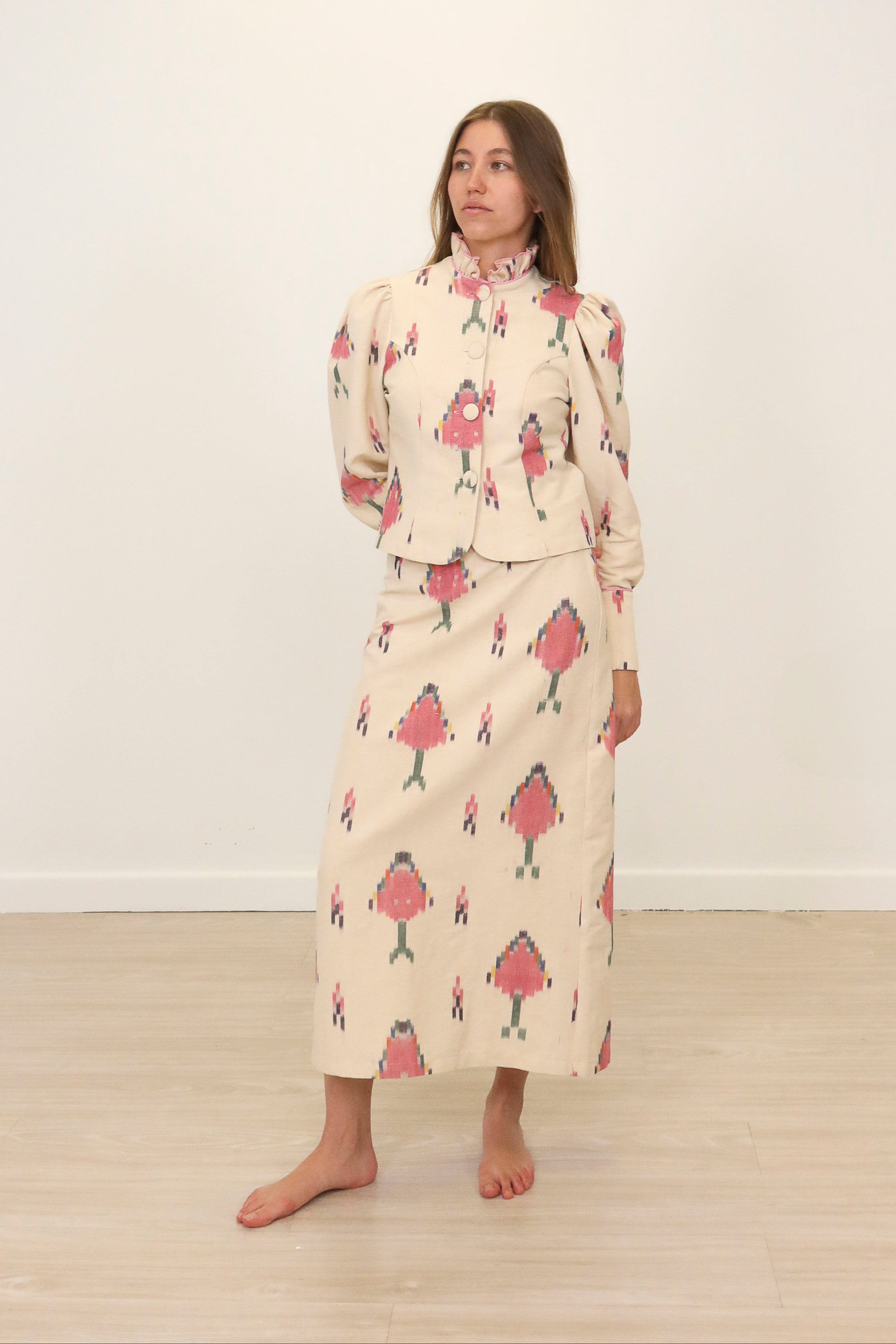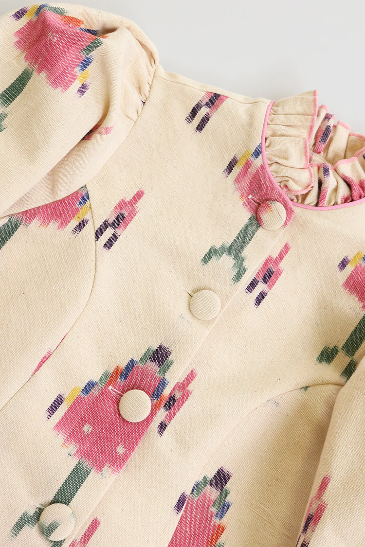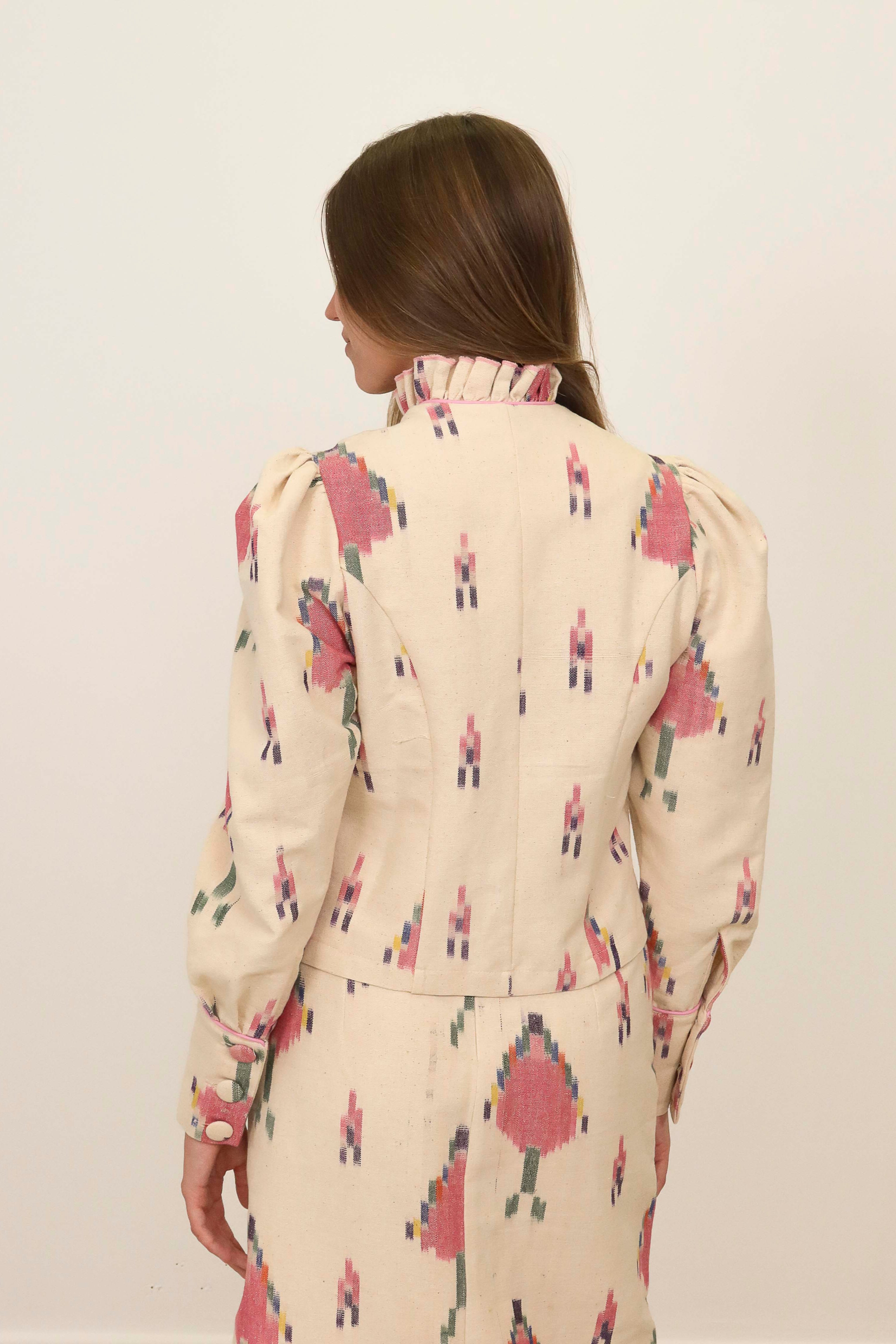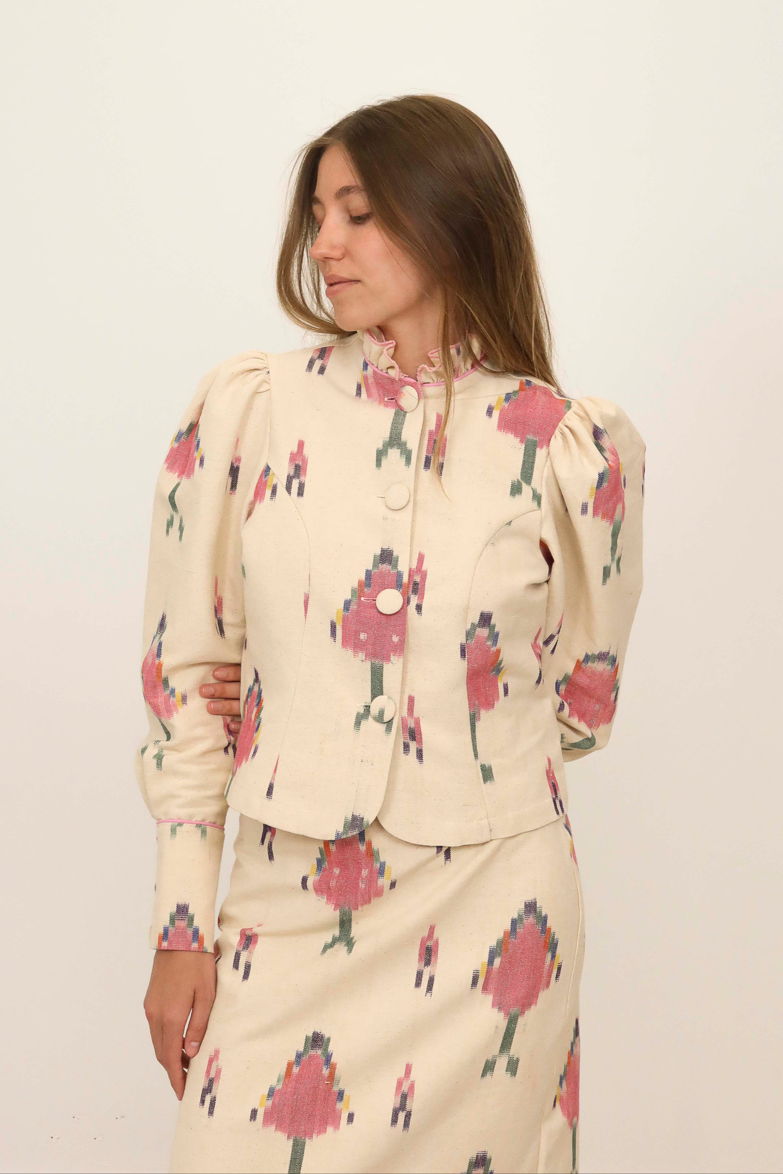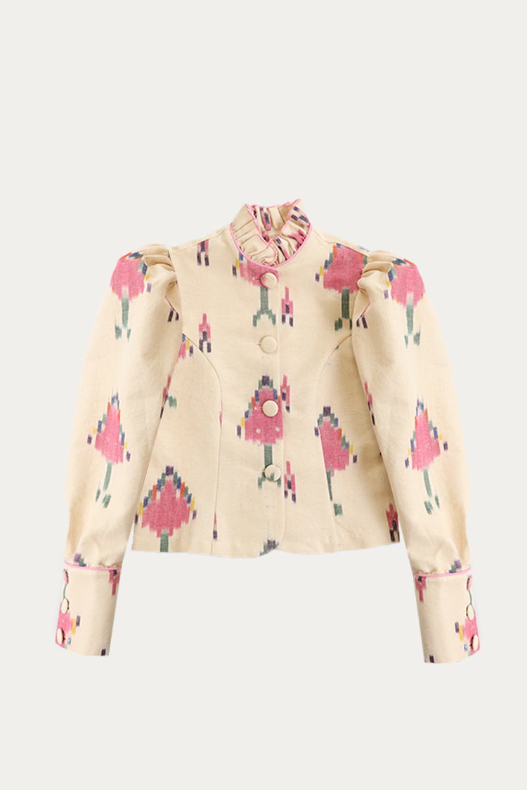 Chaqueta con cuello alto de volantes, cierre delantero con botones forrados. Manga abullonada, puños con cierre de botones forrados.